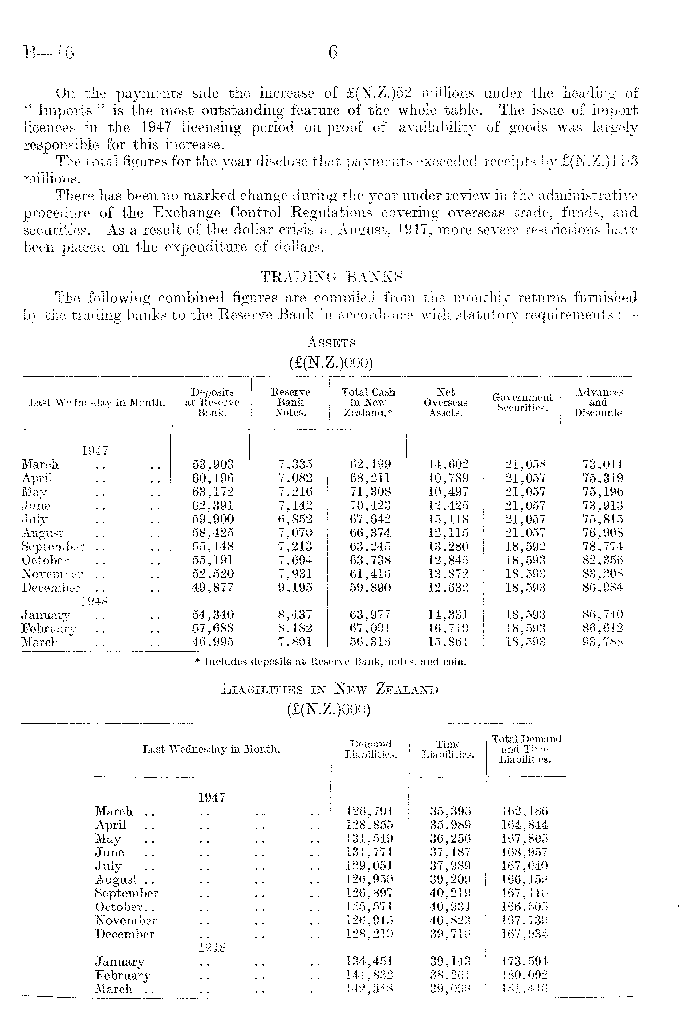 On the payments side the increase of £(N.Z.)52 millions under the heading of " Imports "is the most outstanding feature of the whole table. The issue of import licences in the 1947 licensing period on proof of availability of goods was largely responsible for this increase. The total figures for the year disclose that payments exceeded receipts by £(N.Z.)I4-3 millions. There has been no'marked change during the year under review in the administrative procedure of the Exchange Control Regulations covering overseas trade, funds, and securities. As a result of the dollar crisis in August, 1947, more severe restrictions have been placed on the expenditure of dollars. TRADING BANKS The following combined figures are compiled from the monthly returns furnished by the trading banks to the Reserve Bank in accordance with statutory requirements :