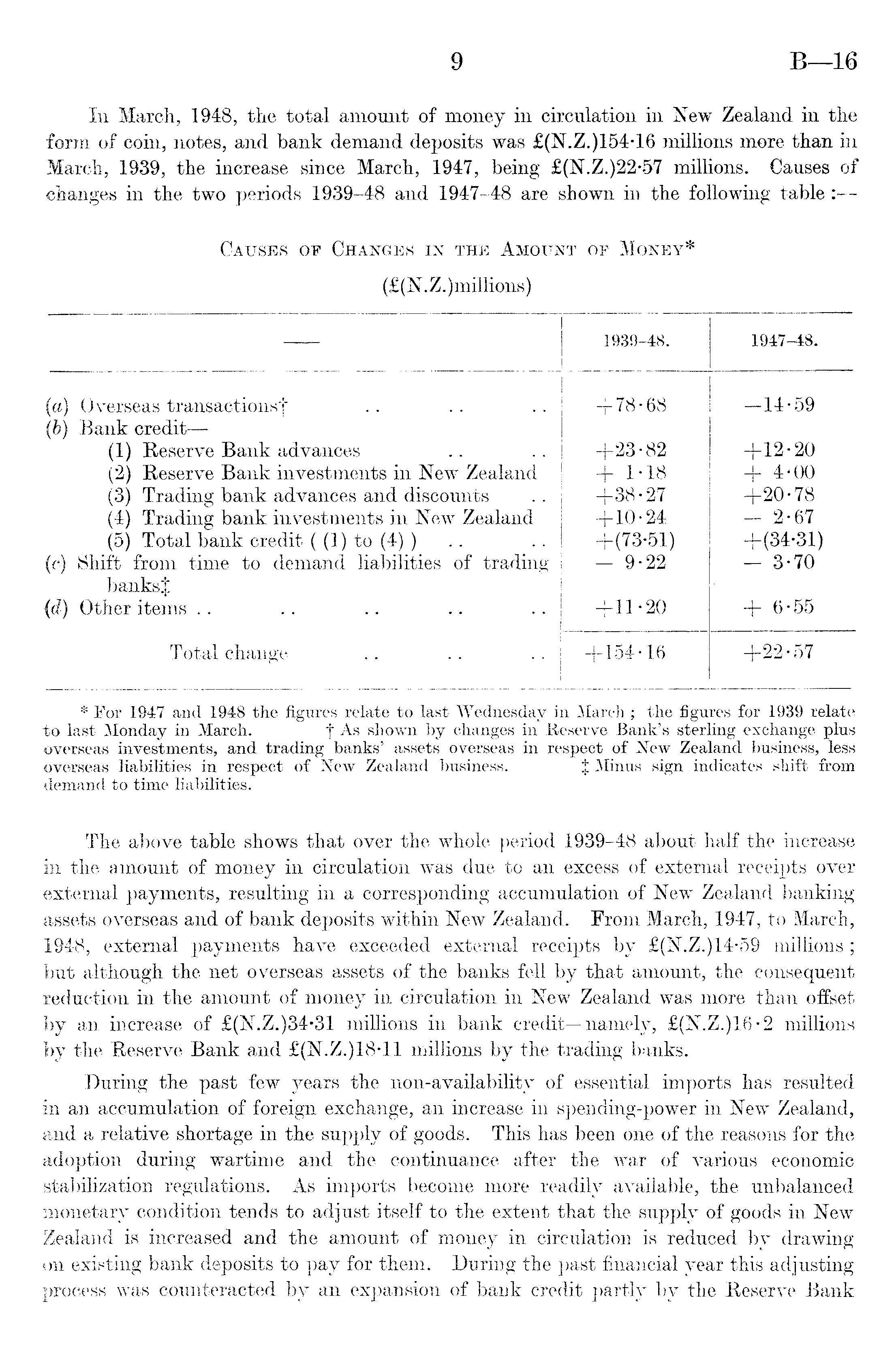 * For 1947 and 1948 the figures relate to last Wednesday in March ; the figures for 1939 relate to last Monday in March. f As shown by changes in Reserve Bank's sterling exchange plus overseas investments, and trading banks' assets overseas in respect of New Zealand business, less overseas liabilities in respect of New Zealand business. J Minus sign indicates shift from demand to time liabilities. The above table shows that over the whole period 1939-48 about half the increase in the amount of money in circulation was due to an excess of external receipts over external payments, resulting in a corresponding accumulation of New Zealand banking assets overseas and of bank deposits within New Zealand. From March, 1947, to March, 1948, external payments have exceeded external receipts by £(N.Z.)I4-59 millions; but although the net overseas assets of the banks fell by that amount, the consequent reduction in the amount of money in circulation in New Zealand was more than offset by an increase of £(N.Z.)34*31 millions in bank credit—namely, £(N.Z.)I6-2 millions by the Reserve Bank and £(N.Z.)IB-11 millions by the trading banks. During the past few years the non-availability of essential imports has resulted in an accumulation of foreign exchange, an increase in spending-power in New Zealand, and a relative shortage in the supply of goods. This has been one of the reasons for the adoption during wartime and the continuance after the war of various economic stabilization regulations. As imports become more readily available, the unbalanced monetary condition tends to adjust itself to the extent that the supply of goods in New Zealand is increased and the amount of money in circulation is reduced by drawing on existing bank deposits to pay for them. During the past financial year this adjusting process was counteracted by an expansion of bank credit partly by the Reserve Bank
