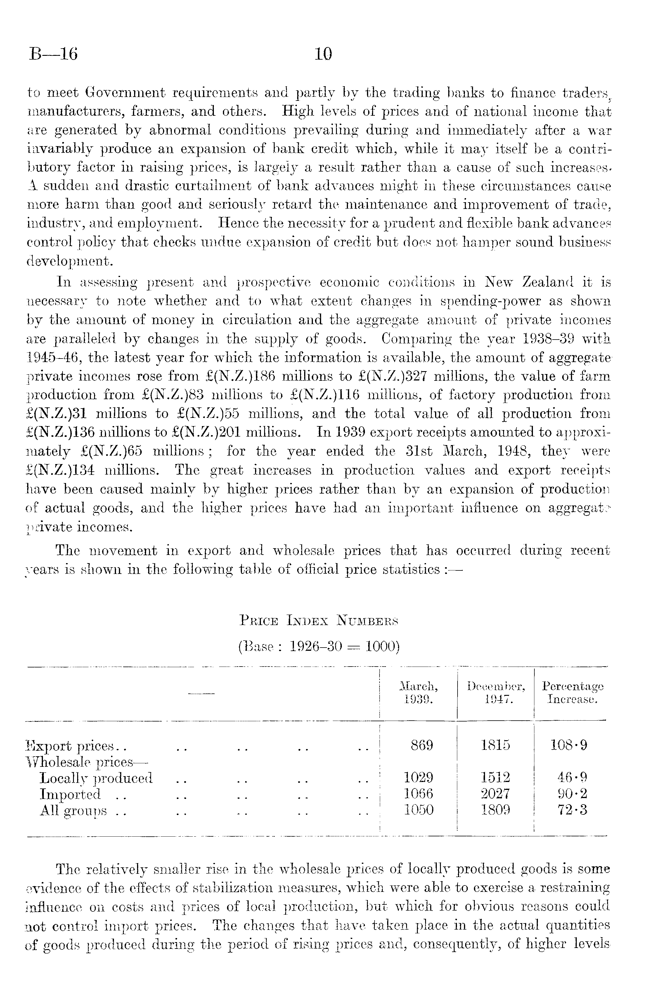 to meet Government requirements and partly by the trading banks to finance traders. manufacturers, farmers, and others. High levels of prices and of national income that are generated by abnormal conditions prevailing during and immediately after a war invariably produce an expansion of bank credit which, while it may itself be a contributory factor in raising prices, is largely a result rather than a cause of such increasesA sudden and drastic curtailment of bank advances might in these circumstances cause more harm than good and seriously retard the maintenance and improvement of trade, industry, and employment. Hence the necessity for a prudent and flexible bank advances control policy that checks undue expansion of credit but does not hamper sound business development. In assessing present and prospective economic conditions in New Zealand it is necessary to note whether and to what extent changes in spending-power as shown by the amount of money in circulation and the aggregate amount of private incomes are paralleled by changes in the supply of goods. Comparing the year 1938-39 with 1945-46, the latest year for which the information is available, the amount of aggregate private incomes rose from £(N.Z.)186 millions to £(N.Z.)327 millions, the value of farm production from £(N.Z.)B3 millions to £(N.Z.)116 millions, of factory production from £(N.Z.)3I millions to £(N.Z.)55 millions, and the total value of all production from £(N.Z.)136 millions to £(N.Z.)201 millions. In 1939 export receipts amounted to approximately £(N.Z.)65 millions; for the year ended the 31st March, 1948, they were £(N.Z.)134 millions. The great increases in production values and export receipts have been caused mainly by higher prices rather than by an expansion of production of actual goods, and the higher prices have had an important influence on aggregateprivate incomes. The movement in export and wholesale prices that has occurred during recent years is shown in the following table of official price statistics :