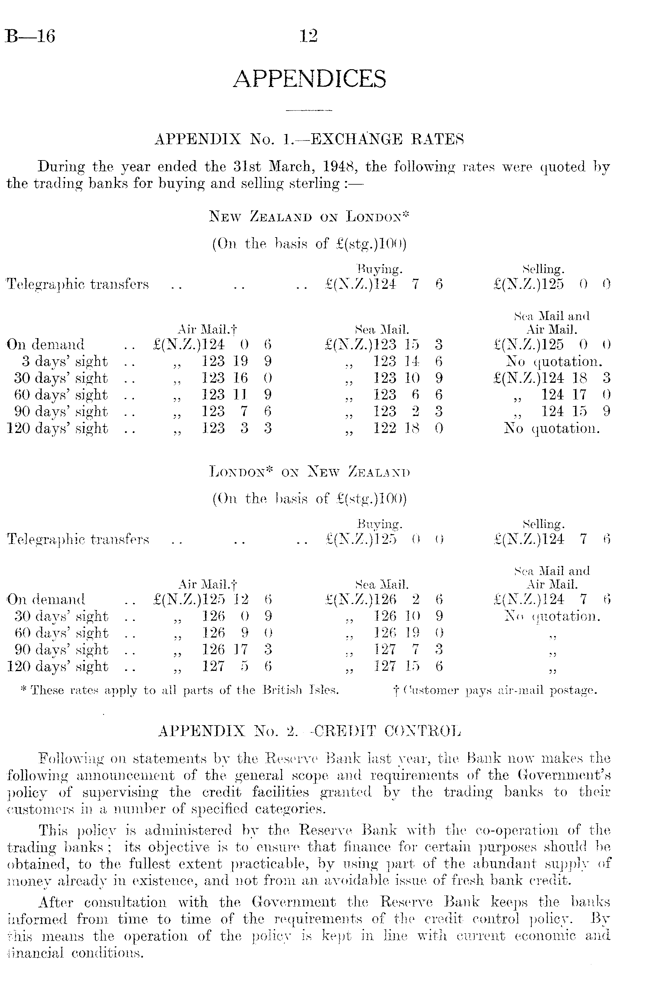APPENDICES APPENDIX No. I.—EXCHANGE RATES During the year ended the 31st March, 1948, the following rates were quoted by the trading banks for buying and selling sterling : New Zealand on London* (On the basis of f(stg.)lOO) Buying. Selling. Telegraphic transfers .. .. .. £(N.Z.)124 7 6 £(N.Z.)125 0 0 Sea Mail and Air Mail.f Sea Mail. Air Mail. On demand .. £(N.Z.)124 0 6 £(N.Z.)123 15 3 £(N.Z.)125 0 0 3 days' sight .. „ 123 19 9 „ 123 14 6 No quotation. 30 days' sight .. „ 123 16 0 „ 123 10 9 £(N.Z.)124 18 3 60 days' sight .. „ 123 11 9 „ 123 6 6 „ 124 17 0 90 days' sight .. „ 123 7 6 „ 123 2 3 „ 124 15 9 120 days' sight .. „ 123 3 3 „ 122 18 0 No quotation. London* on New Zealand (On the basis of £(stg.)100) Buving. Selling. Telegraphic transfers .. .. .. £(N.Z.)125 0 0 £(N.Z.)124 7 6 Sea Mail and Air Mail.f Sea Mail. Air Mail. On demand .. £(N.Z.)125 12 6 £(N.Z.)126 2 6 £(N.Z.)124 7 6 30 days' sight .. „ 126 0 9 „ 126 10 9 No quotation. 60 days'sight .. „ 126 9 0 „ 126 19 0 90 days' sight .. „ 126 17 3 „ 127 7 3 120 days' sight .. „ 127 5 6 „ 127 15 6 * These rates apply to all parts of the British Isles. f Customer pays air-mail postage. APPENDIX No. 2.—CREDIT CONTROL Following on statements by the Reserve Bank last year, the Bank now makes the following announcement of the general scope and requirements of the Government's policy of supervising the credit facilities granted by the trading banks to their customers in a number of specified categories. This policy is administered by the Reserve Bank with the co-operation of the trading banks ; its objective is to ensure that finance for certain purposes should be obtained, to the fullest extent practicable, by using part of the abundant supply of money already in existence, and not from an avoidable issue of fresh bank credit. After consultation with the Government the Reserve Bank keeps the banks informed from time to time of the requirements of the credit control policy. By this means the operation of the policy is kept in line with current economic and iinancial conditions.