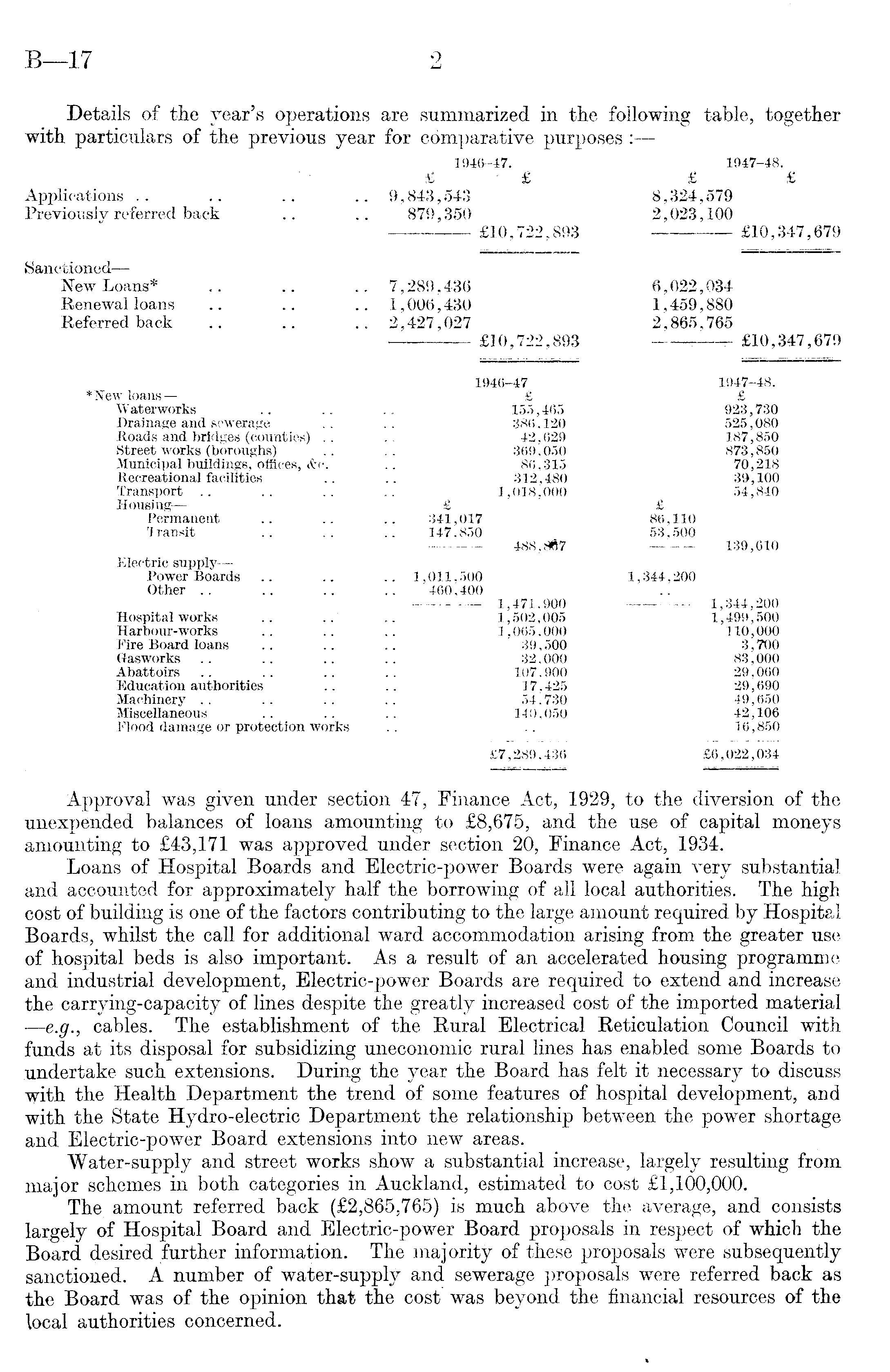 Details of the year's operations are summarized in the following table, together with particulars of the previous year for comparative purposes 1946-47. 1947-48. £ '. £ £ £ Applications .. .. .. ... 9,843,543 8,324,579 Previously referred back .. .. 879,350 2,023,100 £10,722,893 £10,347,679 Sanctioned — New Loans* .. .. .. 7,289,436 6,022,034 Renewal loans .. .. .. 1,006,430 1,459,880 Referred back .. .. ..2,427,027 2,865,765 £10,722,893 : £10,347,679 1946-47 1947-48. *Mew loans — £ £ Waterworks .. .. .. 155,465 923,730 Drainage and sewerage .. .. 386,120 525,080 Roads and bridges (counties) .. .. 42,629 187,850 Street works (boroughs)- .. .. 369,050 873,850 Municipal buildings, offices, <fec. .. 86,315 70,218 Recreational facilities .. .. 312,480 39,100 Transport .. .. .. .. 1,018,000 54,840 Housing— £ £ Permanent .. .. .. 341,017 86,110 Transit .. .. .. 147,850 53,500 488,867 139,610 Electric supply—Power Boards .. .. .. 1,011,500 1,344,200 Other .. .. .. .. 460,400 1,471,900 1,344,200 Hospital works .. .. .. 1,502,005 1,499,500 Harbour-works .. .. .. 1,065,000 110,000 Fire Board loans .. .. .. 39,500 3,700 Gasworks .. .. .. .. 32,000 83,000 Abattoirs .. .. .. .. 107,900 29,060 Education authorities .. .. 17.425 29,690 Machinery .. .. .. .. 54,730 49,650 Miscellaneous .. .. .. 140,050 42,106 Mood damage or protection works .. .. 16,850 £7,289,436 £6,022,034 Approval was given under section 47, Finance Act, 1929, to the diversion of the unexpended balances of loans amounting to £8,675, and the use of capital moneys amounting to £43,171 was approved under section 20, Finance Act, 1934. Loans of Hospital Boards and Electric-power Boards were again very substantial and accounted for approximately half the borrowing of all local authorities. The high cost of building is one of the factors contributing to the large amount required by Hospital Boards, whilst the call for additional ward accommodation arising from the greater use of hospital beds is also important. As a result of an accelerated housing programme and industrial development, Electric-power Boards are required to extend and increase the carrying-capacity of lines despite the greatly increased cost of the imported material —e.g., cables. The establishment of the Rural Electrical Reticulation Council with funds at its disposal for subsidizing uneconomic rural lines has enabled some Boards to undertake such extensions. During the year the Board has felt it necessary to discuss with the Health Department the trend of some features of hospital development, and with the State Hydro-electric Department the relationship between the power shortage and Electric-power Board extensions into new areas. Water-supply and street works show a substantial increase, largely resulting from major schemes in both categories in Auckland, estimated to cost £1,100,000. The amount referred back (£2,865,765) is much above the average, and consists largely of Hospital Board and Electric-power Board proposals in respect of which the Board desired further information. The majority of these proposals were subsequently sanctioned. A number of water-supply and sewerage proposals were referred back as the Board was of the opinion that the cost was beyond the financial resources of the local authorities concerned.