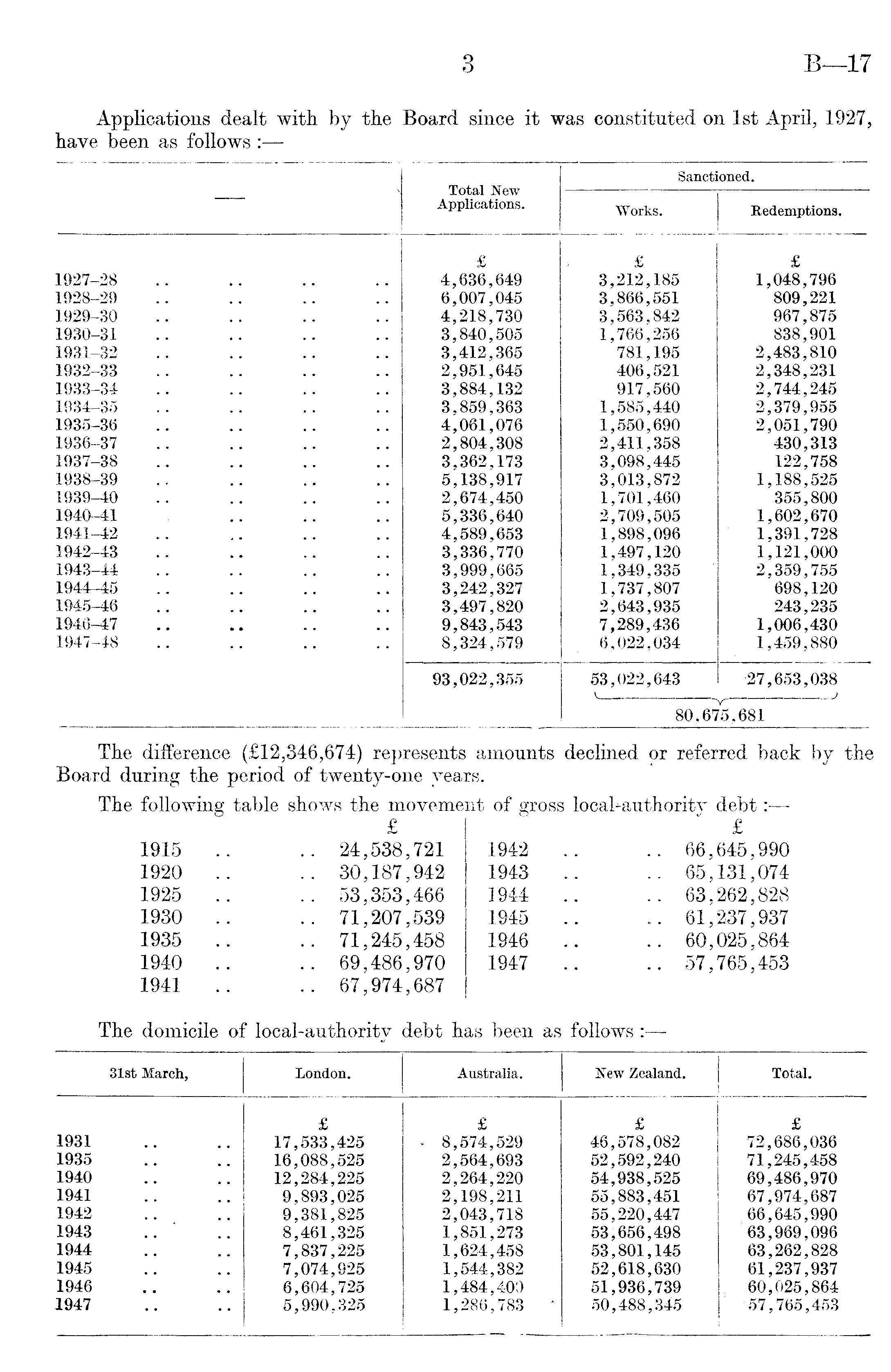 The difference (£12,346,674) represents amounts declined or referred back by the Board during the period of twenty-one years. The following table shows the movement of gross local-authority debt:— £ " £ 1915 .. .. 24,538,721 1942 .. .. 66,645,990 1920 .. .. 30,187,942 1943 .. .. 65,131,074 1925 .. .. 53,353,466 1944 .. .. 63,262,828 1930 .. .. 71,207,539 1945 .. .. 61,237,937 1935 .. .. 71,245,458 1946 .. .. 60,025,864 1940 .. .. 69,486,970 1947 .. .. 57,765,453 1941 .. .. 67,974,687 The domicile of local-authority debt has been as follows :