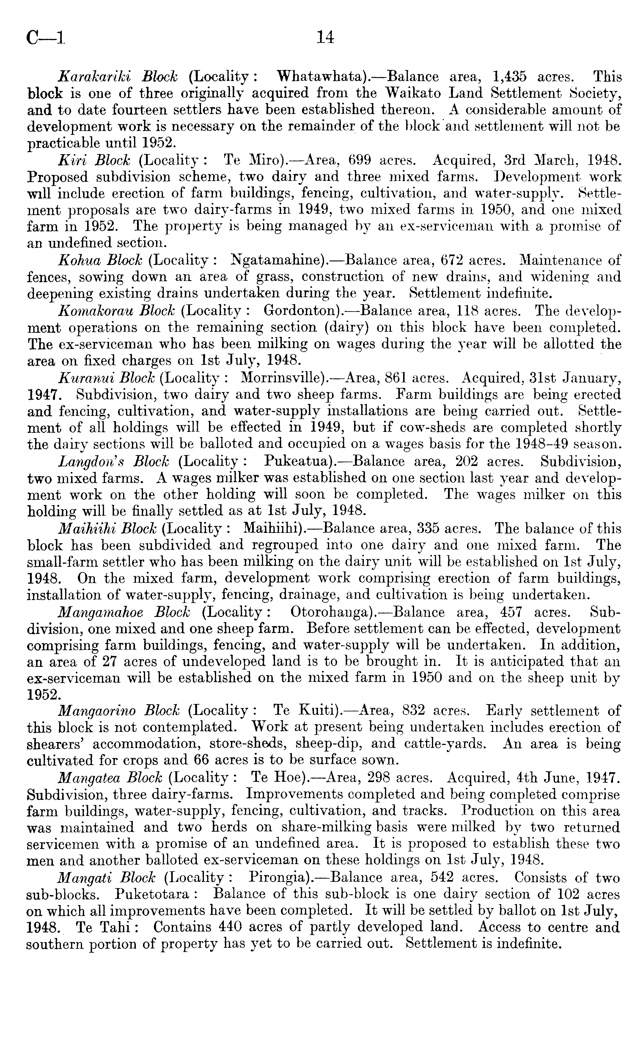Karakariki Block (Locality: Whatawhata). —Balance area, 1,435 acres. This block is one of three originally acquired from the Waikato Land Settlement Society, and to date fourteen settlers have been established thereon. A considerable amount of development work is necessary on the remainder of the block and settlement will not be practicable until 1952. Kiri Block (Locality: Te Miro). —Area, 699 acres. Acquired, 3rd March, 1948. Proposed subdivision scheme, two dairy and three mixed farms. Development work will include erection of farm buildings, fencing, cultivation, and water-supply. Settlement proposals are two dairy-farms in 1949, two mixed farms in 1950, and one mixed farm in 1952. The property is being managed by an ex-serviceman with a promise of an undefined section. Kohua Block (Locality : Ngatamahine). —Balance area, 672 acres. Maintenance of fences, sowing down an area of grass, construction of new drains, and widening and deepening existing drains undertaken during the year. Settlement indefinite. Komakorau Block (Locality : Gordonton). —Balance area, 118 acres. The development operations on the remaining section (dairy) on this block have been completed. The ex-serviceman who has been milking on wages during the year will be allotted the area on fixed charges on Ist July, 1948. Kuranui Block (Locality : Morrinsville). —Area, 861 acres. Acquired, 31st January, 1947. Subdivision, two dairy and two sheep farms. Farm buildings are being erected and fencing, cultivation, and water-supply installations are being carried out. Settlement of all holdings will be effected in 1949, but if cow-sheds are completed shortly the dairy sections will be balloted and occupied on a wages basis for the 1948-49 season. Langdon's Block (Locality: Pukeatua). —Balance area, 202 acres. Subdivision, two mixed farms. A wages milker was established on one section last year and development work on the other holding will soon be completed. The wages milker on this holding will be finally settled as at Ist July, 1948. Maihiihi Block (Locality : Maihiihi). —Balance area, 335 acres. The balance of this block has been subdivided and regrouped into one dairy and one mixed farm. The small-farm settler who has been milking on the dairy unit will be established on Ist July, 1948. On the mixed farm, development work comprising erection of farm buildings, installation of water-supply, fencing, drainage, and cultivation is being undertaken. Mangamahoe Block (Locality: Otorohanga).—Balance area, 457 acres. Subdivision, one mixed and one sheep farm. Before settlement can be effected, development comprising farm buildings, fencing, and water-supply will be undertaken. In addition, an area of 27 acres of undeveloped land is to be brought in. It is anticipated that an ex-serviceman will be established on the mixed farm in 1950 and on the sheep unit by 1952. Mangaorino Block (Locality: Te Kuiti). —Area, 832 acres. Early settlement of this block is not contemplated. Work at present being undertaken includes erection of shearers' accommodation, store-sheds, sheep-dip, and cattle-yards. An area is being cultivated for crops and 66 acres is to be surface sown. Mangatea Block (Locality : Te Hoe). —Area, 298 acres. Acquired, 4th June, 1947. Subdivision, three dairy-farms. Improvements completed and being completed comprise farm buildings, water-supply, fencing, cultivation, and tracks. Production on this area was maintained and two herds on share-milking basis were milked by two returned servicemen with a promise of an undefined area. It is proposed to establish these two men and another balloted ex-serviceman on these holdings on Ist July, 1948. Mangati Block (Locality: Pirongia).—Balance area, 542 acres. Consists of two sub-blocks. Puketotara : Balance of this sub-block is one dairy section of 102 acres on which all improvements have been completed. It will be settled by ballot on Ist July, 1948. Te Tahi: Contains 440 acres of partly developed land. Access to centre and southern portion of property has yet to be carried out. Settlement is indefinite.