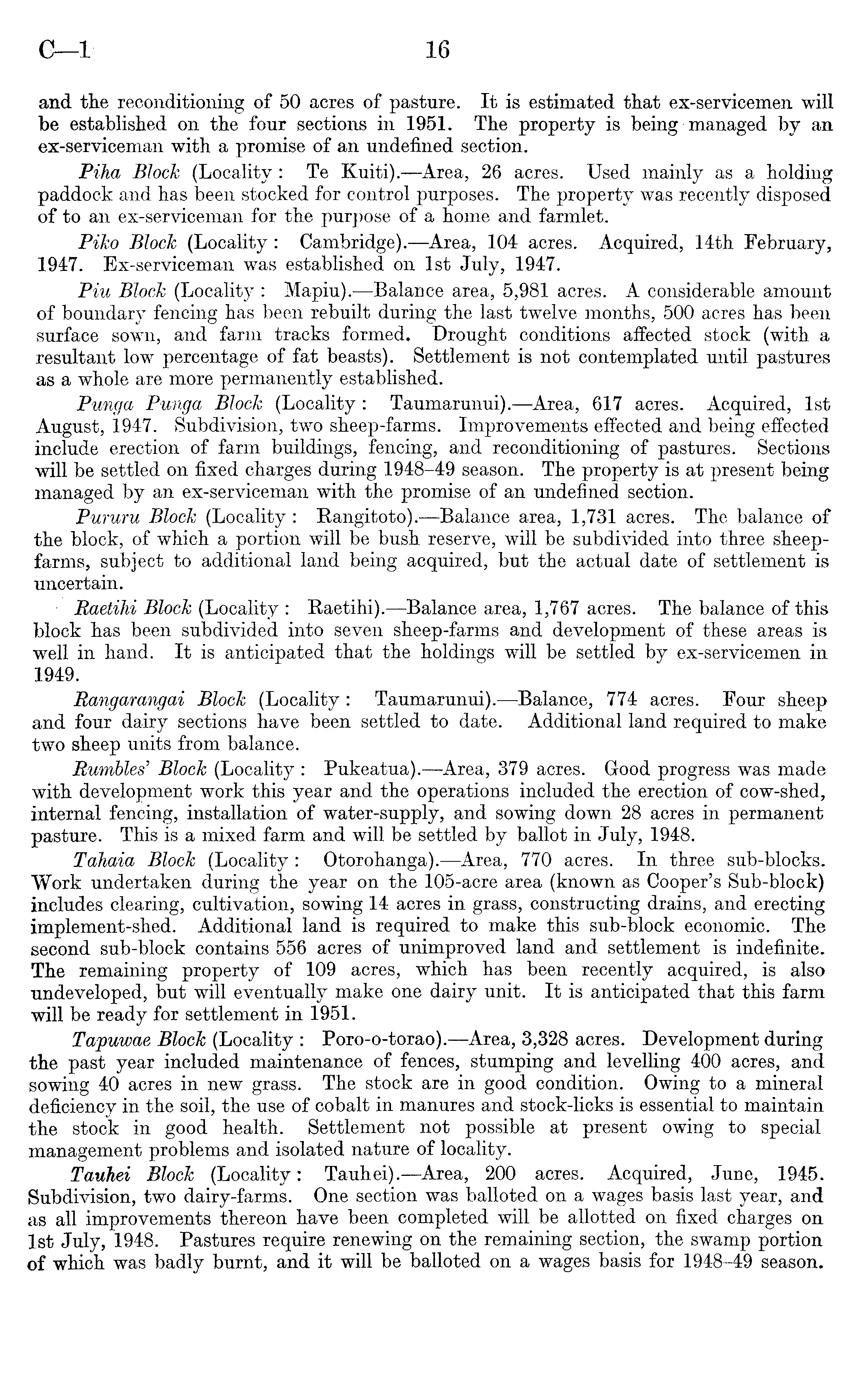 and the reconditioning of 50 acres of pasture. It is estimated that ex-servicemen will be established on the four sections in 1951. The property is being managed by an ex-serviceman with a promise of an undefined section. Piha Block (Locality: Te Kuiti). —Area, 26 acres. Used mainly as a holding paddock and has been stocked for control purposes. The property was recently disposed of to an ex-serviceman for the purpose of a home and farmlet. Piko Block (Locality: Cambridge). —Area, 104 acres. Acquired, 14th February, 1947. Ex-serviceman was established on Ist July, 1947. Piu Block (Locality: Mapiu). —Balance area, 5,981 acres. A considerable amount of boundary fencing has been rebuilt during the last twelve months, 500 acres has been surface sown, and farm tracks formed. Drought conditions affected stock (with a resultant low percentage of fat beasts). Settlement is not contemplated until pastures as a whole are more permanently established. Punga Punga Block (Locality: Taumarunui). —Area, 617 acres. Acquired, Ist August, 1947. Subdivision, two sheep-farms. Improvements effected and being effected include erection of farm buildings, fencing, and reconditioning of pastures. Sections will be settled on fixed charges during 1948-49 season. The property is at present being managed by an ex-serviceman with the promise of an undefined section. Pururu Block (Locality : Rangitoto). —Balance area, 1,731 acres. The balance of the block, of which a portion will be bush reserve, will be subdivided into three sheepfarms, subject to additional land being acquired, but the actual date of settlement is uncertain. Raetihi Block (Locality : Raetihi). —Balance area, 1,767 acres. The balance of this block has been subdivided into seven sheep-farms and development of these areas is well in hand. It is anticipated that the holdings will be settled by ex-servicemen in 1949. Rangarangai Block (Locality: Taumarunui). —Balance, 774 acres. Four sheep and four dairy sections have been settled to date. Additional land required to make two sheep units from balance. Rumbles' Block (Locality : Pukeatua). —Area, 379 acres. Good progress was made with development work this year and the operations included the erection of cow-shed, internal fencing, installation of water-supply, and sowing down 28 acres in permanent pasture. This is a mixed farm and will be settled by ballot in July, 1948. Tahaia Block (Locality: Otorohanga).—Area, 770 acres. In three sub-blocks. Work undertaken during the year on the 105-acre area (known as Cooper's Sub-block) includes clearing, cultivation, sowing 14 acres in grass, constructing drains, and erecting implement-shed. Additional land is required to make this sub-block economic. The second sub-block contains 556 acres of unimproved land and settlement is indefinite. The remaining property of 109 acres, which has been recently acquired, is also undeveloped, but will eventually make one dairy unit. It is anticipated that this farm will be ready for settlement in 1951. Tapuwae Block (Locality : Poro-o-torao). —Area, 3,328 acres. Development during the past year included maintenance of fences, stumping and levelling 400 acres, and sowing 40 acres in new grass. The stock are in good condition. Owing to a mineral deficiency in the soil, the use of cobalt in manures and stock-licks is essential to maintain the stock in good health. Settlement not possible at present owing to special management problems and isolated nature of locality. Tauhei Block (Locality: Tauhei). —Area, 200 acres. Acquired, June, 1945. Subdivision, two dairy-farms. One section was balloted on a wages basis last year, and as all improvements thereon have been completed will be allotted on fixed charges on Ist July, 1948. Pastures require renewing on the remaining section, the swamp portion of which was badly burnt, and it will be balloted on a wages basis for 1948-49 season.