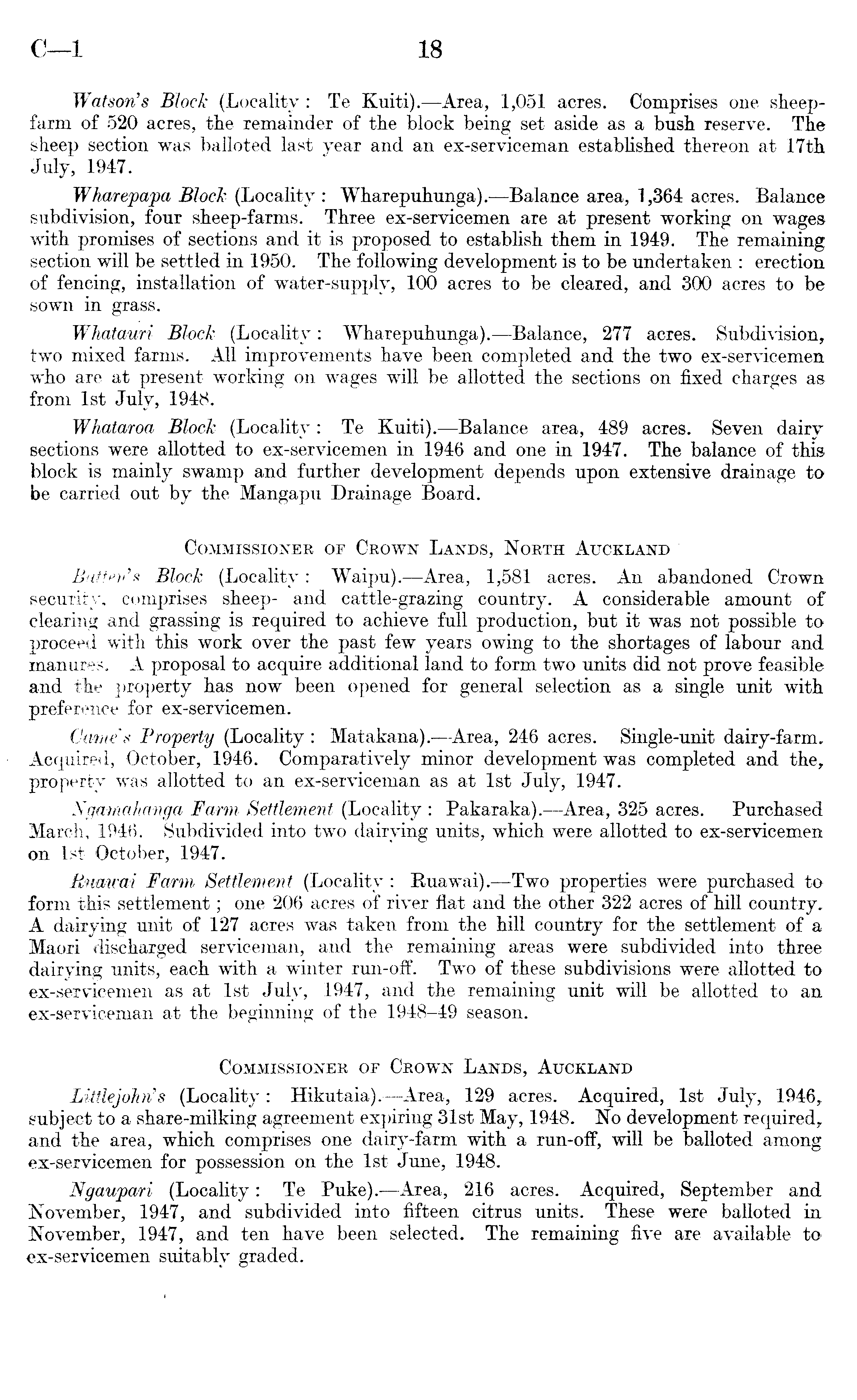Watson's Block (Locality : Te Kuiti). —Area, 1,051 acres. Comprises one sheepfarm of 520 acres, the remainder of the block being set aside as a bush reserve. The sheep section was balloted last year and an ex-serviceman established thereon at 17th July, 1947. Wharepapa Block (Locality : Wharepuhunga).—Balance area, 1,364 acres. Balance subdivision, four sheep-farms. Three ex-servicemen are at present working on wages with promises of sections and it is proposed to establish them in 1949. The remaining section will be settled in 1950. The following development is to be undertaken : erection of fencing, installation of water-supply, 100 acres to be cleared, and 300 acres to be sown in grass. Whatauri Block (Locality: Wharepuhunga).—Balance, 277 acres. Subdivision, two mixed farms. All improvements have been completed and the two ex-servicemen who are at present working on wages will be allotted the sections on fixed charges as from Ist July, 1948. Whataroa Block (Locality : Te Kuiti). —Balance area, 489 acres. Seven dairy sections were allotted to ex-servicemen in 1946 and one in 1947. The balance of this block is mainly swamp and further development depends upon extensive drainage to be carried out by the Mangapu Drainage Board. Commissioner of Crown Lands, North Auckland Batten's Block (Locality: Waipu).—Area, 1,581 acres. An abandoned Crown security, comprises sheep- and cattle-grazing country. A considerable amount of clearing and grassing is required to achieve full production, but it was not possible to proceed with this work over the past few years owing to the shortages of labour and manures. A proposal to acquire additional land to form two units did not prove feasible and the property has now been opened for general selection as a single unit with preference for ex-servicemen. Game's Property (Locality : Matakana). —Area, 246 acres. Single-unit dairy-farm. Acquired, October, 1946. Comparatively minor development was completed and the, property was allotted to an ex-serviceman as at Ist July, 1947. Ngamahanga Farm Settlement (Locality : Pakaraka).—Area, 325 acres. Purchased March, 1946. Subdivided into two dairying units, which were allotted to ex-servicemen on Ist October, 1947. Rtiaivai Farm Settlement (Locality : Ruawai). —Two properties were purchased to form this settlement; one 206 acres of river fiat and the other 322 acres of hill country. A dairying unit of 127 acres was taken from the hill country for the settlement of a Maori discharged serviceman, and the remaining areas were subdivided into three dairying units, each with a winter run-off. Two of these subdivisions were allotted to ex-servicemen as at Ist July, 1947, and the remaining unit will be allotted to an ex-serviceman at the beginning of the 1948-49 season. Commissioner of Crown Lands, Auckland Littlejohn's (Locality : Hikutaia). —Area, 129 acres. Acquired, Ist July, 1946, subject to a share-milking agreement expiring 31st May, 1948. No development required, and the area, which comprises one dairy-farm with a run-off, will be balloted among ex-servicemen for possession on the Ist June, 1948. Ngaupari (Locality: Te Puke). —Area, 216 acres. Acquired, September and November, 1947, and subdivided into fifteen citrus units. These were balloted in November, 1947, and ten have been selected. The remaining five are available to ex-servicemen suitably graded.