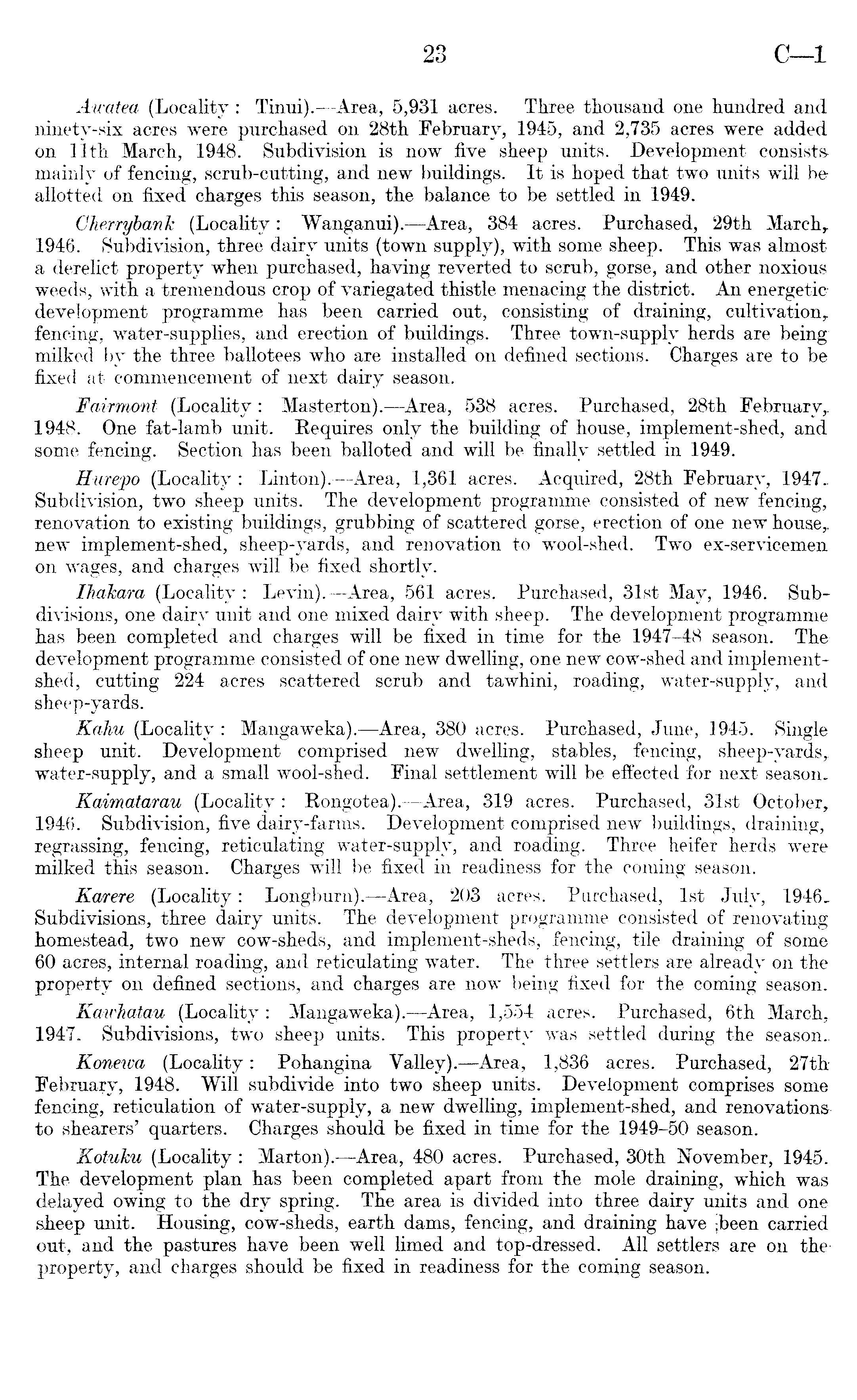 Auatea (Locality : Tinui). —Area, 5,931 acres. Three thousand one hundred and ninety-six acres were purchased on 28th February, 1945, and 2,735 acres were added on 11th March, 1948. Subdivision is now five sheep units. Development consistsmainly of fencing, scrub-cutting, and new buildings. It is hoped that two units will be allotted on fixed charges this season, the balance to be settled in 1949. Ckerrybank (Locality : Wanganui).—Area, 384 acres. Purchased, 29th March,. 1946. Subdivision, three dairy units (town supply), with some sheep. This was almost a derelict property when purchased, having reverted to scrub, gorse, and other noxious weeds, with a tremendous crop of variegated thistle menacing the district. An energetic development programme has been carried out, consisting of draining, cultivation* fencing, water-supplies, and erection of buildings. Three town-supply herds are being milked by the three ballotees who are installed on defined sections. Charges are to be fixed at commencement of next dairy season. Fairmont (Locality : Masterton). —Area, 538 acres. Purchased, 28th February,. 1948. One fat-lamb unit. Requires only the building of house, implement-shed, and some fencing. Section has been balloted and will be finally settled in 1949. Hurepo (Locality : Linton). —Area, 1,361 acres. Acquired, 28th February, 1947. Subdivision, two sheep units. The development programme consisted of new fencing, renovation to existing buildings, grubbing of scattered gorse, erection of one new house,, new implement-shed, sheep-yards, and renovation to wool-shed. Two ex-servicemen on wages, and charges will be fixed shortly. IJiakara (Locality : Levin). —Area, 561 acres. Purchased, 31st May, 1946. Subdivisions, one dairy unit and one mixed dairy with sheep. The development programme has been completed and charges will be fixed in time for the 1947-48 season. The development programme consisted of one new dwelling, one new cow-shed and implementshed, cutting 224 acres scattered scrub and tawhini, roading, water-supply, and sheep-yards. Kahu (Locality : Mangaweka).—Area, 380 acres. Purchased, June, 1945. Single sheep unit. Development comprised new dwelling, stables, fencing, sheep-yards,, water-supply, and a small wool-shed. Final settlement will be effected for next season. Kaimatarau (Locality : Rongotea).—Area, 319 acres. Purchased, 31st October* 1946. Subdivision, five dairy-farms. Development comprised new buildings, draining, regrassing, fencing, reticulating water-supply, and roading. Three heifer herds were milked this season. Charges will be fixed in readiness for the coming season. Karere (Locality: Longburn). —Area, 203 acres. Purchased, Ist July, 1946, Subdivisions, three dairy units. The development programme consisted of renovating homestead, two new cow-sheds, and implement-sheds, fencing, tile draining of some 60 acres, internal roading, and reticulating water. The three settlers are already on the property on defined sections, and charges are now being fixed for the coming season. Kaivhatau (Locality : Mangaweka).—Area, 1,554 acres. Purchased, 6th March, 1947. Subdivisions, two sheep units. This property was settled during the season.. Koneiva (Locality: Pohangina Valley).—Area, 1,836 acres. Purchased, 27th February, 1948. Will subdivide into two sheep units. Development comprises some fencing, reticulation of water-supply, a new dwelling, implement-shed, and renovations to shearers' quarters. Charges should be fixed in time for the 1949-50 season. Kotuku (Locality : Marton). —Area, 480 acres. Purchased, 30th November, 1945. The development plan has been completed apart from the mole draining, which was delayed owing to the dry spring. The area is divided into three dairy units and one sheep unit. Housing, cow-sheds, earth dams, fencing, and draining have jbeen carried out, and the pastures have been well limed and top-dressed. All settlers are on theproperty, and charges should be fixed in readiness for the coming season.