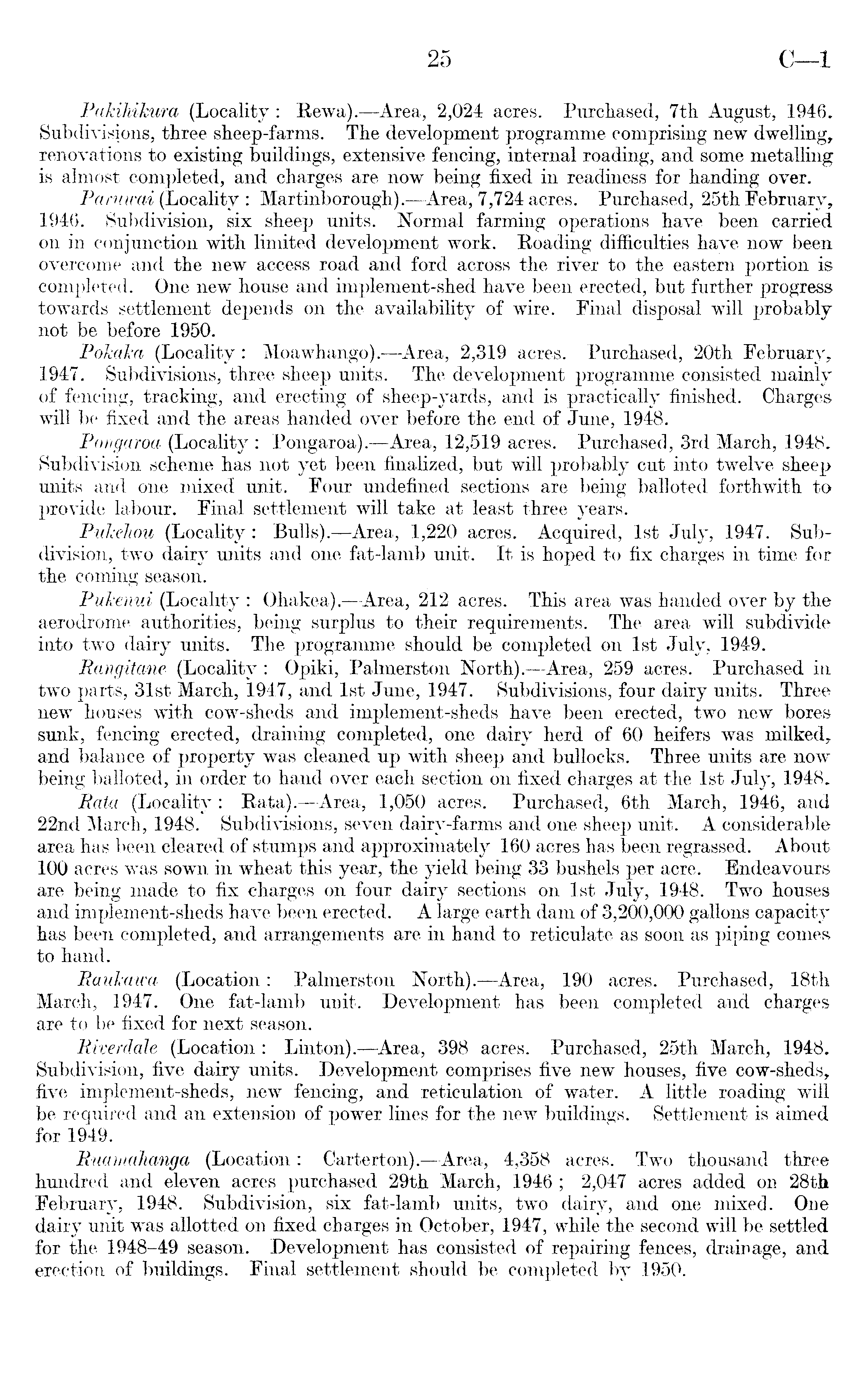Pakihikura (Locality: Rewa). —Area, 2,0*24 acres. Purchased, 7th August, 1946. Subdivisions, three sheep-farms. The development programme comprising new dwelling, renovations to existing buildings, extensive fencing, internal roading, and some metalling is almost completed, and charges are now being fixed in readiness for handing over. Pamivai (Locality : Martinborough).—Area, 7,724 acres. Purchased, 25th February, 1946. Subdivision, six sheep units. Normal farming operations have been carried on in conjunction with limited development work. Roading difficulties have now been overcome and the new access road and ford across the river to the eastern portion is completed. One new house and implement-shed have been erected, but further progress towards settlement depends on the availability of wire. Final disposal will probably not be before 1950. Pokaka (Locality : Moawhango).—Area, 2,319 acres. Purchased, 20th February, 1947. Subdivisions, three sheep units. The development programme consisted mainly of fencing, tracking, and erecting of sheep-yards, and is practically finished. Charges will be fixed and the areas handed over before the end of June, 1948. Pongaroa (Locality : Pongaroa).—Area, 12,519 acres. Purchased, 3rd March, 1948. Subdivision scheme has not yet been finalized, but will probably cut into twelve sheep units and one mixed unit. Four undefined sections are being balloted forthwith to provide labour. Final settlement will take at least three years. Pukehou (Locality: Bulls). —Area, 1,220 acres. Acquired, Ist July, 1947. Subdivision, two dairy units and one fat-lamb unit. It is hoped to fix charges in time for the coming season. Pukenui (Locality : Ohakea).—Area, 212 acres. This area was handed over by the aerodrome authorities, being surplus to their requirements. The area will subdivide into two dairy units. The programme should be completed on Ist July, 1949. Rangitane (Locality : Opiki, Palmerston North). —Area, 259 acres. Purchased in two parts, 31st March, 1947, and Ist June, 1947. Subdivisions, four dairy units. Three new houses with cow-sheds and implement-sheds have been erected, two new bores sunk, fencing erected, draining completed, one dairy herd of 60 heifers was milked, and balance of property was cleaned up with sheep and bullocks. Three units are now being balloted, in order to hand over each section on fixed charges at the Ist July, 1948. Rata (Locality: Rata).—Area, 1,050 acres. Purchased, 6th March, 1946, and 22nd March, 1948. Subdivisions, seven dairy-farms and one sheep unit. A considerable area has been cleared of stumps and approximately 160 acres has been regrassed. About 100 acres was sown in wheat this year, the yield being 33 bushels per acre. Endeavours are being made to fix charges on four dairy sections on Ist July, 1948. Two houses and implement-sheds have been erected. A large earth dam of 3,200,000 gallons capacity has been completed, and arrangements are in hand to reticulate as soon as piping comes to hand. Raukawa (Location: Palmerston North). —Area, 190 acres. Purchased, 18th March, 1947. One fat-lamb unit. Development has been completed and charges are to be fixed for next season. Riverdale (Location : Linton). —Area, 398 acres. Purchased, 25th March, 1948. Subdivision, five dairy units. Development comprises five new houses, five cow-sheds, five implement-sheds, new fencing, and reticulation of water. A little roading will be required and an extension of power lines for the new buildings. Settlement is aimed for 1949. Ruamahanga (Location: Carterton). —Area, 4,358 acres. Two thousand three hundred and eleven acres purchased 29th March, 1946 ; 2,047 acres added on 28th February, 1948. Subdivision, six fat-lamb units, two dairy, and one mixed. One dairy unit was allotted on fixed charges in October, 1947, while the second will be settled for the 1948-49 season. Development has consisted of repairing fences, drainage, and erection of buildings. Final settlement should be completed by 1950.