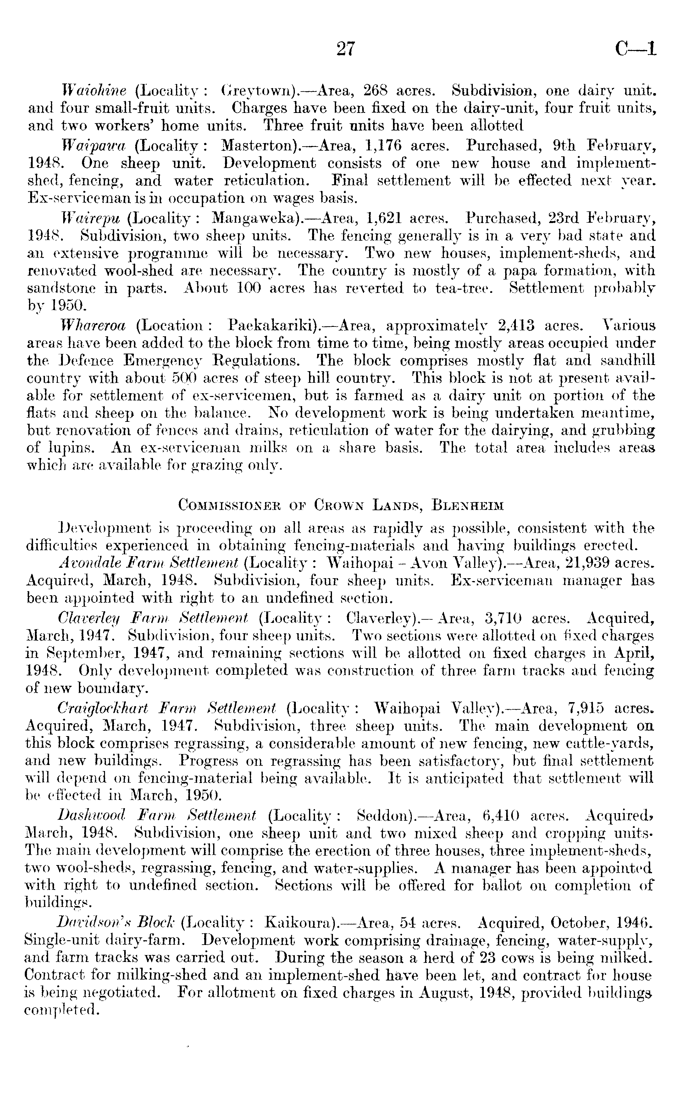 Waiohine (Locality: Grey town). —Area, 268 acres. Subdivision, one dairy unit, and four small-fruit units. Charges have been fixed on the dairy-unit, four fruit units, and two workers' home units. Three fruit units have been allotted Waipawa (Locality : Masterton). —Area, 1,176 acres. Purchased, 9th February, 1948. One sheep unit. Development consists of one new house and implementshed, fencing, and water reticulation. Final settlement will be effected next year. Ex-serviceman is in occupation on wages basis. Wairepu (Locality : Mangaweka).—Area, 1,621 acres. Purchased, 23rd February, 1948. Subdivision, two sheep units. The fencing generally is in a very bad state and an extensive programme will be necessary. Two new houses, implement-sheds, and renovated wool-shed are necessary. The country is mostly of a papa formation, with sandstone in parts. About 100 acres has reverted to tea-tree. Settlement probably by 1950. Wliareroa (Location : Paekakarilci). —Area, approximately 2,413 acres. Various areas have been added to the block from time to time, being mostly areas occupied under the Defence Emergency Regulations. The block comprises mostly flat and sandhill country with about 500 acres of steep hill country. This block is not at present available for settlement of ex-servicemen, but is farmed as a dairy unit on portion of the flats and sheep on the balance. No development work is being undertaken meantime, but renovation of fences and drains, reticulation of water for the dairying, and grubbing of lupins. An ex-serviceman milks on a. share basis. The total area includes areas which are available for grazing only. Commissioner of Crown Lands, Blenheim Development is proceeding on all areas as rapidly as possible, consistent with the difficulties experienced in obtaining fencing-materials and having buildings erected. Avondale Farm Settlement (Locality : Waihopai - Avon Valley). —Area, 21,939 acres. Acquired, March, 1948. Subdivision, four sheep units. Ex-serviceman manager has been appointed with right to an undefined section. Claverley Farm Settlement (Locality: Claverley).— Area, 3,710 acres. Acquired, March, 1947. Subdivision, four sheep units. Two sections were allotted on fixed charges in September, 1947, and remaining sections will be allotted on fixed charges in April, 1948. Only development completed was construction of three farm tracks and fencing of new boundary. Craigloekhart Farm Settlement (Locality : Waihopai Valley). —Area, 7,915 acres. Acquired, March, 1947. Subdivision, three sheep units. The main development on this block comprises regrassing, a considerable amount of new fencing, new cattle-yards, and new buildings. Progress on regrassing has been satisfactory, but final settlement will depend oil fencing-material being available. It is anticipated that settlement will be effected in March, 1950. Dashwood Farm, Settlement (Locality: Seddon).—Area, 6,410 acres. Acquired* March, 1948. Subdivision, one sheep unit and two mixed sheep and cropping unitsThe main development will comprise the erection of three houses, three implement-sheds, two wool-sheds, regrassing, fencing, and water-supplies. A manager has been appointed with right to undefined section. Sections will be offered for ballot on completion of buildings. Davidson's Block (Locality : Kaikoura). —Area, 54 acres. Acquired, October, 1946. Single-unit dairy-farm. Development work comprising drainage, fencing, water-supply, and farm tracks was carried out. During the season a herd of 23 cows is being milked. Contract for milking-shed and an implement-shed have been let, and contract for house is being negotiated. For allotment on fixed charges in August, 1948, provided buildings completed.
