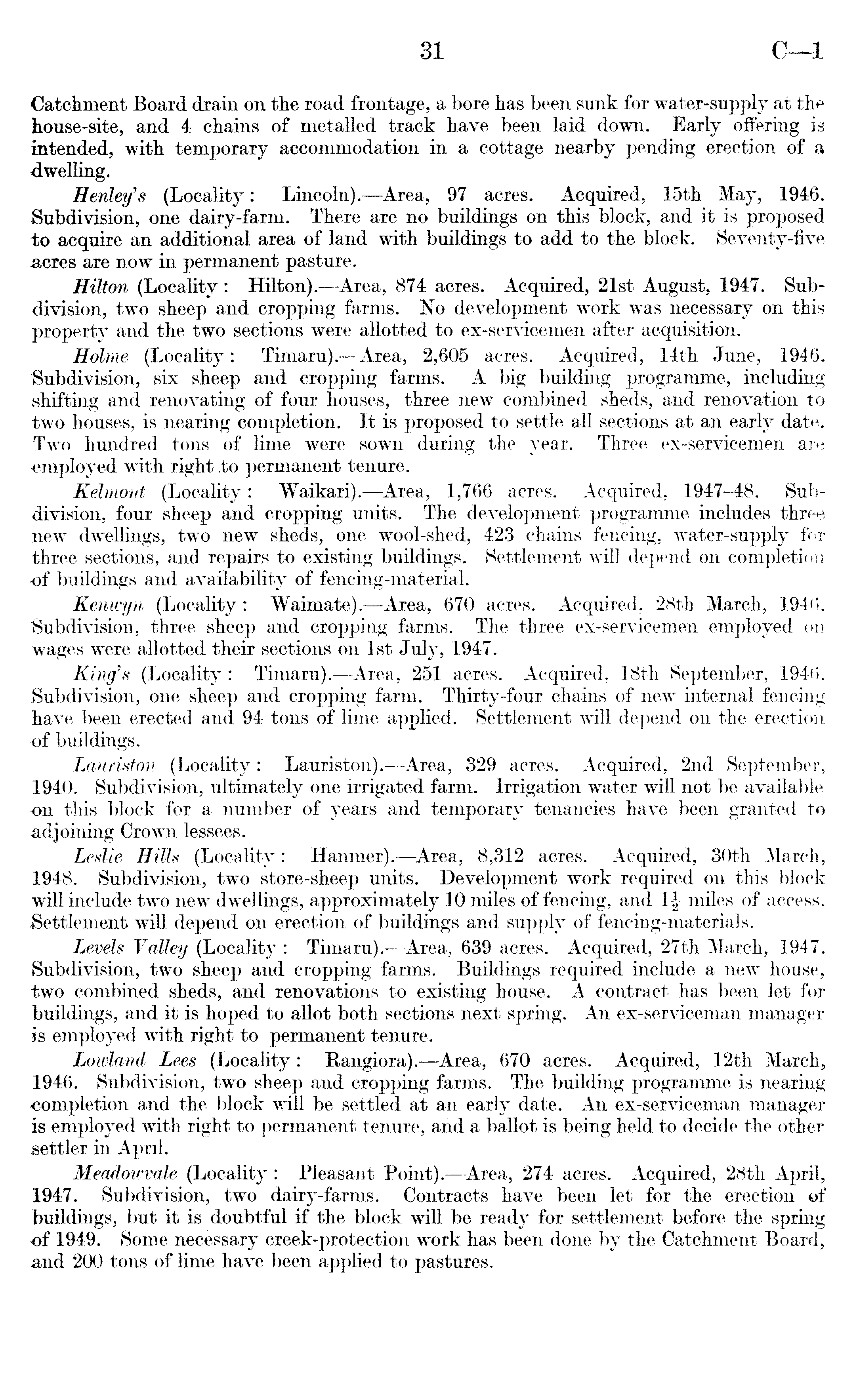Catchment Board drain on the road frontage, a bore has been sunk for water-supply at the house-site, and 4 chains of metalled track have been laid down. Early offering is intended, with temporary accommodation in a cottage nearby pending erection of a dwelling. Henley's (Locality: Lincoln). —Area, 97 acres. Acquired, 15th May, 1946. Subdivision, one dairy-farm. There are no buildings on this block, and it is proposed to acquire an additional area of land with buildings to add to the block. Seventy-five acres are now in permanent pasture. Hilton (Locality: Hilton). —Area, 874 acres. Acquired, 21st August, 1947. Subdivision, two sheep and cropping farms. No development work was necessary on this property and the two sections were allotted to ex-servicemen after acquisition. Holme (Locality: Timaru).—Area, 2,605 acres. Acquired, 14th June, 1946. Subdivision, six sheep and cropping farms. A big building programme, including shifting and renovating of four houses, three new combined sheds, and renovation to two houses, is nearing completion. It is proposed to settle all sections at an early date. Two hundred tons of lime were sown during the year. Three ex-servicemen are ■employed with right to permanent tenure. Kelmont (Locality: Waikari).—Area, 1,766 acres. Acquired, 1947-48. Subdivision, four sheep and cropping units. The development programme includes three new dwellings, two new sheds, one wool-shed, 423 chains fencing, water-supply for three sections, and repairs to existing buildings. Settlement will depend on completion •of buildings and availability of fencing-material. Kenwyn (Locality : Waimate). —Area, 670 acres. Acquired, 28th March, 1946. Subdivision, three sheep and cropping farms. The three ex-servicemen employed on wages were allotted their sections on Ist July, 1947. King's (Locality : Timaru). —Area, 251 acres. Acquired, 18th September, 1946. Subdivision, one sheep and cropping farm. Thirty-four chains of new internal fencing have been erected and 94 tons of lime applied. Settlement will depend on the erection of buildings. Lauriston (Locality: Lauriston). —Area, 329 acres. Acquired, 2nd September, 1940. Subdivision, ultimately one irrigated farm. Irrigation water will not be available on this block for a number of years and temporary tenancies have been granted to adjoining Crown lessees. Leslie Hills (Locality: Hanmer). —Area, 8,312 acres. Acquired, 30th March, 1948. Subdivision, two store-sheep units. Development work required on this block will include two new dwellings, approximately 10 miles of fencing, and 1| miles of access. Settlement will depend on erection of buildings and supply of fencing-materials. Levels Valley (Locality : Timaru). —Area, 639 acres. Acquired, 27th March, 1947. Subdivision, two sheep and cropping farms. Buildings required include a new house, two combined sheds, and renovations to existing house. A contract has been let for buildings, and it is hoped to allot both sections next spring. An ex-serviceman manager is employed with right to permanent tenure. Lowland Lees (Locality : Rangiora).—Area, 670 acres. Acquired, 12th March, 1946. Subdivision, two sheep and cropping farms. The building programme is nearing completion and the block will be settled at an early date. An ex-serviceman manager is employed with right to permanent tenure, and a ballot is being held to decide the other settler in April. Meadowvale (Locality : Pleasant Point).—- Area., 274 acres. Acquired, 28th April, 1947. Subdivision, two dairy-farms. Contracts have been let for the erection of buildings, but it is doubtful if the block will be ready for settlement before the spring of 1949. Some necessary creek-protection work has been done by the Catchment Board, and 200 tons of lime have been applied to pastures.