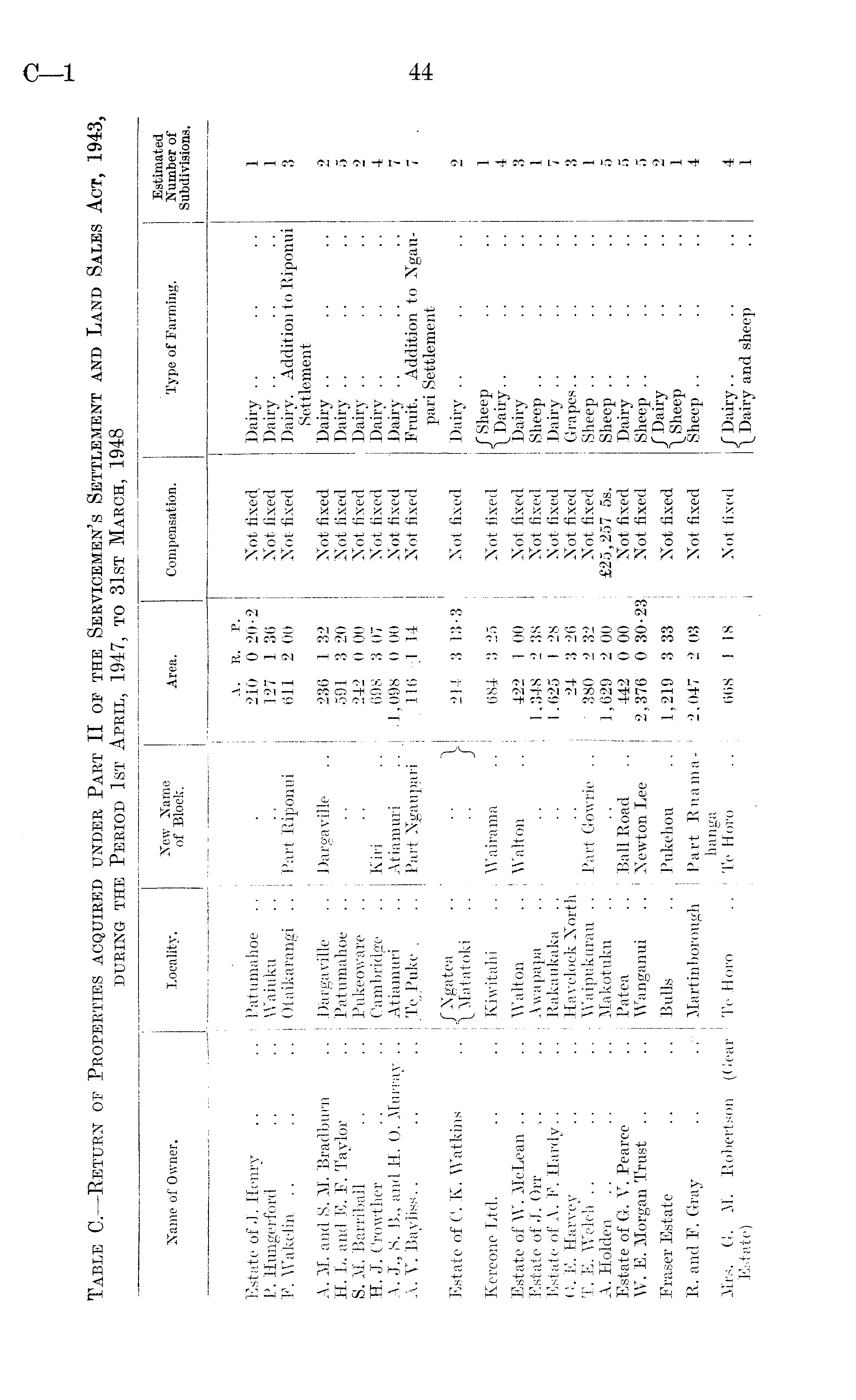 Name of Owner. Locality. New Name of Block. Area. Compensation. Type of Farming. Estimated Number of Subdivisions. Estate of J. Henry P. Hungerfoi'd F. Wakelin A. M. and S. M. Bradburn H. L. and E. E. Taylor S. M. Barriball H. J. Crowther A. J., S. B., and H. 0. Murray .. A. V. Baylies. . Estate of 0. K. Watkins Kereone Ltd. Estate of W. McLean Estate of J. Orr Estate of A. P. Hardy G. E. Harvey T.E.Welch .. A. Holden .. Estate of G. V. Pearce W. E. Morgan Trust Eraser Estate R. and P. Gray Mrs. G. M. Robertson (Gear Estate) Patumahoe Waiuku Otaikarangi .. Dargaville Patumahoe Pukeoware Cambridge Atiamuri TePuke . /Ngatea \Matatoki Kiwitahi Walton Awapapa Rakaukaka Havelock North Waipukurau .. Makotuku Patea Wanganui Bulls Martinborough Te Horo Part Riponui Dargaville Kiri Atiamuri Part Ngaupari :: } Wairama Walton Part Gowrie .. Ball Road Newton Lee Pukehou Part Ruamahanga Te Horo A. R. P. 210 0 20-2 127 1 36. 611 2 00 236 1 32 591 . 3 20 242 0 00 698 3 07 .1,098 0 00 116 1 14 214 3 13-3 684 3 25 422 1 00 1,348 2 38 1,625 1 28 24 3 26 380 2 32 1,629 2 00 442 0 00 2,376 0 30-23 1,219 3 33 2,047 2 03 668 1 18 1 Not fixed Not fixed Not fixed Not fixed Not fixed Not fixed Not fixed Not fixed Not fixed Not fixed Not fixed Not fixed Not fixed Not fixed Not fixed Not fixed £25,257 5s. Not fixed Not fixed Not fixed Not fixed Not fixed Dairy Dairy Dairy. Addition to Riponui Settlement Dairy Dairy Dairy Dairy Dairy Fruit. Addition to Ngaupari Settlement Dairy .. J" Sheep \ Dairy Dairy Sheep Dairy Grapes Sheep Sheep Dairy Sheep /Dairy \Sheep Sheep .. / Dairy \ Dairy and sheep 1 1 3 2 5 2 4 7 7 . 2 1 4 3 1 7 3 1 5 5 5 2 1 4 4 1