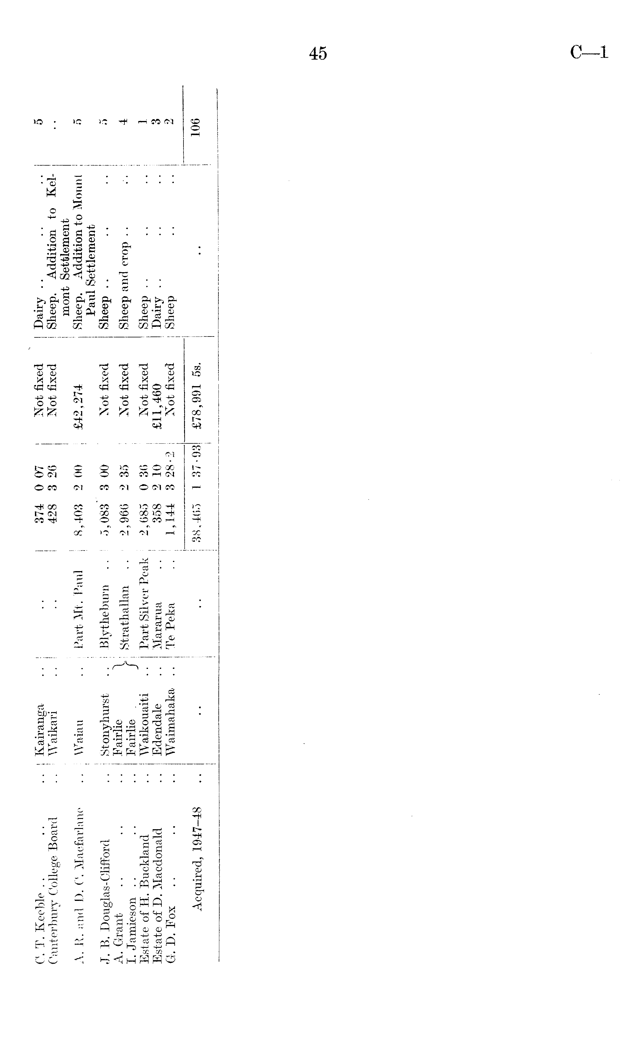 C. T. Keeble Canterbury College Board A. R. and D. C. Macfarlane J. B. Douglas-Clifford A. Grant I. Jamieson Estate of H. Buckland Estate of D. Macdonald G. D. Fox Acquired, 1947-48 Kairanga Waikari Waiau Stonyhurst Fair lie \ Fairlie . J* Waikouaiti Edendale Waimahaka .. "Part Mt. Paul Blytheburn .. Strathallan Part Silver Peak Mararua Te Peka 374 0 07 428 3 26 8,403 2 00 5,083' 3 00 2,960 2 35 2,685 0 36 358 2 10 1,144 3 28-2 Not fixed Not fixed £42,274 Not fixed Not fixed Not fixed £11,460 Not fixed Dairy Sheep. Addition to Kelmont Settlement Sheep. Addition to Mount Paul Settlement Sheep Sheep and crop Sheep Dairy Sheep 5 5 5 4 1 3 2 38,465 1 37-93 £78,991 5s. 106