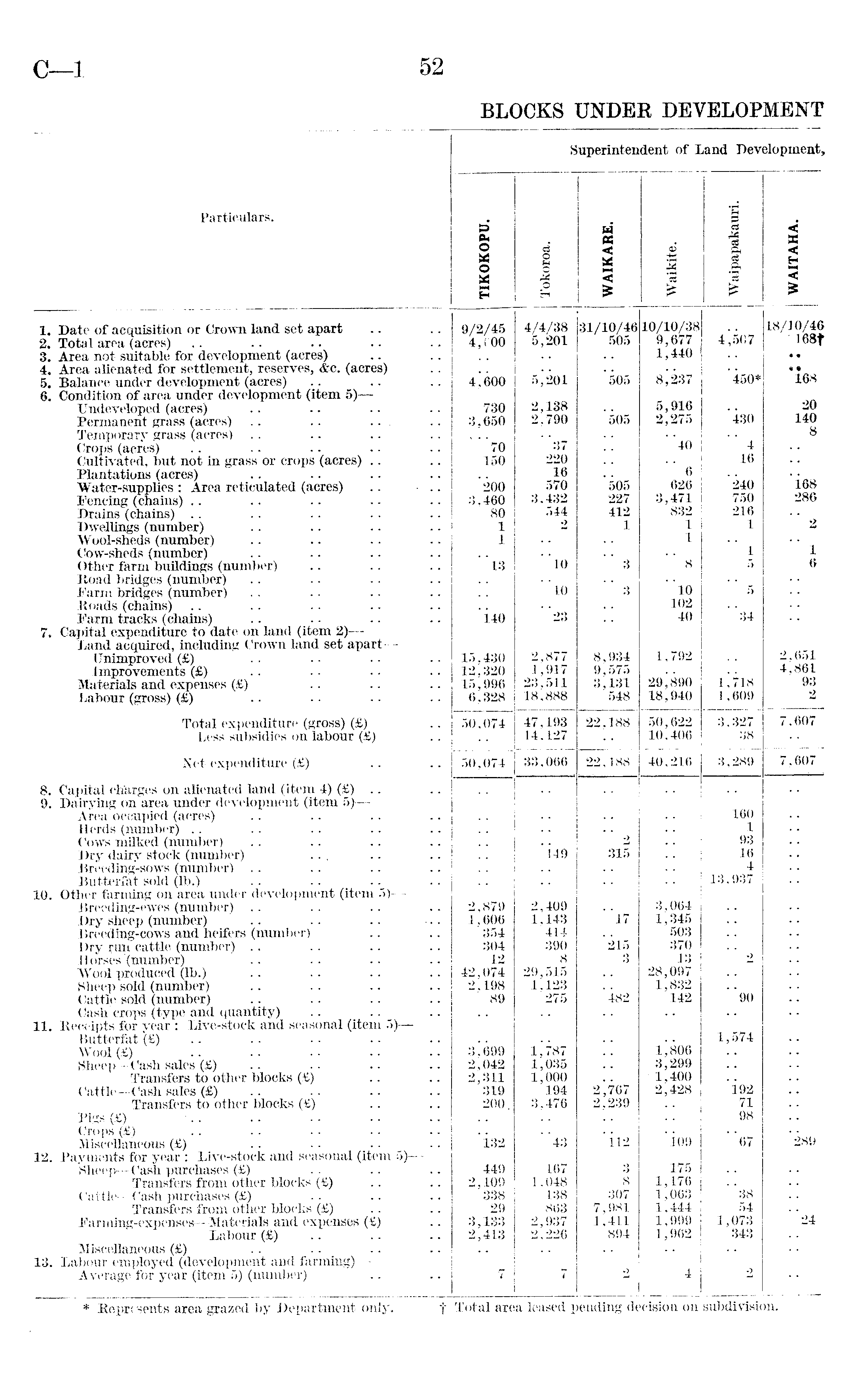 S uperinten dent of I ,and Dev elopment, Particulars. w •ri 0 < S> a ft. « is K © eS < & < X o V o c >s X s % < X H o is £ I J 1. Date of acquisition or Crown land set apart 9/2/45 4/4/38 31/10/46 10/10/38 18/10/46 2. Total area (acres) 4,(00 5,201 505 9,677 4 ,o07 168f 3. Area not suitable for development (acres) 1,440 •» 4. Area alienated for settlement, reserves, &c. (acres) • • 5. Balance under development (acres) 4^600 5,201 *505 8*237 450* 168 6. Condition of area under development (item 5) — 2,138 5,916 20 Undeveloped (acres) .. .. .. 730 430 Permanent grass (acres) .. .. ... 3,650 2,790 505 2,275 140 Temporary grass (acres) .. .. .. "40 8 Crops (acres) '' 70 37 4 Cultivated, but not in grass or crops (acres) 150 220 6 16 Plantations (acres) 16 240 'i68 Water-supplies : Area reticulated (acres) .. ■ .. 200 570 505 626 Fencing (chains) 3,460 3,432 227 3,471 750 286 Drains (chains) 80 544 412 832 216 Dwellings (number) 1 2 1 1 1 2 Wool-sheds (number) 1 1 Cow-sheds (number) 1 1 Other farm buildings (number) 13 ' 10 3 8 5 6 Road bridges (number) "10 "lO Farm bridges (number) 3 5 Roads (chains) 102 Farm tracks (chains) i.40 ' 23 40 34 7. Capital expenditure to date on land (item 2) — Land acquired, including Crown land set apart— 1,792 2,651 Unimproved (£) 15,430 2,877 8,934 Improvements (£) 12,320 1,917 9,575 29^890 4,861 Materials and expenses (£) 15,996 23,511 3,131 1 j 718 93 Labour (gross) (£) 6,328 18,888 ' 548 18,940 1,609 2 Total expenditure (gross) (£) 50,074 47,193 22,188 50,622 3,327 7,607 Less subsidies on labour (£) 14.127 10,406 38 Net expenditure (£) 50,074 33,066 22,188 40,216 3,289 7,607 8. Capital charges on alienated land (item 4) (£) .. 9. Dairying on area under development (item 5) — 160 Area occupied (acres) .. .. .. Herds (number) 1 Cows milked (number) 2 93 Dry dairy stock (number) 'i49 315 16 Breeding-sows (number) .. .. .. .. 4 Butterfat sold (lb.) 13,937 10. Other farming on area under development (item 5) — Breeding-ewes (number) 2,879 2,409 3,064 Dry sheep (number) 1,606 1,143 ' 17 1,345 Breeding-cows and heifers (number) 354 414 503 Dry run cattle (number) 304 390 '215 370 Horses (number) 12 8 3 13 2 Wool produced (lb.) 42,074 29,515 28,097 Sheep sold (number) 2,198 1,123 1,832 Cattle sold (number) 89 275 '482 142 ' '90 Cash crops (type and quantity) 11. Receipts for year : Live-stock and seasonal (item 5) — Butterfat (£) 1,574 Wool (£) 3^699 1,787 ■ 1^806 Sheep—Cash sales (£) 2,042 1,035 3,299 Transfers to other blocks (£) 2,311 1,000 1,400 Cattle —Cash sales (£) 319 194 2',767 2,428 192 Transfers to other blocks (£) 200. 3,476 2,239 .71 Pigs (£) 98 Crops (£) ' 67 '289 Miscellaneous (£) "i32 ' 43 "ll2 io9 12. Payments for year : Live-stock and seasonal (item 5) — Sheep—Cash purchases (£) 449 167 3 175 Transfers from other blocks (£) 2,109 1,048 8 1,176 Cattle—Cash purchases (£) 338 138 307 1,063 "38 Transfers from other blocks (£) 29 863 7,981 1,444 54 Farming-expenses—Materials and expenses (£) 3,133 2,937 1,411 1,999 1,073 "24 Labour (£) 2,413 2,226 894 1,962 343 Miscellaneous (£) 13. Labour employed (development and farming)— Average for year (item 5) (number) 7 7 2 4 2 * Represents area grazed by Department only. t Total area leased pending decision on subdivision.