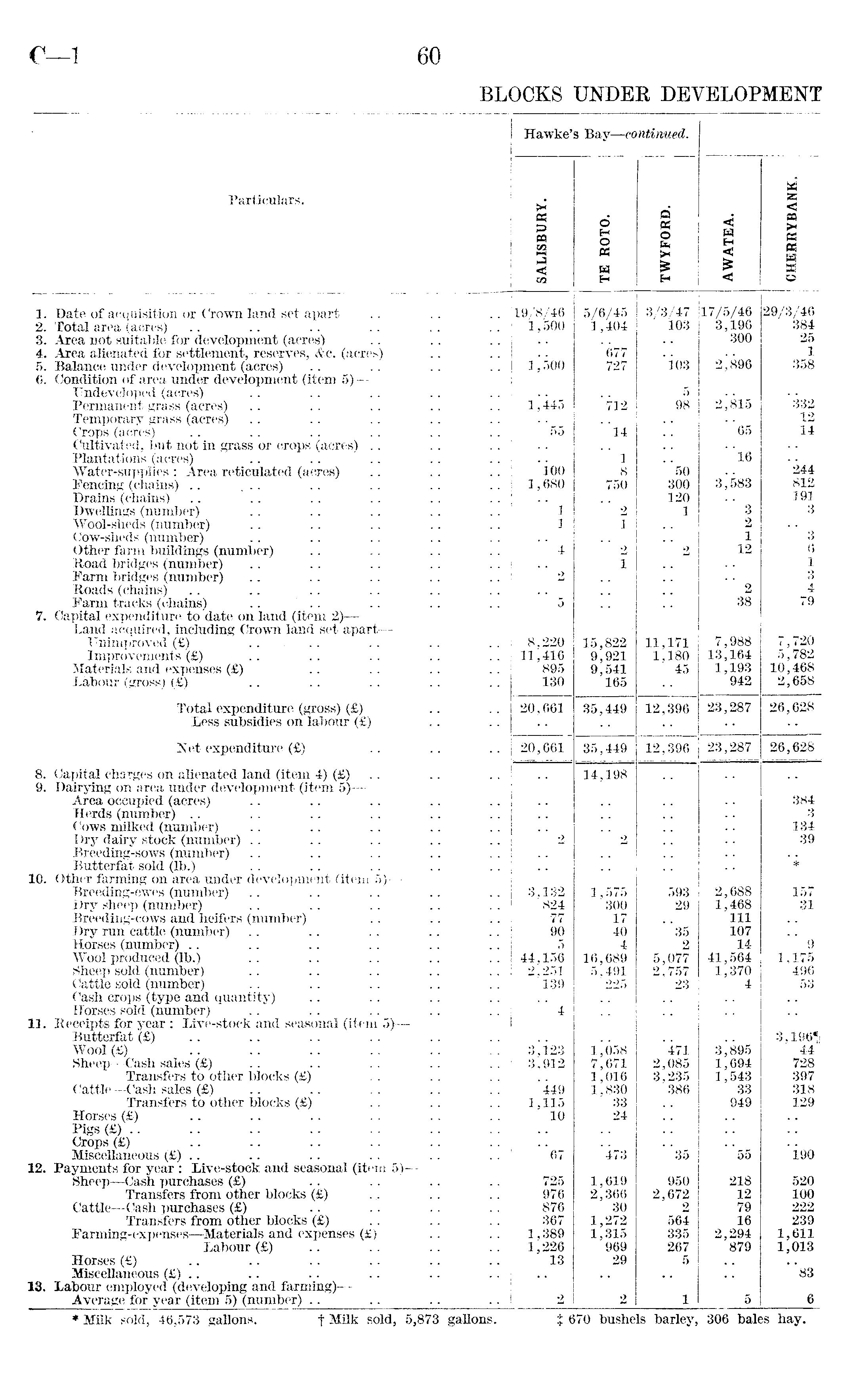Hawke' s Bay—continued. Particulars. SB < « o H O PS O « O fa > < H H < « SIps as H a < H £ oa EH < 0 1. Date of acquisition or Crown land set apart 19/8/46 5/6/45 3/3/47 17/5/46 29/3/46 2. Total area (acres) 1,500 1,404 103 3,196 384 3. Area not suitable for development (acres) 300 25 4. Area alienated for settlement, reserves, &c. (acres) 677 1 5. Balance under development (acres) i jsoo 727 io3 2^896 358 6. Condition of area under development (item 5) — Undeveloped (acres) 5 2," 815 332 Permanent grass (acres) 1,445 712 98 Temporary grass (acres) 65 12 Crops (acres) .. .. .. .. .. 55 ' 14 14 Cultivated, but not in grass or crops (acres) Plantations (acres) 1 ' "l6 Water-supplies : Area reticulated (acres) 'ioo 8 "50 244 Fencing (chains) .. ... 1,680 750 300 3," 583 812 Drains (chains) 120 191 Dwellings (number) 1 2 1 3 3 Wool-sheds (number) 1 1 2 Cow-sheds (number) 1 3 Other farm buildings (number) 4 2 2 12 6 Road bridges (number) .. .. .. .. 1 1 Farm bridges (number) 2 3 Roads (chains) .. .. .. .. .. • • 2 4 Farm tracks (chains) .. .. .. .. .. 5 38 79 7. Capital expenditure to date on land (item 2) — Land acquired, including Crown land set apart— Unimproved (£) .. .. 8,220 15,822 11,171 7,988 7,720 Improvements (£) .. .. .. .. 11,416 9,921 1,180 13,164 5,782 Materials and expenses (£) 895 9,541 45 1,193 10,468 Labour (gross) (£) 130 165 942 2,658 Total expenditure (gross) (£) 20,661 35,449 12,396 23,287 26,628 Less subsidies on labour (£) Net expenditure (£) 20,661 35,449 12,396 23,287 26,628 8. Capital charges on alienated land (item 4) (£) 14,198 9. Dairying on area under development (item 5) — Area occupied (acres) 384 Herds (number) 3 Cows milked (number) 134 Dry dairy stock (number) 2 2 39 Breeding-sows (number) Butterfat sold (lb.) * 10. Other farming on area under development (item 5) — Breeding-ewes (number) 3,132 1,575 593 2,688 157 Dry sheep (number) 824 300 29 1,468 31 Breeding-cows and heifers (number) 77 17 111 Dry run cattle (number) 90 40 "35 107 Horses (number) 5 4 2 14 9 Wool produced (lb.) .. .. .. .. 44,156 16,689 5,077 41,564 1,175 Sheep sold (number) 2,251 5,491 2,757 1,370 496 Cattle sold (number) 139 225 23 4 53 Cash crops (type and quantity) Horses sold (number) 4 11. Receipts for year : Live-stock and seasonal (item 5) — Butterfat (£) 3,1961 Wool (£) 3 j i23 1,058 '471 3,895 44 Sheep—Cash sales (£) 3,912 7,671 2,085 1,694 728 Transfers to other blocks (£) 1,016 3,235 1,543 397 Cattle —Cash sales (£) 449 1,830 386 33 318 Transfers to other blocks (£) 1,115 33 949 129 Horses (£) 10 24 Pigs (£) .. Crops (£) Miscellaneous (£) .. "67 '473 35 55 "i90 12. Payments for year : Live-stock and seasonal (item 5)— Sheep—Cash purchases (£) Transfers from other blocks (£) 725 1,619 950 218 520 976 2,366 2,672 12 100 Cattle—Cash purchases (£) 876 30 2 79 222 Transfers from other blocks (£) 367 1,272 564 16 239 Farming-expenses—Materials and expenses (£) 1,389 1,315 335 2,294 1,611 Labour (£) 1,226 969 267 879 1,013 Horses (£) .. .. .. .. .. 13 29 5 Miscellaneous (£) .. .. .. .. .. "83 13. Labour employed (developing and farming)— Average for year (item 5) (number) .. .. .. .. 1 2 2 1 5 6 ♦Milk sold, 46,573 gallons. t Milk sold, 5,873 gallons. % 670 bushels barley, 306 bales hay.