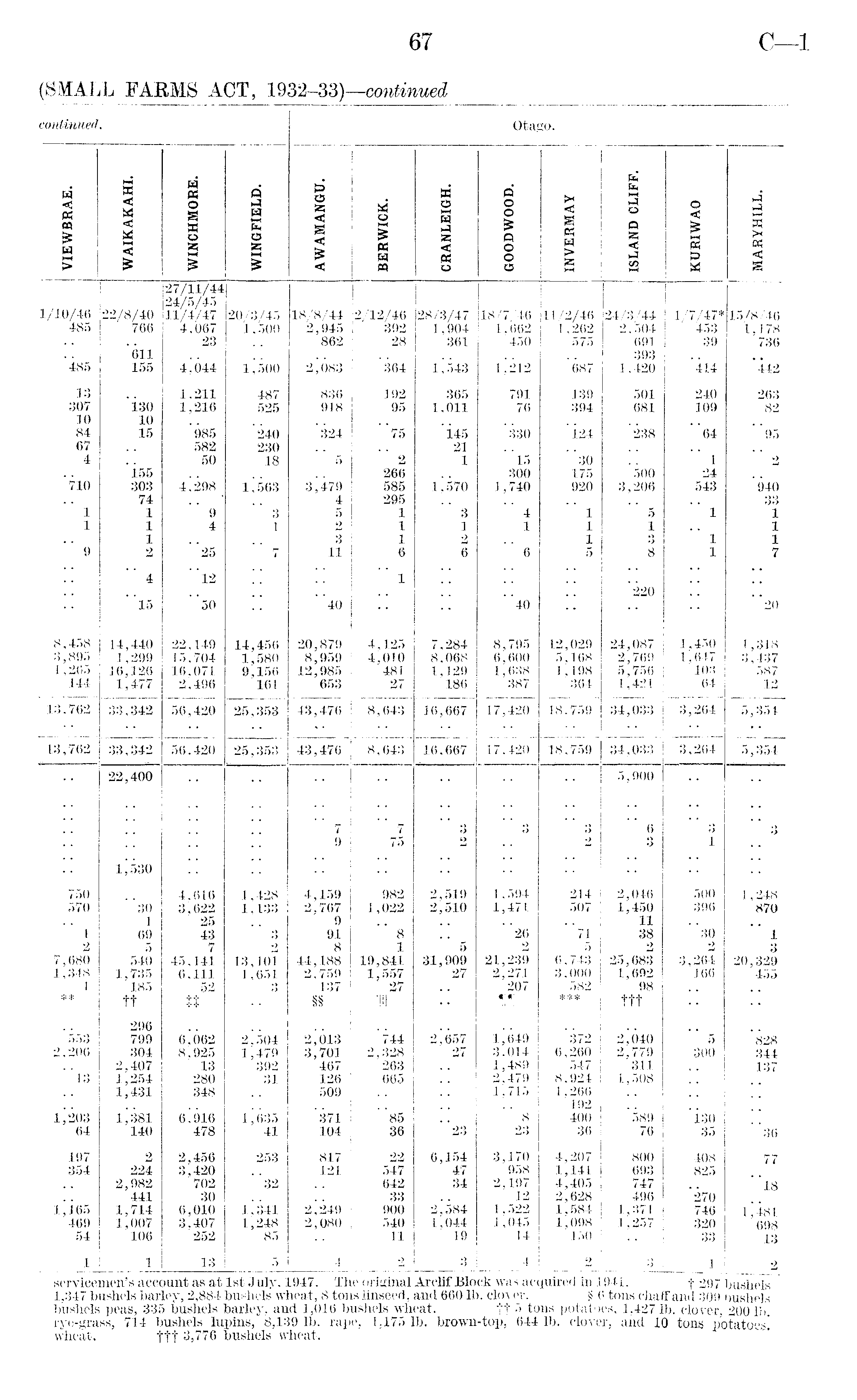 servicemen's account as at Ist July, 1947. The original Arclif Block was acquired in 1941. f 297 bushels 1,347 bushels barley, 2,884 bushels wheat, 8 tons linseed, and 660 lb. clover. § 6 tons chaff and 309 bushels bushels peas, 335 bushels barley, and 1,016 bushels wheat. "ft •> tons potatoes, 1,427 lb. clover, 200 lb. rye-grass, 714 bushels lupins, 8,139 lb. rape, 1,175 lb. brown-top, 644 lb. clover, and 10 tons potatoes! wheat. ttt 3,776 bushels wheat.