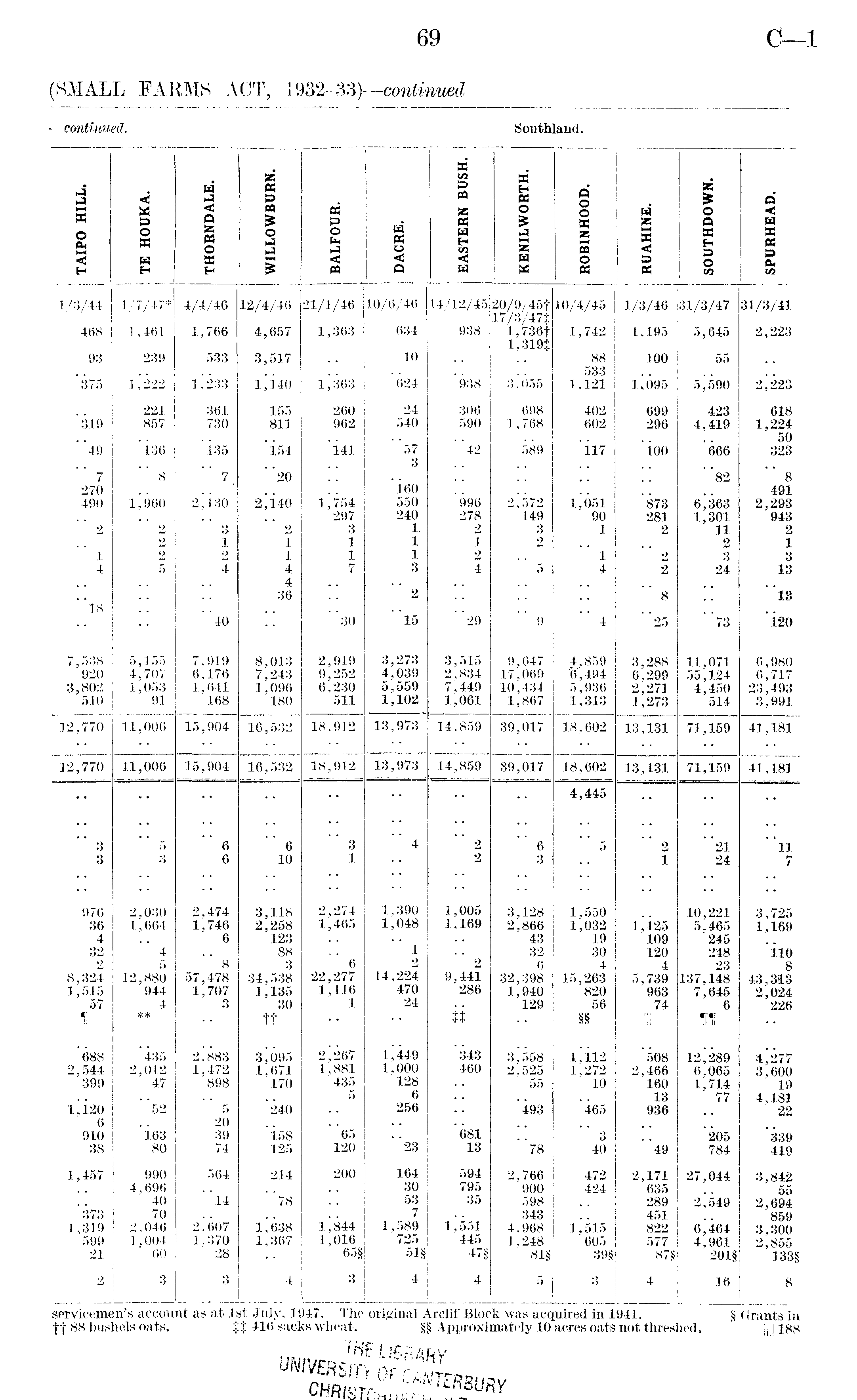 (SMALL FARMS ACT, 1932-33)—continued —continued. Southland. TAIPO HILL. < « p o W w H W < a 2 « 0 SB H US K P m £ 0 p $ as p 0 fc. p < « H » 0 < O SB 09 p « J6 « w H < W SB H K O jS j 2 W * Q O O SB as 3 0 05 H as SB < p « as is 0 Q SB H P O w O < » SB (6 P o, a> 1/3/44 468 93 *375 1/7/47* 1,461 239 1 222 4/4/46 1,766 533 1/233 12/4/46 4,657 3,517 1 jl40 21/1/46 1,363 lj363 10/6/46 634 10 624 14/12/45 938 938 20/9/45f 17/3/47+ l,736t 1,319{ 3,055 10/4/45 1,742 88 533 1,121 1/3/46 1,195 100 1,095 31/3/47 5,645 55 5,590 31/3/41 2,223 2,223 319 "49 221 857 "i36 361 730 i35 155 811 "i54 260 962 141 24 540 "57 3 "i60 550 240 1. 1 1 3 306 590 "42 698 1,768 589 402 602 ii7 699 296 ioo 423 4,419 '666 618 1,224 50 323 7 270 490 2 1 4 8 1^960 1 5 7. 2,i30 3 1 2 4 "20 2^140 1 1 4 297 3 1 1 7 996 278 2 1 2 4 2,572 149 3 2 5 1 jo51 90 1 1 4 '873 281 2 2 2 "82 1,301 11 2 3 24 " 8 491 2,293 943 2 1 3 13 "l8 40 36 "30 2 "l5 ' 29 9 4 8 ' '25 73 13 iao 7,538 920 ' 3,802 510 4'707 1,053 91 7,919 6,176 1,641 168 8,013 7,243 1,096 180 2,919 9,252 6,230 511 3,273 4,039 5,559 1,102 3,515 2,834 7,449 1,061 9,647 17,069 10,434 1,867 4,859 '6,494 5,936 1,313 3,288 6.299 2,271 1,273 11,071 55,124 4,450 514 6,980 6,717 23,4'93 3,991 12,770 11,006 15,904 16,532 18,912 13,973 14,859 39,017 18,602 13,131 71,159 41,181 12,770 11,006 15,904 16,532 18,912 13,973 14,859 39,017 18,602 13,131 71,159 41,181 4,445 3 3 5 3 " 6 6 6 10 3 1 4 " 2 2 " 6 3 5 2 1 "21 24 "ll 7 976 36 4 32 2 8,324 1,515 57 11 2,030 1,664 4 5 12,880 944 4 ** 2,474 1,746 6 8 . 57,478 1,707 3 3,118 2,258 123 88 3 34,538 1,135 30 tt 2,274 1,465 6 22,277 1,116 1 1,390 1,048 1 2 14,224 470 24 1,005 1,169 2 9,441 286 it 3,128 2,866 43 32 6 32,398 1,940 129 1,550 1,032 19 30 4 15,263 820 56 §§ M25 109 120 4 5,739 963 74 llll 10,221 5,465 245 248 23 137,148 7,645 6 n 3,725 1,169 iio 8 43,313 2,024 226 *688 2,544 399 6 910 38 435 2,012 47 52 163 80 1,472 898 5 20 39 74 3 jo95 1,671 170 '240 i58 125 1,881 435 5 "65 120 1 j 449 1,000 128 6 256 "23 343 460 681 13 3 j 558 2,525 55 '493 "78 i;m 1,272 10 465 " 3 40 508 2,466 160 13 936 "49 6,065 1,714 77 205 784 3,600 19 4,181 22 339 419 1,457 *373 599 21 990 4,696 40 70 2,046 1,004 60 564 "14 2 ] 607 1,370 28 214 ' '78 1,638 1,367 200 1,016 65§ 164 30 53 7 1,589 725 51§ 594 795 35 1 j 551 445 47§ 2,766 900 598 343 4,968 1,248 81§ 472 424 1 j 515 605 39§ 2,171 635 289 451 822 577 87§ 27,044 2^549 4,961 201§ 3,8*2 55 2,694 859 3,300 2,855 133§ 2 3 3 4 3 4 4 1 5 3 4 16 8 servicemen's account as at 1st July, 1947. The original Arclif Block was acquired in 1941. § Grants in ft 88 bushels oats. $$ 416 sacks wheat. §§ Approximately 10 acres oats not threshed. |||] 188 UN '^onZ^