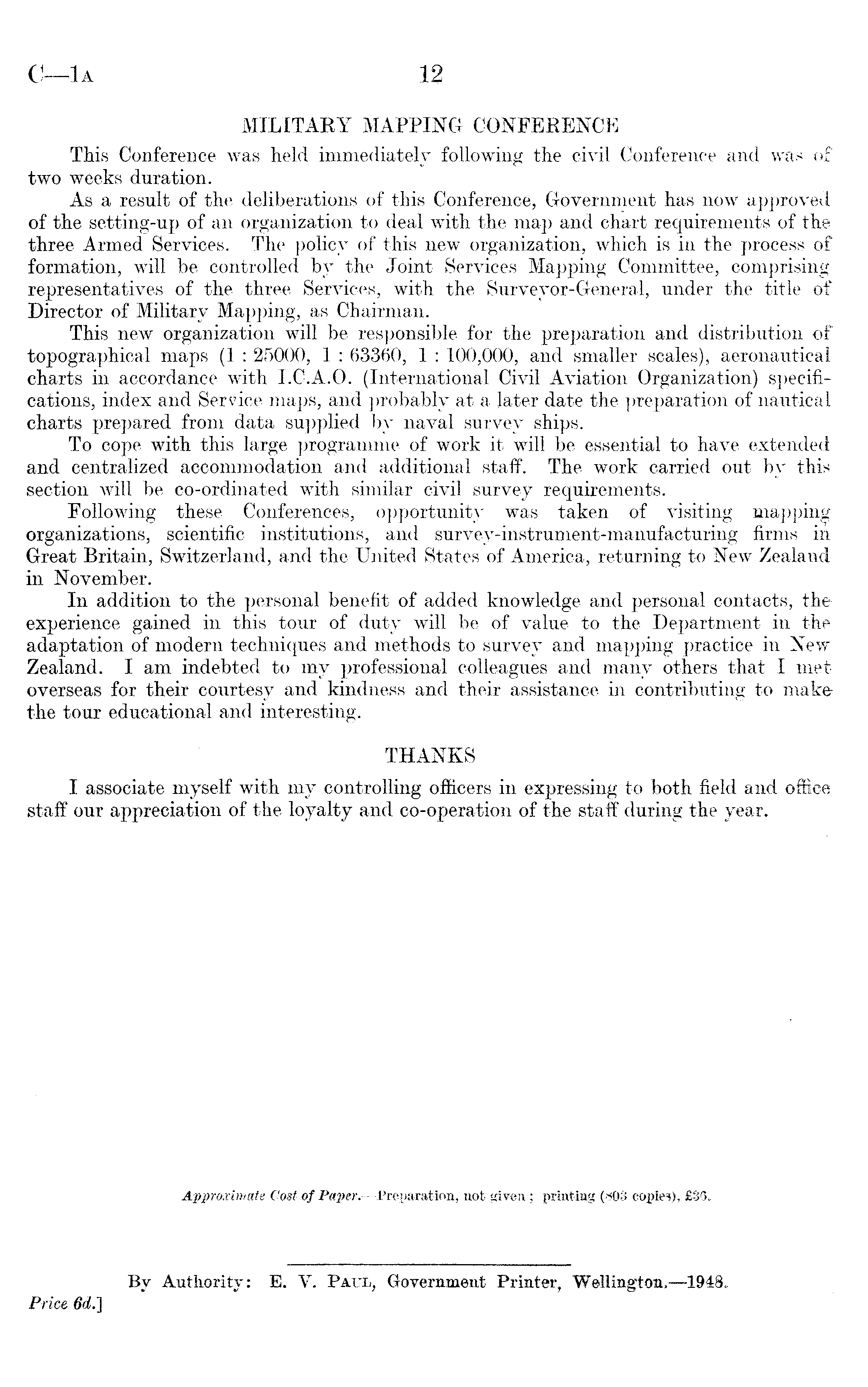 MILITAKY MAPPING CONFERENCE This Conference was held immediately following the civil Conference and was of two weeks duration. As a result of the deliberations of this Conference, Government has now approved of the setting-up of an organization to deal with the map and chart requirements of the three Armed Services. The policy of this new organization, which is in the process of formation, will be controlled by the Joint Services Mapping Committee, comprising representatives of the three Services, with the Surveyor-General, under the title of Director of Military Mapping, as Chairman. This new organization will be responsible for the preparation and distribution of topographical maps (1 : 25000, 1 : 63360, 1 : 100,000, and smaller scales), aeronautical charts in accordance with 1.C.A.0. (International Civil Aviation Organization) specifications, index and Service maps, and probably at a later date the preparation of nautical charts prepared from data supplied by naval survey ships. To cope with this large programme of work it will be essential to have extended and centralized accommodation and additional staff. The work carried out by this section will be co-ordinated with similar civil survey requirements. Following these Conferences, opportunity was taken of visiting mapping organizations, scientific institutions, and survey-instrument-manufacturing firms in Great Britain, Switzerland, and the United States of America, returning to New Zealand in November. In addition to the personal benefit of added knowledge and personal contacts, the experience gained in this tour of duty will be of value to the Department in the adaptation of modern techniques and methods to survey and mapping practice in New Zealand. I am indebted to my professional colleagues and many others that I met overseas for their courtesy and kindness and their assistance in contributing to make the tour educational and interesting. THANKS I associate myself with my controlling officers in expressing to both field and office staff our appreciation of the loyalty and co-operation of the staff during the year. . Approximate Cost of Paper. —Preparation, not given ; printing (803 copie-s), £36.