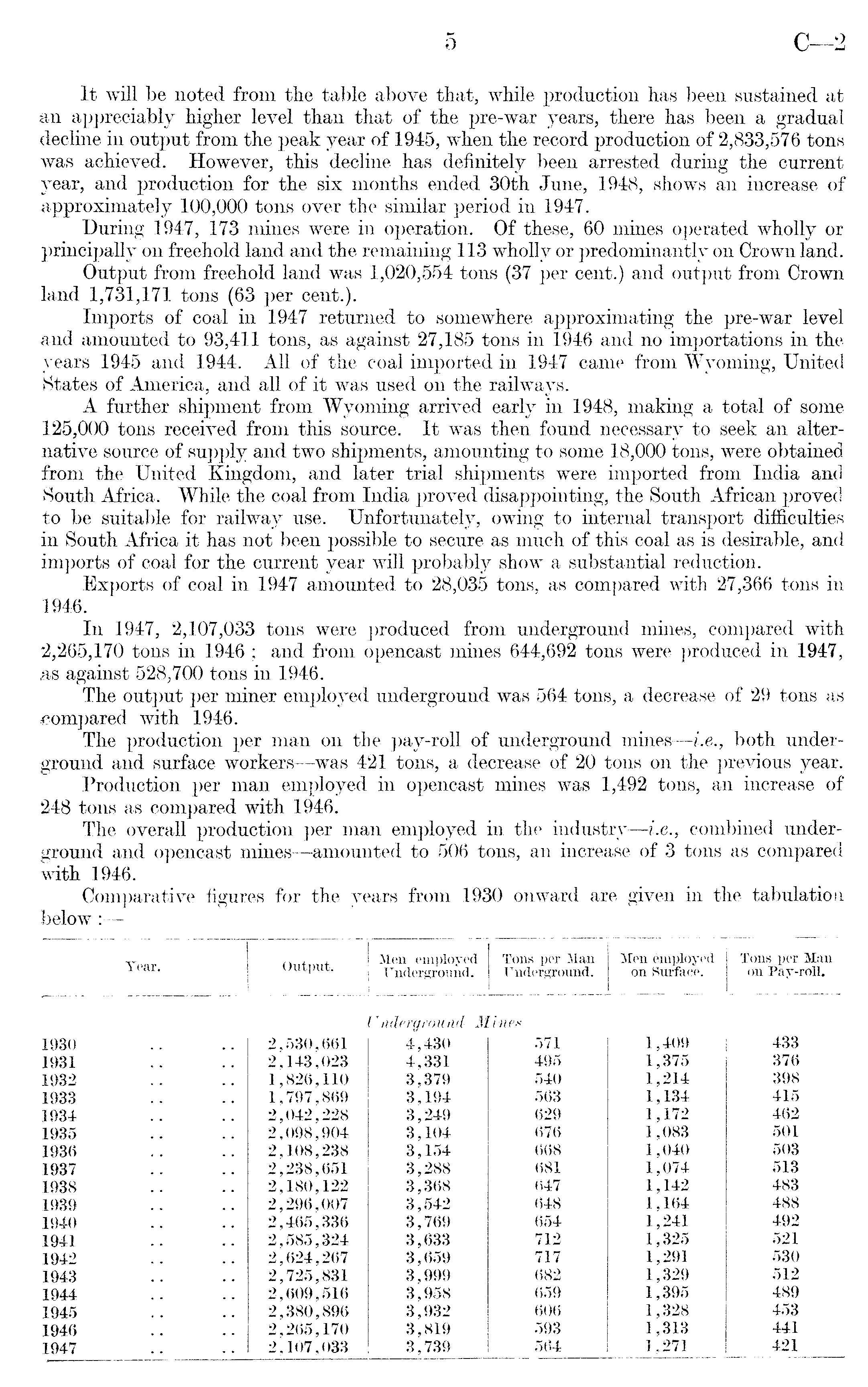 It will be noted from the table above that, while production has been sustained at an appreciably higher level than that of the pre-war years, there has been a gradual decline in output from the peak year of 1945, when the record production of 2,833,576 tons was achieved. However, this decline has definitely been arrested during the current year, and production for the six months ended 30th June, 1948, shows an increase of approximately 100,000 tons over the similar period in 1947. During 1947, 173 mines were in operation. Of these, 60 mines operated wholly or principally on freehold land and the remaining 113 wholly or predominantly on Crown land. Output from freehold land was 1,020,554 tons (37 per cent.) and output from Crown land 1,731,171 tons (63 jjer cent.). Imports of coal in 1947 returned to somewhere approximating the pre-war level and amounted to 93,411 tons, as against 27,185 tons in 1946 and no importations in the years 1945 and 1944. All of the coal imported in 1947 came from Wyoming, United States of America, and all of it was used on the railways. A further shipment from Wyoming arrived early in 1948, making a total of some 125,000 tons received from this source. It was then found necessary to seek an alternative source of supply and two shipments, amounting to some 18,000 tons, were obtained from the United Kingdom, and later trial shipments were imported from India and South Africa. While the coal from India proved disappointing, the South African proved to be suitable for railway use. Unfortunately, owing to internal transport difficulties in South Africa it has not been possible to secure as much of this coal as is desirable, and imports of coal for the current year will probably show a substantial reduction. Exports of coal in 1947 amounted to 28,035 tons, as compared with 27,366 tons in 1946. In 1947, 2,107,033 tons were produced from underground mines, compared with 2,265,170 tons in 1946 ; and from opencast mines 644,692 tons were produced in 1947, as against 528,700 tons in 1946. The output per miner employed underground was 564 tons, a decrease of 29 tons as compared with 1946. The production per man on the pay-roll of underground mines—i.e., both underground and surface workers —was 421 tons, a decrease of 20 tons on the previous year. Production per man employed in opencast mines was 1,492 tons, an increase of 248 tons as compared with 1946. The overall production per man employed in the industry—-i.e., combined underground and opencast mines—amounted to 506 tons, an increase of 3 tons as compared with 1946.