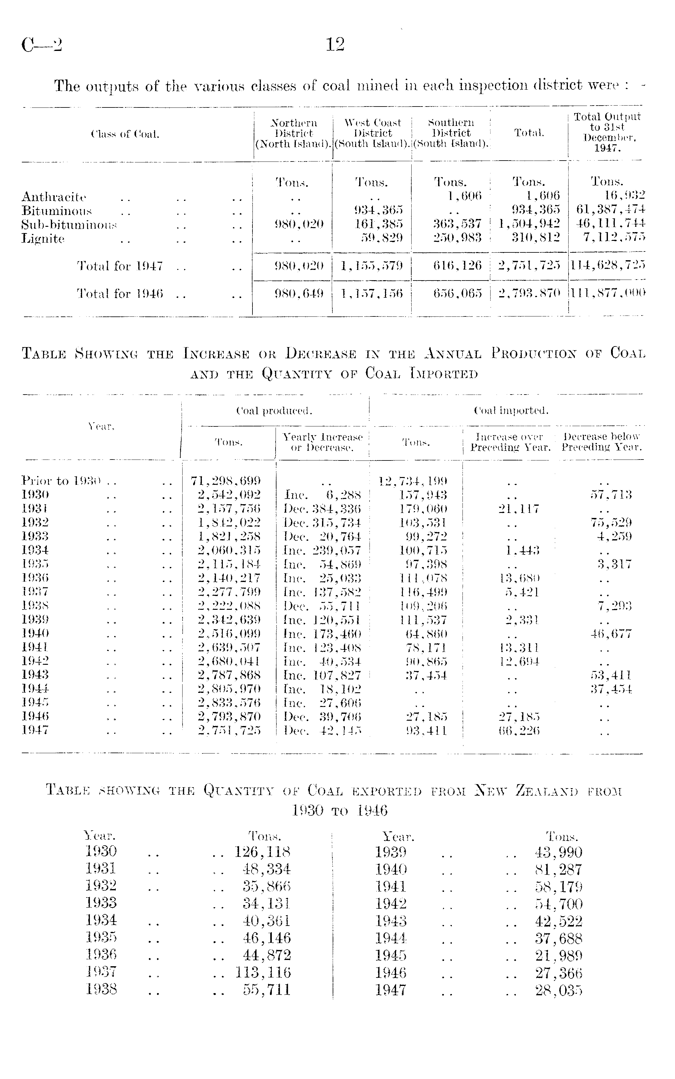 Table showing the Quantity of Coal exported prom New Zealand from 1930 to 1946