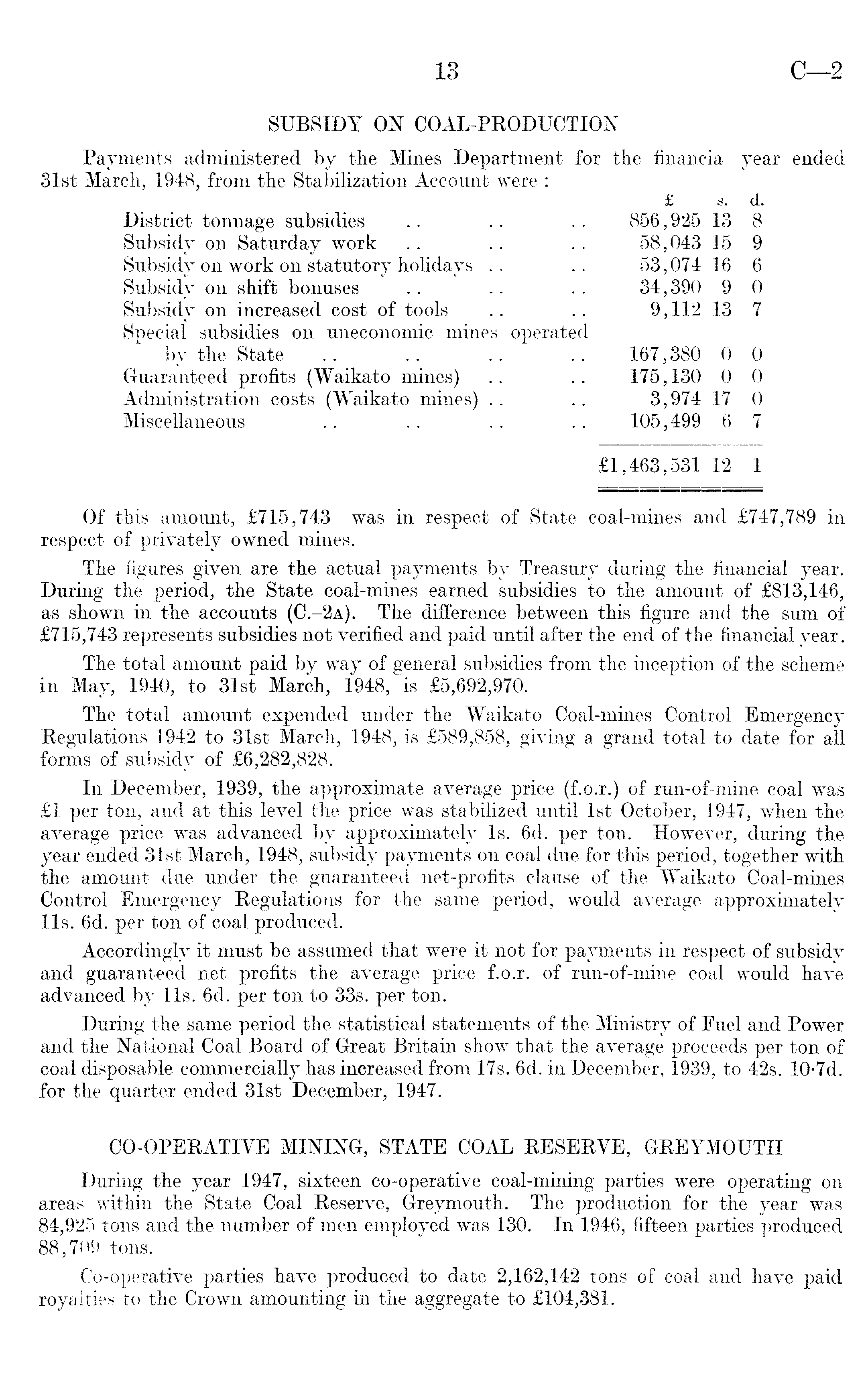 Payments administered by the Mines Department for the financia year ended 31st March, 1948, from the Stabilization Account were : £ s. d. District tonnage subsidies .. .. .. 856,925 13 8 Subsidy on Saturday work .. .. .. 58,043 15 9 Subsidy on work on statutory holidays .. .. 53,074 16 6 Subsidy on shift bonuses .. .. .. 34,390 9 0 Subsidy on increased cost of tools .. .. 9,112 13 7 Special subsidies on uneconomic mines operated by the State .. .. .. .. 167,380 0 0 Guaranteed profits (Waikato mines) .. .. 175,130 0 0 Administration costs (Waikato mines) .. .. 3,974 17 0 Miscellaneous .. .. .. .. 105,499 6 7 £1,463,531 12 1 Of this amount, £715,743 was in respect of State coal-mines and £747,789 in respect of privately owned mines. The figures given are the actual payments by Treasury during the financial year. During the period, the State coal-mines earned subsidies to the amount of £813,146, as shown in the accounts (C.-2a). The difference between this figure and the sum of £715,743 represents subsidies not verified and paid until after the end of the financial year. The total amount paid by way of general subsidies from the inception of the scheme in May, 1940, to 31st March, 1948, is £5,692,970. The total amount expended under the Waikato Coal-mines Control Emergency Regulations 1942 to 31st March, 1948, is £589,858, giving a grand total to date for all forms of subsidy of £6,282,828. In December, 1939, the approximate average price (f.0.r.) of run-of-mine coal was £1 per ton, and at this level the price was stabilized until Ist October, 1947, when the average price was advanced by approximately Is. 6d. per ton. However, during the year ended 31st March, 1948, subsidy payments on coal due for this period, together with the amount due under the guaranteed net-profits clause of the Waikato Coal-mines Control Emergency Regulations for the same period, would average approximately lis. 6d. per ton of coal produced. Accordingly it must be assumed that were it not for payments in respect of subsidy and guaranteed net profits the average price f.o.r. of run-of-mine coal would have advanced by lis. 6d. per ton to 335. per ton. During the same period the statistical statements of the Ministry of Fuel and Power and the National Coal Board of Great Britain show that the average proceeds per ton of coal disposable commercially has increased from 17s. 6d. in December, 1939, to 425. 10-7 d. for the quarter ended 31st December, 1947. CO-OPERATIVE MINING, STATE COAL RESERVE, GREYMOUTH During the year 1947, sixteen co-operative coal-mining parties were operating on areas within the State Coal Reserve, Grey mouth. The production for the year was 84,925 tons and the number of men employed was 130. In 1946, fifteen parties produced 88,709 tons. Co-operative parties have produced to date 2,162,142 tons of coal and have paid royalties to the Crown amounting in the aggregate to £104,381.