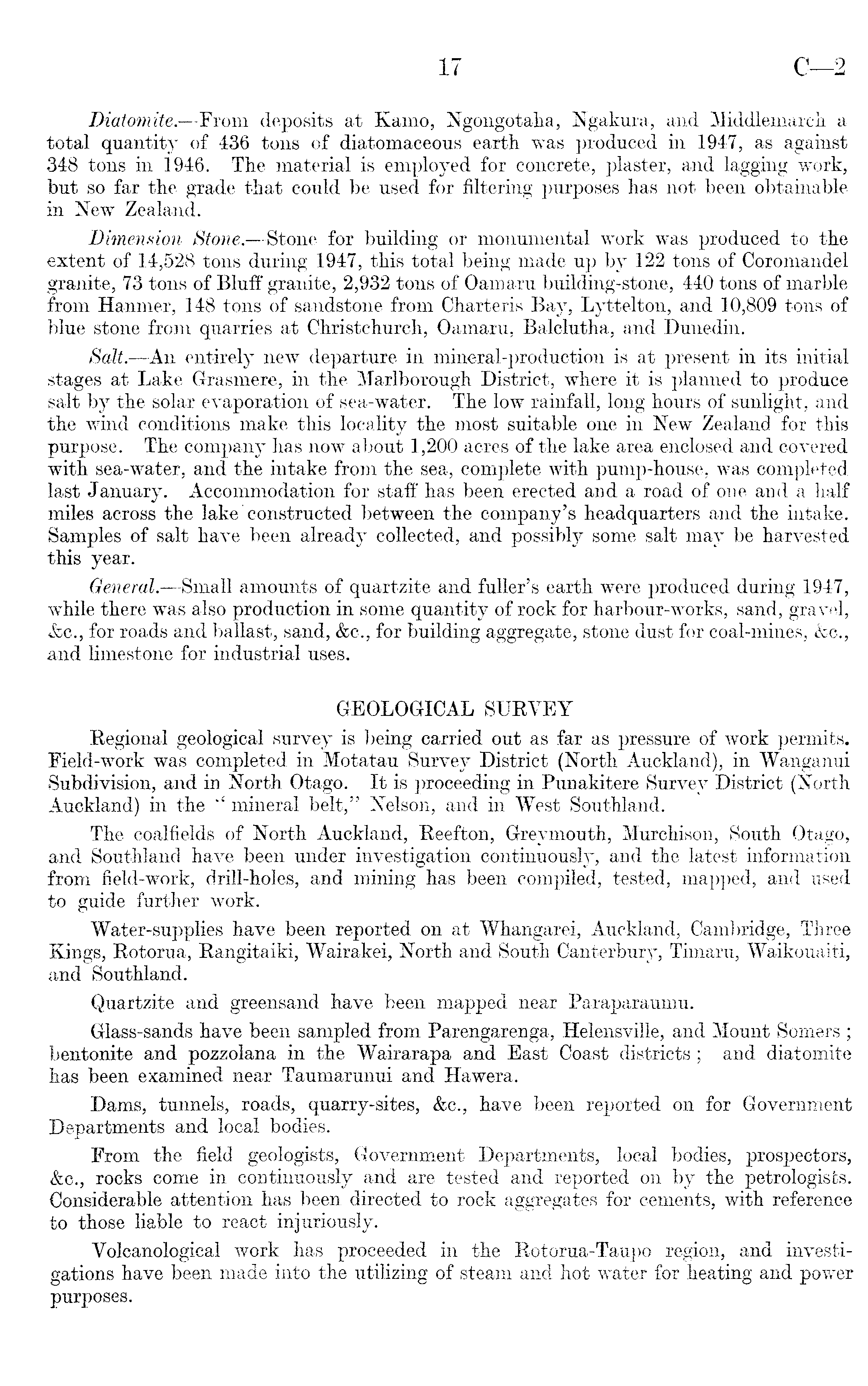 Diatomite. —From deposits at Kamo, Ngongotaha, Ngakura, and Middlemarcli a total quantity of 436 tons of diatomaceous earth was produced in 1947, as against 348 tons in 1946. The material is employed for concrete, plaster, and lagging work, but so far the grade that could be used for filtering purposes has not been obtainable in New Zealand. Dimension Stone.—Stone for building or monumental work was produced to the extent of 14,528 tons during 1947, this total being made up by 122 tons of Coromandel granite, 73 tons of Bluff granite, 2,932 tons of Oamaru building-stone, 440 tons of marble from Hammer, 148 tons of sandstone from Charteris Bay, Lyttelton, and 10,809 tons of blue stone from quarries at Christchurch, Oamaru, Balclutha, and Dunedin. Salt.—An entirely new departure in mineral-production is at present in its initial stages at Lake Grasmere, in the Marlborough District, where it is planned to produce salt by the solar evaporation of sea-water. The low rainfall, long hours of sunlight, and the wind conditions make this locality the most suitable one in New Zealand for this purpose. The company has now about 1,200 acres of the lake area enclosed and covered with sea-water, and the intake from the sea, complete with pump-house, was completed, last January. Accommodation for staff has been erected and a road of one and a half miles across the lake constructed between the company's headquarters and the intake. Samples of salt have been already collected, and possibly some salt may be harvested this year. General. —Small amounts of quartzite and fuller's earth were produced during 1947, while there was also production in some quantity of rock for harbour-works, sand, gravel, &c., for roads and ballast, sand, &c., for building aggregate, stone dust for coal-mines, &c., and limestone for industrial uses. GEOLOGICAL SURVEY Regional geological survey is being carried out as far as pressure of work permits. Field-work was completed in Motatau Survey District (North Auckland), in Wanganui Subdivision, and in North Otago. It is proceeding in Punakitere Survey District (North Auckland) in the " mineral belt," Nelson, and in West Southland. The coalfields of North Auckland, Reefton, Greymouth, Murchison, South Otago, and Southland have been under investigation continuously, and the latest information from field-work, drill-holes, and mining has been compiled, tested, mapped, and used to guide further work. Water-supplies have been reported on at Whangarei, Auckland, Cambridge, Three Kings, Rotorua, Rangitaiki, Wairakei, North and South Canterbury, Timaru, Waikouaiti, and Southland. Quartzite and greensand have been mapped near Paraparaumu. Glass-sands have been sampled from Parengarenga, Helensville, and Mount Somers ; bentonite and pozzolana in the Wairarapa and East Coast districts ; and diatomite has been examined near Taumarunui and Hawera. Dams, tunnels, roads, quarry-sites, &c., have been reported on for Government Departments and local bodies. From the field geologists, Government Departments, local bodies, prospectors, &c., rocks come in continuously and are tested and reported on by the penologists. Considerable attention has been directed to rock aggregates for cements, with reference to those liable to react injuriously. Volcanological work has proceeded in the Rotorua-Taupo region, and investigations have been made into the utilizing of steam and hot water for heating and power purposes.