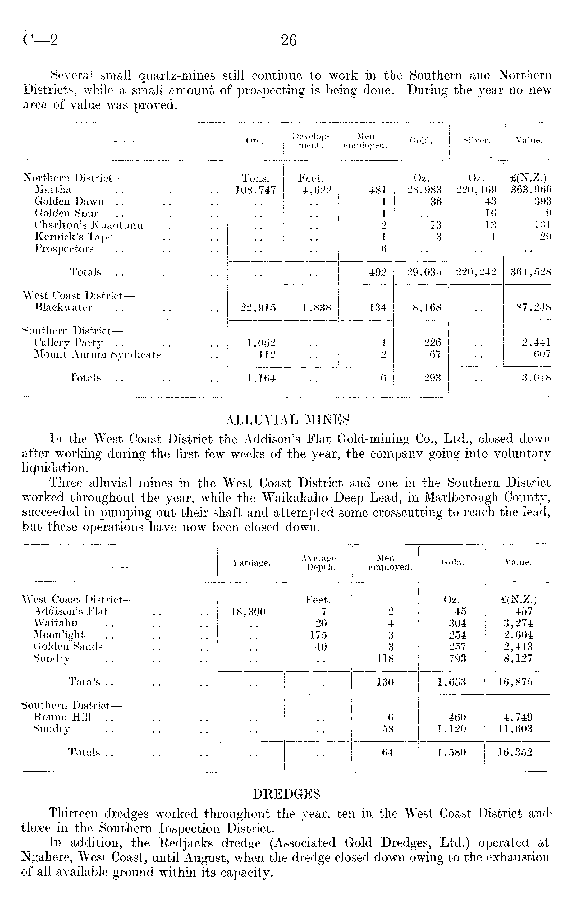 Three alluvial mines in the West Coast District and one in the Southern District worked throughout the year, while the Waikakaho Deep Lead, in Marlborough County, succeeded in pumping out their shaft and attempted some crosscutting to reach the lead, but these operations have now been closed down.