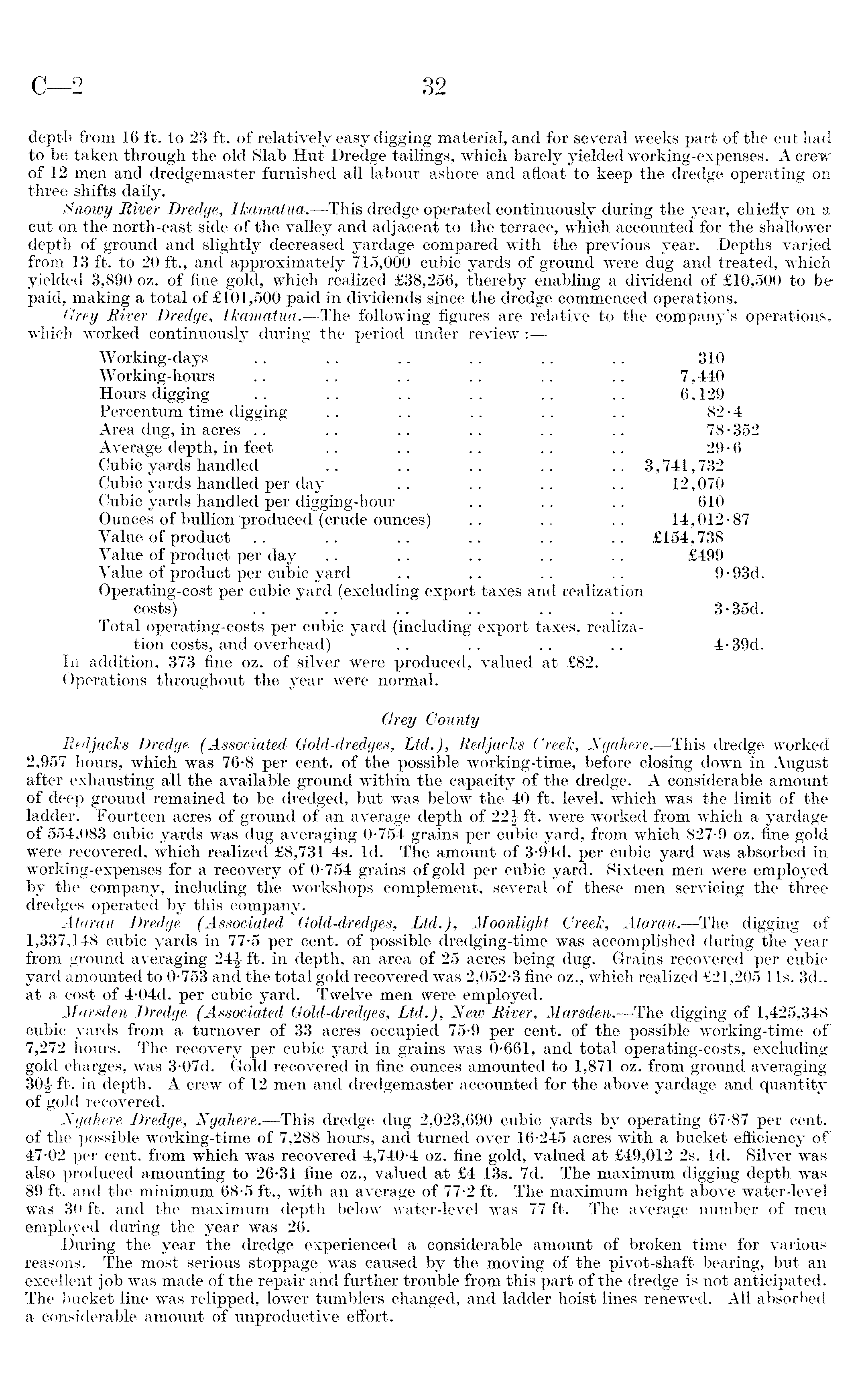 depth from 16 ft. to 23 ft. of relatively easy digging material, and for several weeks part of the cut had to be taken through the old Slab Hut Dredge tailings, which barely yielded working-expenses. A crew of 12 men and dredgemaster furnished all labour ashore and afloat to keep the dredge operating on three shifts daily. Snowy River Dredge,, Ikamatua. —This dredge operated continuously during the year, chiefly on a cut on the north-east side of the valley and adjacent to the terrace, which accounted for the shallower depth of ground and slightly decreased yardage compared with the previous year. Depths varied from 13 ft. to 20 ft., and approximately 715,000 cubic yards of ground were dug and treated, which yielded 3,890 oz. of fine gold, which realized £38,256, thereby enabling a dividend of £10,500 to be paid, making a total of £101,500 paid in dividends since the dredge commenced operations. Grey River Dredge, Ikamatua.—The following figures are relative to the company's operations, which worked continuously during the period Tinder review:— Working-days .. .. .. . . .. .. 310 Working-hours .. .. .. .. .. .. 7,440 Hours digging .. .. .. .. .. .. 6,129 Percentum time digging .. .. .. .. .. 82-4 Area dug, in acres .. .. .. .. .. .. 78-352 Average depth, in feet .. . . .. .. .. 29-6 Cubic yards handled .. .. .. .. .. 3,741,732 Cubic yards handled per day .. .. .. .. 12,070 Cubic yards handled per digging-hour .. .. .. 610 Ounces of bullion produced (crude ounces) .. .. .. 14,012-87 Value of product .. .. .. .. . . .. £154,738 Value of product per day .. .. .. .. .. £499 Value of product per cubic yard .. .. .. .. 9-93 d. Operating-cost per cubic yard (excluding export taxes and realization costs) .. .. .. .. .. .. 3-35 d. Total operating-costs per cubic yard (including export taxes, realization costs, and overhead) .. .. .. .. 4-39 d. In addition, 373 fine oz. of silver were produced, valued at £B2. Operations throughout the year were normal. Grey County Redjacks Dredge (Associated Gold-dredges, Ltd.), Redjacks Creek, Ngahere.—This dredge worked 2,957 hours, which was 76-8 per cent, of the possible working-time, before closing down in August after exhausting all the available ground within the capacity of the dredge. A considerable amount of deep ground remained to be dredged, but was below the 40 ft. level, which was the limit of the ladder. Fourteen acres of ground of an average depth of 22|- ft. were worked from which a yardage of 554,083 cubic yards was dug averaging 0-754 grains per ciibic yard, from which 827-9 oz. fine gold were recovered, which realized £8,731 4s. Id. The amount of 3-94 d. per cubic yard was absorbed in working-expenses for a recovery of 0-754 grains of gold per cubic yard. Sixteen men were employed by the company, including the workshops complement, several of these men servicing the three dredges operated by this company. Atarau Dredge (Associated Gold-dredges, Ltd.), Moonlight Creek, Atarau.—The digging of 1,337,148 cubic yards in 77-5 per cent, of possible dredging-time was accomplished during the year from ground averaging 24| ft. in depth, an area of 25 acres being dug. Grains recovered per cubic yard amounted to 0-753 and the total gold recovered was 2,052-3 fine oz., which realized £21,205 1 Is. 3d., at a cost of 4-04 d. per cubic yard. Twelve men were employed. Marsden Dredge (Associated Gold-dredges, Ltd.), New River, Marsden.—The digging of 1,425,348 cubic yards from a turnover of 33 acres occupied 75-9 per cent, of the possible working-time of 7,272 hours. The recovery per cubic yard in grains was 0-661, and total operating-costs, excluding gold charges, was 3-07 d. Gold recovered in fine ounces amounted to 1,871 oz. from ground averaging ft. in depth. A crew of 12 men and dredgemaster accounted for the above yardage and quantitv of gold recovered. Ngaliere Dredge, Ngahere.—This dredge dug 2,023,690 cubic yards by operating 67-87 per cent, of the possible working-time of 7,288 hours, and turned over 16-245 acres with a bucket efficiency of 47-02 per cent, from which was recovered 4,740-4 oz. fine gold, valued at £49,012 2s. Id. Silver was also produced amounting to 26-31 fine oz., valued at £4 13s. 7d. The maximum digging depth was 89 ft. and the minimum 68-5 ft., with an average of 77-2 ft. The maximum height above water-level was 30 ft. and the maximum depth below water-level was 77 ft. The average number of men employed during the year was 26. During the year the dredge experienced a considerable amount of broken time for various reasons. The most serious stoppage was caused by the moving of the pivot-shaft bearing, but an excellent job was made of the repair and further trouble from this part of the dredge is not anticipated. The bucket line was relipped, lower tumblers changed, and ladder hoist lines renewed. All absorbed a considerable amount of unproductive effort.