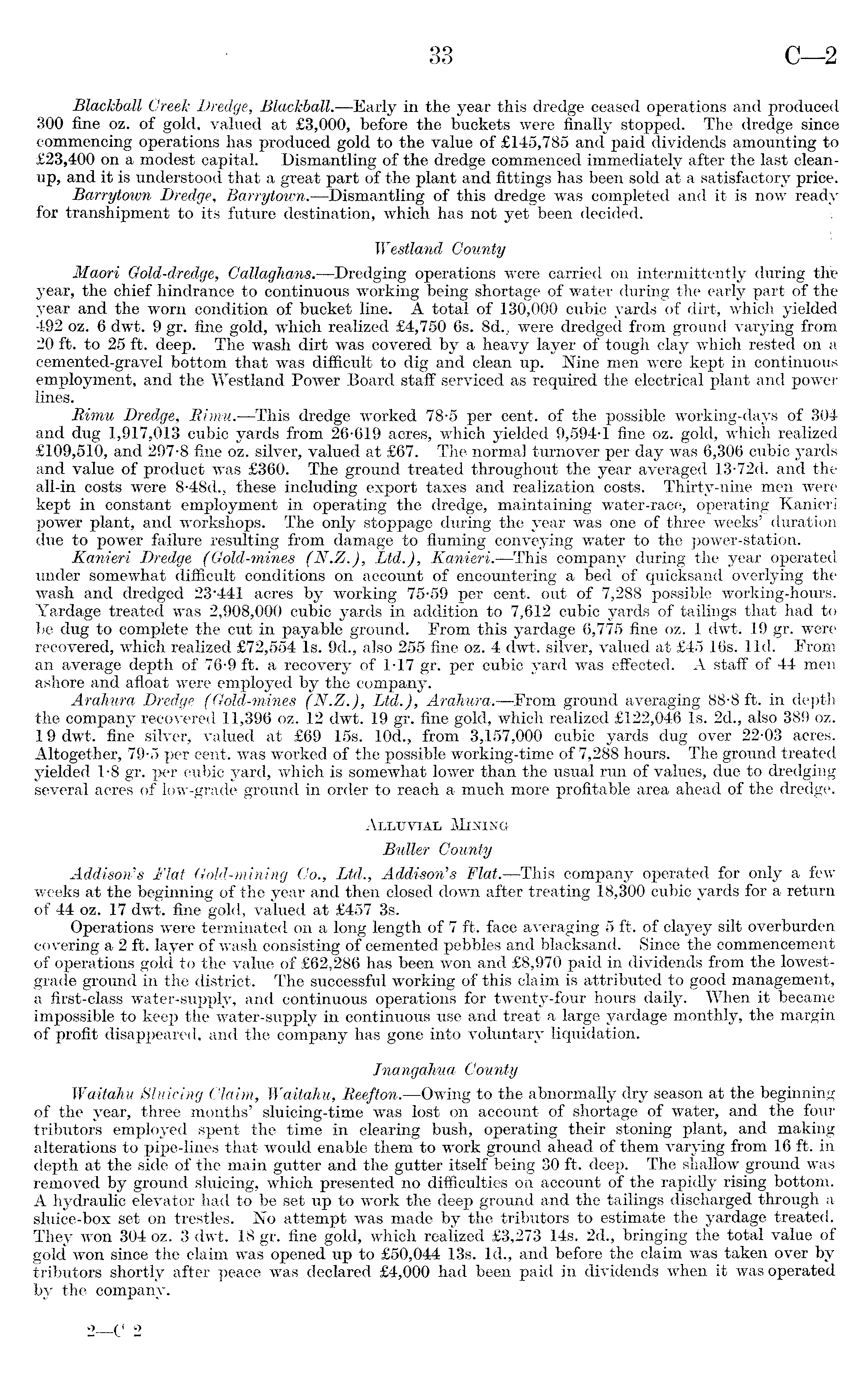 Blackball Creek Dredge, Blackball. —Early in the year this dredge ceased operations and produced 300 fine oz. of gold, valued at £3,000, before the buckets were finally stopped. The dredge since commencing operations has produced gold to the value of £145,785 and paid dividends amounting to £23,400 on a modest capital. Dismantling of the dredge commenced immediately after the last cleanup, and it is understood that a great part of the plant and fittings has been sold at a satisfactory price. Barrytown Dredge, Barrytown.—Dismantling of this dredge was completed and it is now ready for transhipment to its future destination, which has not yet been decided. Westland County Maori Gold-dredge, Callaghans.—Dredging operations were carried on intermittently during the year, the chief hindrance to continuous working being shortage of water during the early part of the year and the worn condition of bucket line. A total of 130,000 cubic yards of dirt, which yielded 492 oz. 6 dwt. 9 gr. fine gold, which realized £4,750 6s. Bd. , were dredged from ground varying from 20 ft. to 25 ft. deep. The wash dirt was covered by a heavy layer of tough clay which rested on a cemented-gravel bottom that was difficult to dig and clean up. Nine men were kept in continuous employment, and the Westland Power Board staff serviced as required the electrical plant and power lines. Rimu Dredge, Bimu. —This dredge worked 78-5 per cent, of the possible working-days of 304 and dug 1,917,013 cubic yards from 26-619 acres, which yielded 9,594-1 fine oz. gold, which realized £109,510, and 297-8 fine oz. silver, valued at £67. The normal turnover per day was 6,306 cubic yards and value of product was £360. The ground treated throughout the year averaged 13-72 d. and the all-in costs were 8-48 d. s these including export taxes and realization costs. Thirty-nine men were kept in constant employment in operating the dredge, maintaining water-race, operating Kanieri power plant, and workshops. The only stoppage during the year was one of three weeks' duration due to power failure resulting from damage to framing conveying water to the power-station. jKanieri Dredge (Gold-mines (N.Z.), Ltd.), Kanieri.—This company during the year operated under somewhat difficult conditions on account of encountering a bed of quicksand overlying the wash and dredged 23*441 acres by working 75-59 per cent, out of 7,288 possible working-hours. Yardage treated was 2,908,000 cubic yards in addition to 7,612 cubic yards' of tailings that had to be dug to complete the cut in payable ground. From this yardage 6,775 fine oz. 1 dwt. 19 gr. were recovered, which realized £72,554 Is. 9d., also 255 fine oz. 4 dwt. silver, valued at £45 16s. lid. From an average depth of 76-9 ft. a recovery of 1-17 gr. per cubic yard was effected. A staff of 44 men ashore and afloat were employed by the company. Arahura Dredge (Gold-mines (N.Z.), Ltd.), Arahura. —From ground averaging 88-8 ft. in depth the company recovered 11,396 oz. 12 dwt. 19 gr. fine gold, which realized £122,046 Is. 2d., also 389 oz. 19 dwt. fine silver, valued at £69 15s. 10d., from 3,157,000 cubic yards dug over 22-03 acres. Altogether, 79-5 per cent, was worked of the possible working-time of 7,288 hours. The ground treated yielded 1-8 gr. per cubic yard, which is somewhat lower than the usual run of values, due to dredging several acres of low-grade ground in order to reach a much more profitable area ahead of the dredge. Alluvial Mining Buller County Addison's Flat Gold-mining Co., Ltd., Addison's Flat. —This company operated for only a few weeks at the beginning of the year and then closed down after treating 18,300 cubic yards for a return of 44 oz. 17 dwt. fine gold, valued at £457 3s. Operations were terminated on a long length of 7 ft. face averaging 5 ft. of clayey silt overburden covering a 2 ft. layer of wash consisting of cemented pebbles and blacksand. Since the commencement of operations gold to the value of £62,286 has been won and £8,970 paid in dividends from the lowestgrade ground in the district. The successful working of this claim is attributed to good management, a first-class water-supply, and continuous operations for twenty-four hours daily. When it became impossible to keep the water-supply in continuous use and treat a large yardage monthly, the margin of profit disappeared, and the company has gone into voluntary liquidation. Inangahua County Waitahu Sluicing Claim, Waitahu, Reefton. —Owing to the abnormally dry season at the beginning of the year, three months' sluicing-time was lost on account of shortage of water, and the four tributors employed spent the time in clearing bush, operating their stoning plant, and making alterations to pipe-lines that would enable them to work ground ahead of them varying from 16 ft. in depth at the side of the main gutter and the gutter itself being 30 ft. deep. The shallow ground was removed by ground sluicing, which presented no difficulties on account of the rapidly rising bottom. A hydraulic elevator had to be set up to work the deep ground and the tailings discharged through a sluice-box set on trestles. No attempt was made by the tributors to estimate the yardage treated. They won 304 oz. 3 dwt. 18 gr. fine gold, which realized £3,273 14s. 2d., bringing the total value of gold won since the claim was opened up to £50,044 13s. Id., and before the claim was taken over by tributors shortly after peace was declared £4,000 had been paid in dividends when it was operated by the company.