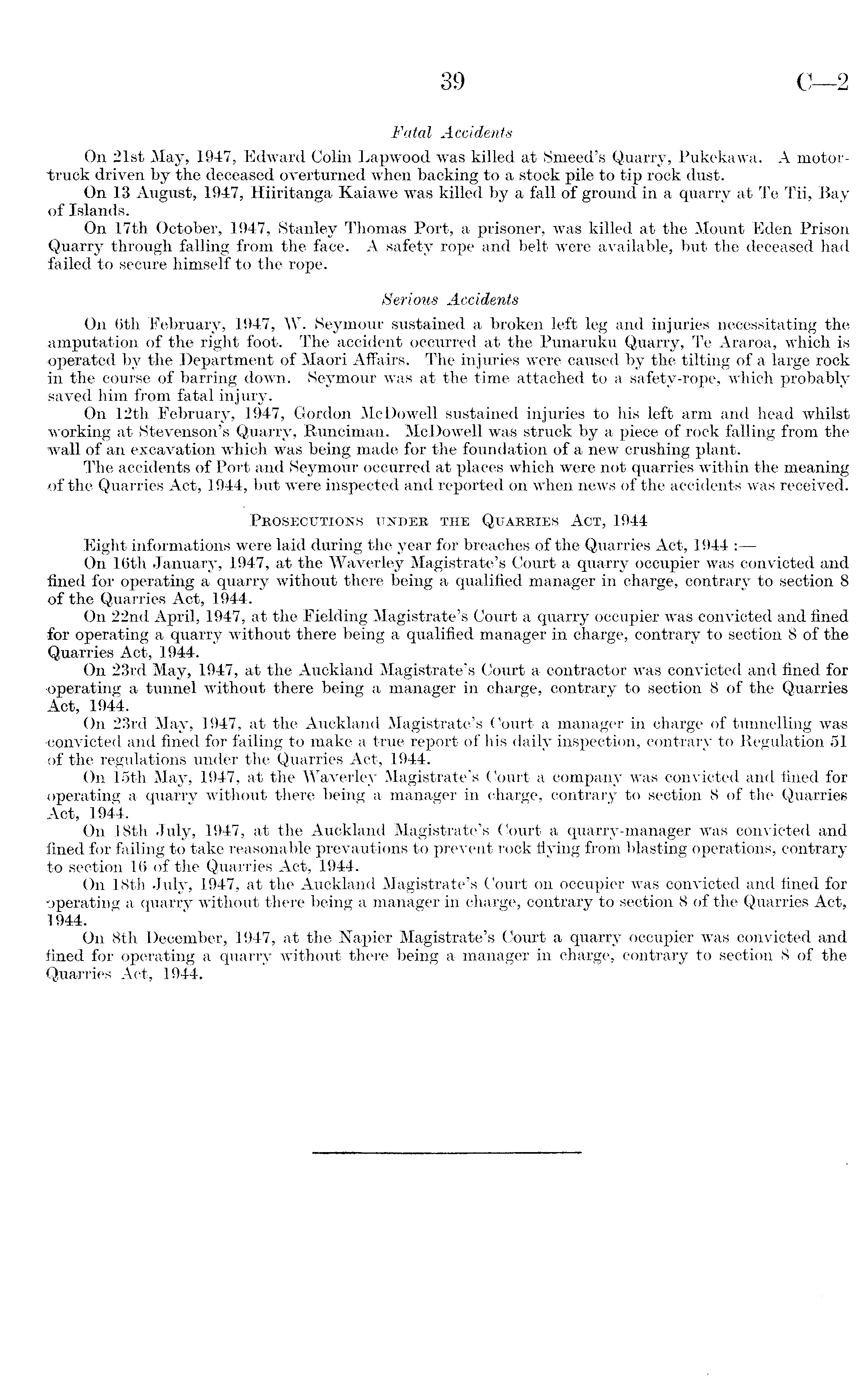 Fatal Accidents On 21st May, 1947, Edward Colin Lapwood was killed at Smeed's Quarry, Pukekawa. A motortruck driven by the deceased overturned when backing to a stock pile to tip rock dust. On 13 August, 1947, Hiiritanga Kaiawe was killed by a fall of ground in a quarry at Te Tii, Bay of Islands. On 17th October, 1947, Stanley Thomas Port, a prisoner, was killed at the Mount Eden Prison Quarry through falling from the face. A safety rope and belt were available, but the deceased had failed to secure himself to the rope. Serious Accidents On 6th February, 1947, W. Seymour sustained a broken left leg and injuries necessitating the amputation of the right foot. The accident occurred at the Punaruku Quarry, Te Araroa, which is operated by the Department of Maori Affairs. The injuries were caused by the tilting of a large rock in the course of barring down. Seymour was at the time attached to a safety-rope, which probably saved him from fatal injury. On 12th February, 1947, Gordon McDowell sustained injuries to his left arm and head whilst working at Stevenson's Quarry, Runciman. McDowell was struck by a piece of rock falling from the wall of an excavation which was being made for the foundation of a new crushing plant. The accidents of Port and Seymour occurred at places which were not quarries within the meaning of the Quarries Act, 1944, but were inspected and reported on when news of the accidents was received. Prosecutions under the Quarries Act, 1944 Eight informations were laid during the year for breaches of the Quarries Act, 1944 : On 16th January, 1947, at the Waverley Magistrate's Court a quarry occupier was convicted and fined for operating a quarry without there being a qualified manager in charge, contrary to section 8 of the Quarries Act, 1944. On 22nd April, 1947, at the Fielding Magistrate's Court a quarry occupier was convicted and fined for operating a quarry without there being a qualified manager in charge, contrary to section 8 of the Quarries Act, 1944. On 23rd May, 1947, at the Auckland Magistrate's Court a contractor was convicted and fined for •operating a tunnel without there being a manager in charge, contrary to section 8 of the Quarries Act, 1944. On 23rd May, 1947, at the Auckland Magistrate's Court a manager in charge of tunnelling was ■convicted and fined for failing to make a true report of his daily inspection, contrary to Regulation 51 of the regulations under the Quarries Act, 1944. On 15th May, 1947, at the Waverley Magistrate's Court a company was convicted and fined for operating a quarry without there being a manager in charge, contrary to section 8 of the Quarries Act, 1944. On 18th July, 1947, at the Auckland Magistrate's Court a quarry-manager was convicted and fined for failing to take reasonable prevautions to prevent rock flying from blasting operations, contrary to section 16 of the Quarries Act, 1944. On 18th July, 1947, at the Auckland Magistrate's Court on occupier was convicted and fined for operating a quarry without there being a manager in charge, contrary to section 8 of the Quarries Act, 1944. On Bth December, 1947, at the Napier Magistrate's Court a quarry occupier was convicted and fined for operating a quarry without there being a manager in charge, contrary to section 8 of the Quarries Act, 1944.
