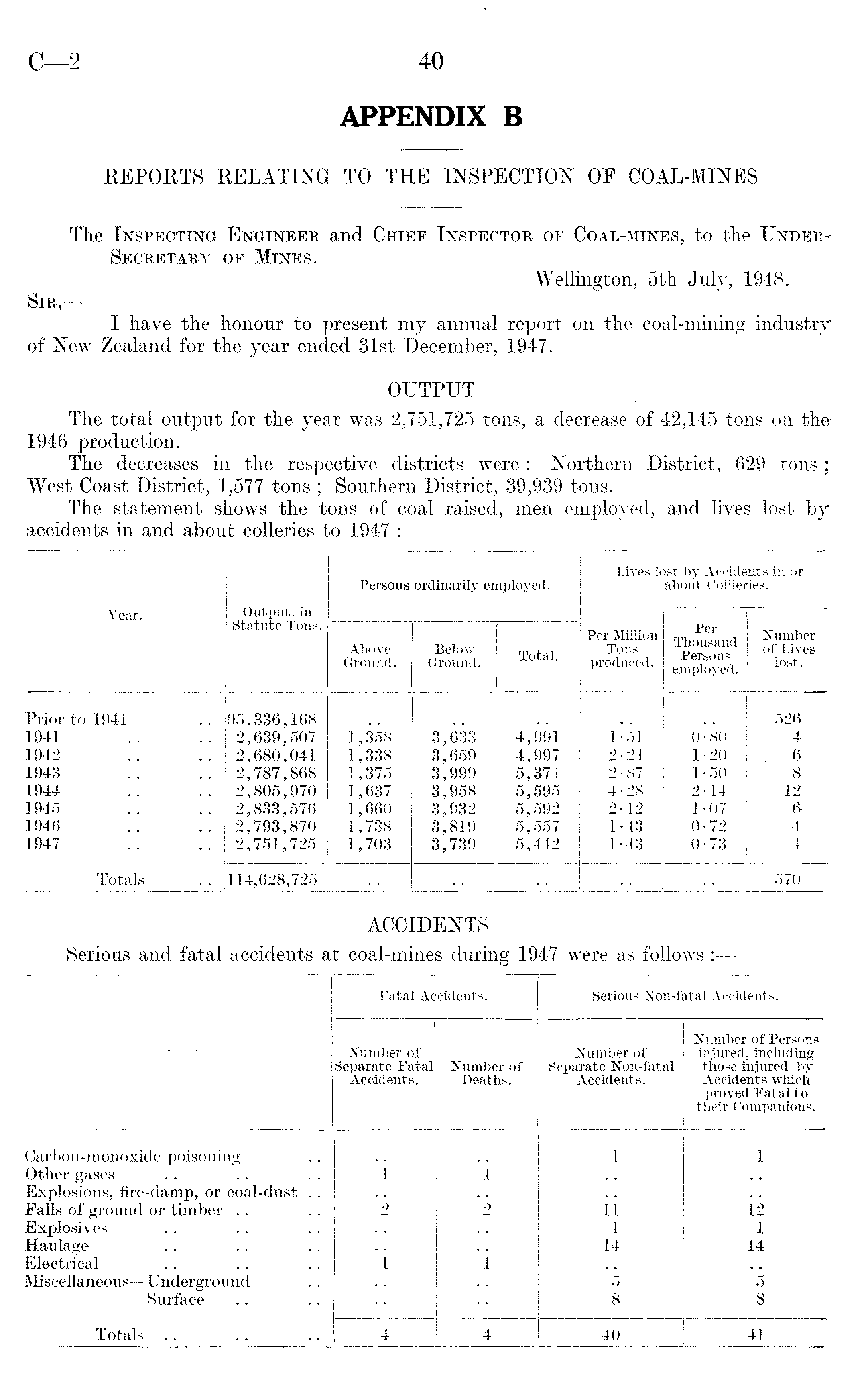 APPENDIX B REPORTS RELATING TO THE INSPECTION OF COAL-MINES The Inspecting Engineer and Chief Inspector of Coal-mines, to the UnderSecretary of Mines. Wellington, sth July, 1948. Sir, — I have the honour to present my annual report on the coal-mining industry of New Zealand for the year ended 31st December, 1947. OUTPUT The total output for the year was 2,751,725 tons, a decrease of 42,145 tons on the 1946 production.
