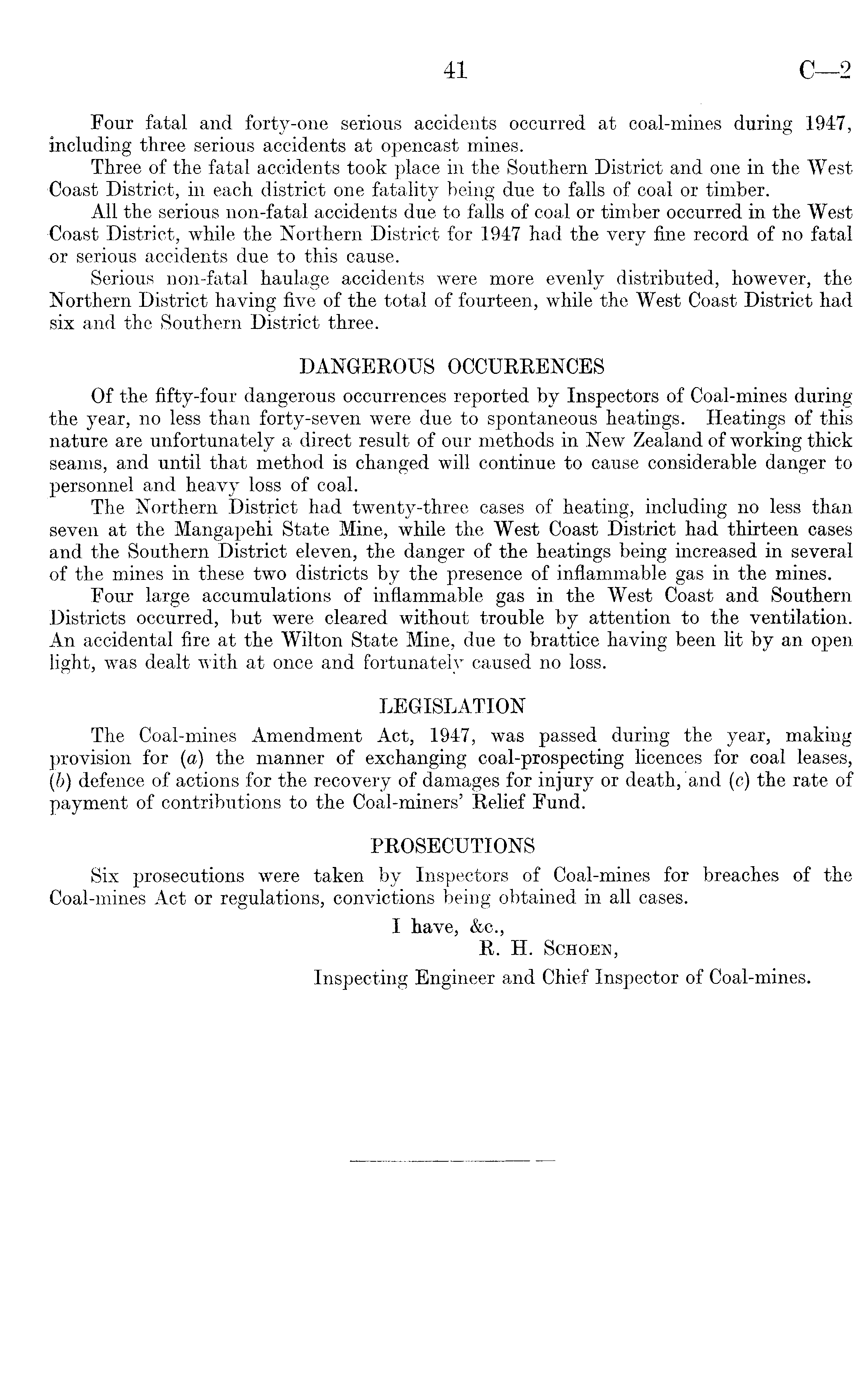 Four fatal and forty-one serious accidents occurred at coal-mines during 1947, including three serious accidents at opencast mines. Three of the fatal accidents took place in the Southern District and one in the West •Coast District, in each district one fatality being due to falls of coal or timber. All the serious non-fatal accidents due to falls of coal or timber occurred in the West Coast District, while the Northern District for 1947 had the very fine record of no fatal or serious accidents due to this cause. Serious non-fatal haulage accidents were more evenly distributed, however, the Northern District having five of the total of fourteen, while the West Coast District had six and the Southern District three. DANGEROUS OCCURRENCES Of the fifty-four dangerous occurrences reported by Inspectors of Coal-mines during the year, no less than forty-seven were due to spontaneous heatings. Heatings of this nature are unfortunately a direct result of our methods in New Zealand of working thick seams, and until that method is changed will continue to cause considerable danger to personnel and heavy loss of coal. The Northern District had twenty-three cases of heating, including no less than seven at the Mangapehi State Mine, while the West Coast District had thirteen cases and the Southern District eleven, the danger of the heatings being increased in several of the mines in these two districts by the presence of inflammable gas in the mines. Four large accumulations of inflammable gas in the West Coast and Southern Districts occurred, but were cleared without trouble by attention to the ventilation. An accidental fire at the Wilton State Mine, due to brattice having been lit by an open light, was dealt with at once and fortunately caused no loss. LEGISLATION The Coal-mines Amendment Act, 1947, was passed during the year, making provision for (a) the manner of exchanging coal-prospecting licences for coal leases, {b) defence of actions for the recovery of damages for injury or death, and (c) the rate of payment of contributions to the Coal-miners' Relief Fund. PROSECUTIONS Six prosecutions were taken by Inspectors of Coal-mines for breaches of the Coal-mines Act or regulations, convictions being obtained in all cases. I have, &c., R. H. Schoen, Inspecting Engineer and Chief Inspector of Coal-mines.