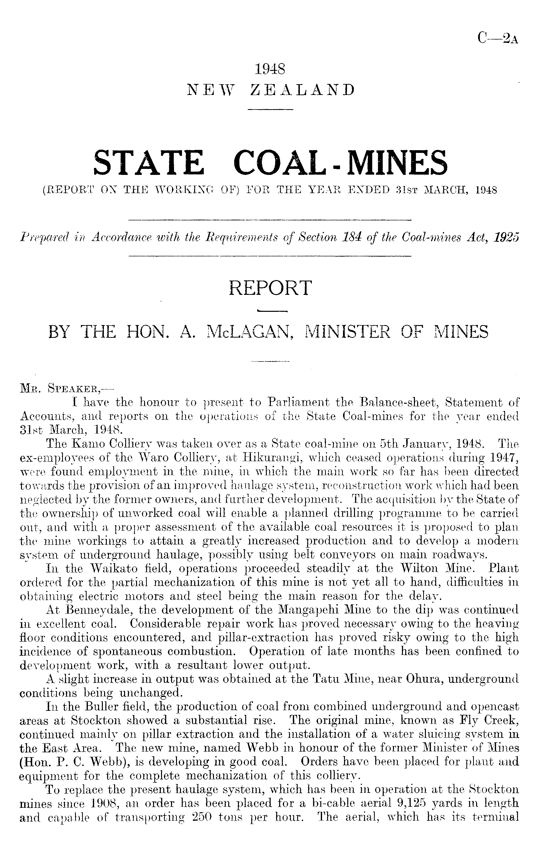 REPORT BY THE HON. A. McLAGAN, MINISTER OF MINES Mr. Speaker,— I have the honour to present to Parliament the Balance-sheet, Statement of Accounts, and reports on the. operations of the State Coal-mines for the year ended 31st March, 1948. The Kamo Colliery was taken over as a State coal-mine on sth January, 1948. The ex-employees of the Waro Colliery, at Hikurangi, which ceased operations during 1947, were found employment in the mine, in which the main work so far has been directed towards the provision of an improved haulage system, reconstruction work which had been neglected by the former owners, and further development. The acquisition by the State of the ownership of unworked coal will enable a planned drilling programme to be carried out, and with a proper assessment of the available coal resources it is proposed to plan the mine workings to attain a greatly increased production and to develop a modern system of underground haulage, possibly using belt conveyors on main roadways. In the Waikato field, operations proceeded steadily at the Wilton Mine. Plant ordered for the partial mechanization of this mine is not yet all to hand, difficulties in obtaining electric motors and steel being the main reason for the delay. At Benneydale, the development of the Mangapehi Mine to the dip was continued in excellent coal. Considerable repair work has proved necessary owing to the heaving floor conditions encountered, and pillar-extraction has proved risky owing to the high incidence of spontaneous combustion. Operation of late months has been confined to development work, with a resultant lower output. A slight increase in output was obtained at the Tatu Mine, near Ohura, underground conditions being unchanged. In the Buller field, the production of coal from combined underground and opencast areas at Stockton showed a substantial rise. The original mine, known as Fly Creek, continued mainly on pillar extraction and the installation of a water sluicing system in the East Area. The new mine, named Webb in honour of the former Minister of Mines (Hon. P. C. Webb), is developing in good coal. Orders have been placed for plant and equipment for the complete mechanization of this colliery. To replace the present haulage system, which has been in operation at the Stockton mines since 1908, an order has been placed for a bi-cable aerial 9,125 yards in length and capable of transporting 250 tons per hour. The aerial, which has its terminal