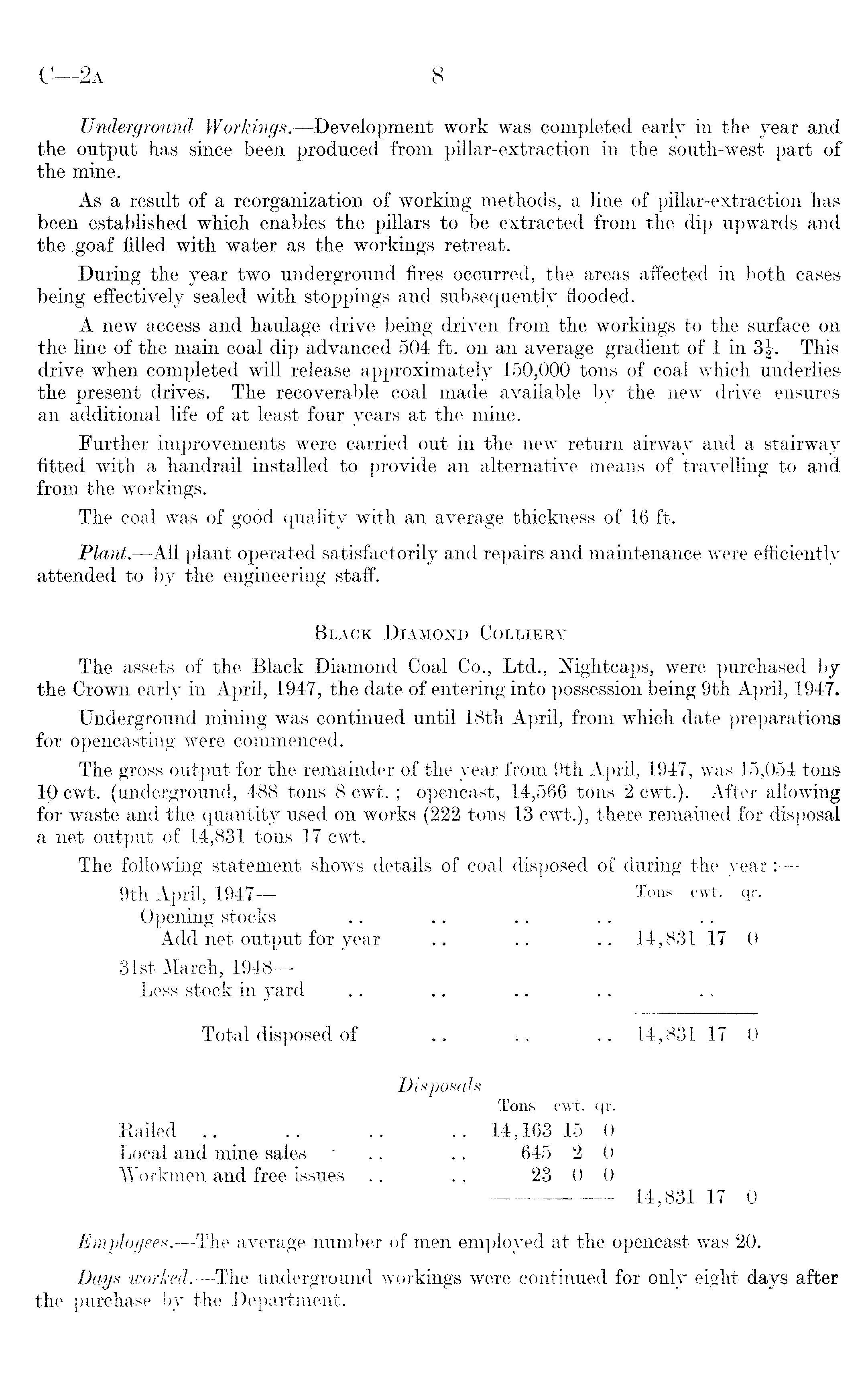 Underground Workings. —Development work was completed early in the year and the output has since been produced from pillar-extraction in the south-west part of the mine. As a result of a reorganization of working methods, a line of pillar-extraction has been established which enables the pillars to be extracted from the dip upwards and the goaf filled with water as the workings retreat. During the year two underground fires occurred, the areas affected in both cases being effectively sealed with stoppings and subsequently flooded. A new access and haulage drive being driven from the workings to the surface on the line of the main coal dip advanced 504 ft. on an average gradient of lin 3|. This drive when completed will release approximately 150,000 tons of coal which underlies the present drives. The recoverable coal made available by the new drive ensures an additional life of at least four years at the mine. Further improvements were carried out in the new return airway and a stairway fitted with a handrail installed to provide an alternative means of travelling to and from the workings. The coal was of good quality with an average thickness of 16 ft. Plant.—All plant operated satisfactorily and repairs and maintenance were efficiently attended to by the engineering staff. Black Diamond Colliery The assets of the Black Diamond Coal Co., Ltd., Nightcaps, were purchased by the Crown early in April, 1947, the date of entering into possession being 9th April, 1947. Underground mining was continued until 18th April, from which date preparations for opencasting were commenced. The gross output for the remainder of the year from 9th April, 1947, was 15,054 tons 10 cwt. (underground, 488 tons 8 cwt. ; opencast, 14,566 tons 2 cwt.). After allowing for waste and the quantity used on works (222 tons 13 cwt.), there remained for disposal a net output of 14,831 tons 17 cwt. The following statement shows details of coal disposed of during the year:— 9th April, 1947 — Tons cwt - q r - Opening stocks Add net output for year .. .. .. 14,831 17 0 31st March, 1948 — Less stock in yard Total disposed of .. i. .. 14,831 17 0 Disposals Tons cwt. qr. Railed .. .. .. .. 14,163 15 0 Local and mine sales ' .. .. 645 2 0 Workmen and free issues .. .. 23 0 0 14,831 17 0 Employees. —The average number of men employed at the opencast was 20. Days worked.—The underground workings were continued for only eight days after the purchase by the Department.