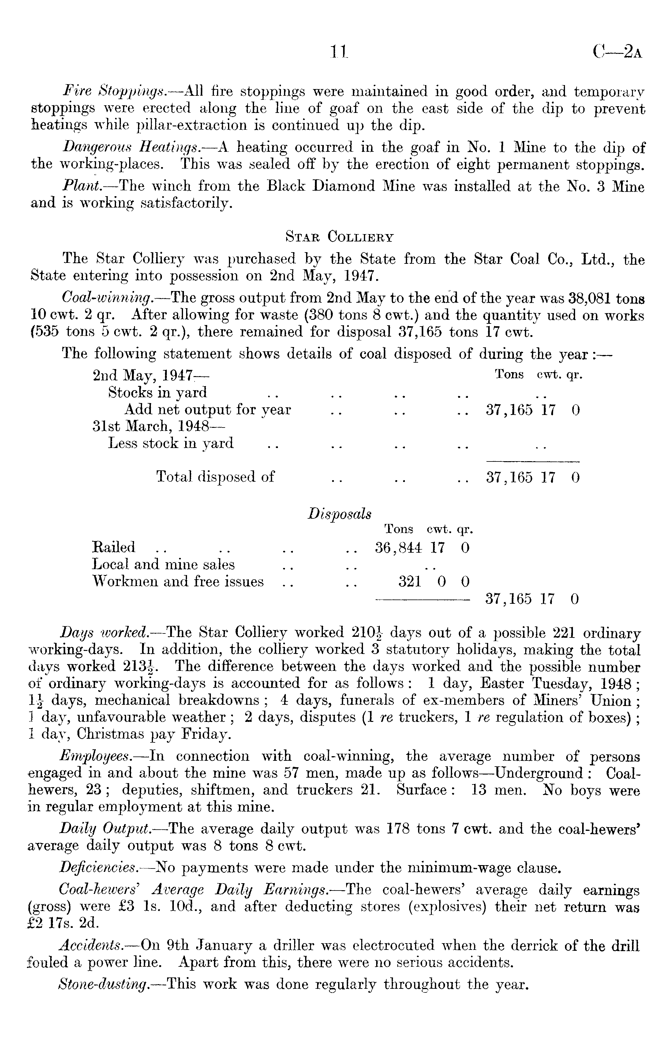 Fire Stoppings.—All fire stoppings were maintained in good order, and temporary stoppings were erected along the line of goaf on the east side of the dip to prevent heatings while pillar-extraction is continued up the dip. Dangerous Heatings.—A heating occurred in the goaf in No. 1 Mine to the dip of the working-places. This was sealed off by the erection of eight permanent stoppings. Plant. —The winch from the Black Diamond Mine was installed at the No. 3 Mine and is working satisfactorily. Star Colliery The Star Colliery was purchased by the State from the Star Coal Co., Ltd., the State entering into possession on 2nd May, 1947. Coal-winning.—The gross output from 2nd May to the end of the year was 38,081 tons 10 cwt. 2 qr. After allowing for waste (380 tons 8 cwt.) and the quantity used on works (535 tons 5 cwt. 2 qr.), there remained for disposal 37,165 tons 17 cwt. The following statement shows details of coal disposed of during the year: — 2nd May, 1947 Tons cwt. qr. Stocks in yard Add net output for year .. .. .. 37,165 17 0 31st March, 1948 — Less stock in yard Total disposed of .. .. .. 37,165 17 0 Disposals Tons cwt. qr. Bailed .. .. .. .. 36,844 17 0 Local and mine sales Workmen and free issues .. .. 321 0 0 37,165 17 0 Days worked. —The Star Colliery worked 210| days out of a possible 221 ordinary working-days. In addition, the colliery worked 3 statutory holidays, making the total days worked 213|. The difference between the days worked and the possible number of ordinary working-days is accounted for as follows: 1 day, Easter Tuesday, 1948; 1| days, mechanical breakdowns ; 4 days, funerals of ex-members of Miners' Union; 1 day, unfavourable weather; 2 days, disputes (1 re truckers, Ire regulation of boxes); 1 day, Christmas pay Friday. Employees.—ln connection with coal-winning, the average number of persons engaged in and about the mine was 57 men, made up as follows —Underground: Coalhewers, 23; deputies, shiftmen, and truckers 21. Surface: 13 men. No boys were in regular employment at this mine. Daily Output.—The average daily output was 178 tons 7 cwt. and the coal-hewers' average daily output was 8 tons 8 cwt. Deficiencies. —No payments were made under the minimum-wage clause. Coal-heivers' Average Daily Earnings.—The coal-hewers' average daily earnings (gross) were £3 Is. 10d., and after deducting stores (explosives) their net return was £2 17s. 2d. Accidents. —On 9th January a driller was electrocuted when the derrick of the drill fouled a power line. Apart from this, there were no serious accidents. Stone-dusting. —This work was done regularly throughout the year.