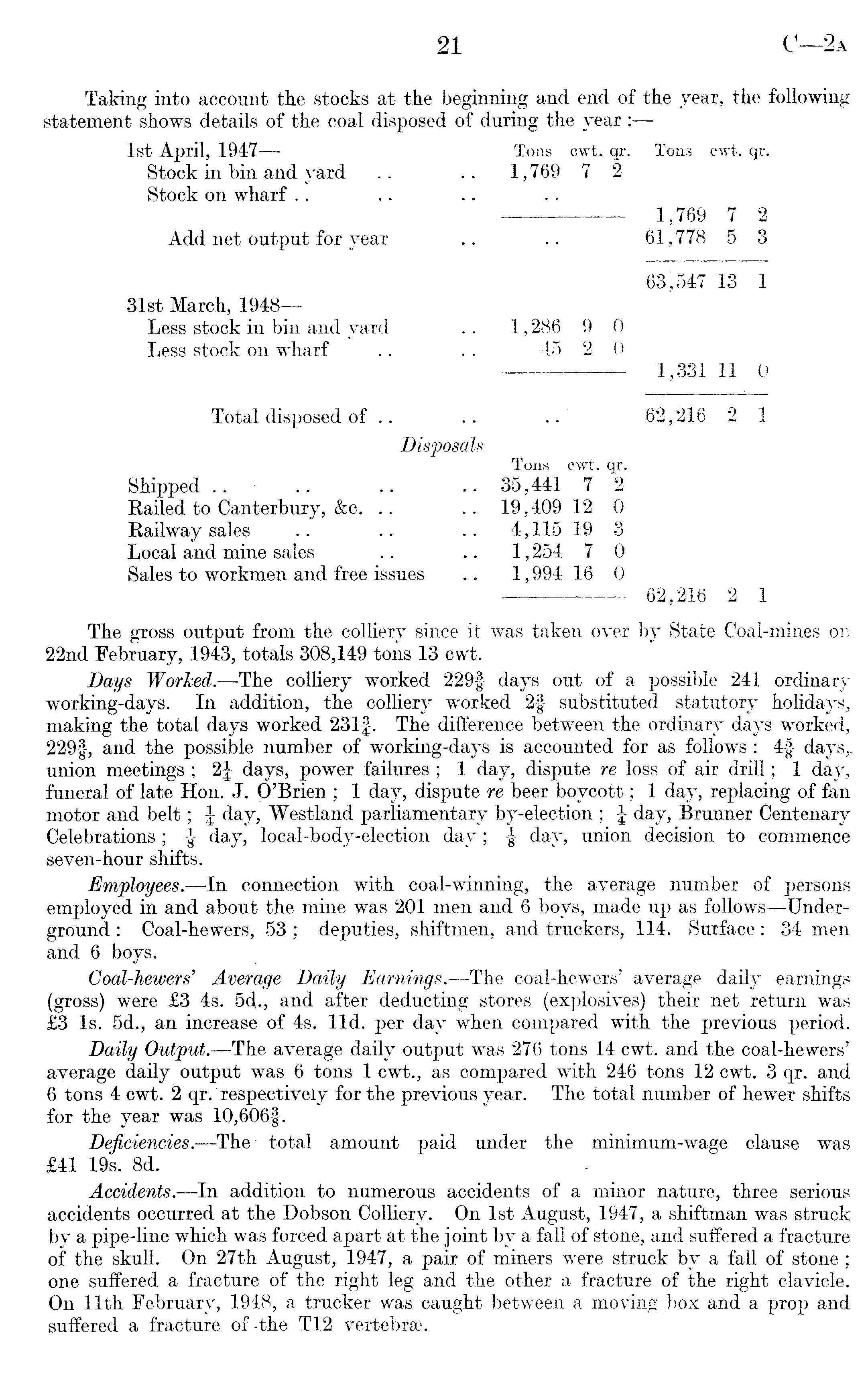 Taking into account the stocks at the beginning and end of the year, the following statement shows details of the coal disposed of during the year : Ist April, 1947 Tons cwt. qr. Tons cwt. qr. Stock in bin and yard .. .. 1,769 7 2 Stock on wharf .. 1,769 7 2 Add net output for year .. .. 61,778 5 3 63,547 13 1 31st March, 1948 Less stock in bin and yard .. 1,286 9 0 Less stock on wharf .. .. 45 2 0 1,331 11 0 Total disposed of .. .. .. 62,216 2 1 Disposals Tons cwt. qr. Shipped .. 35,441 7 2 Railed to Canterbury, &c. .. .. 19,409 12 0 Railway sales .. .. .. 4,115 19 3 Local and mine sales .. .. 1,254 7 0 Sales to workmen and free issues .. 1,994 16 0 62,216 2 1 The gross output from the colliery since it was taken over by State Coal-mines on 22nd February, 1943, totals 308,149 tons 13 cwt. Days Worked. —The colliery worked 229f days out of a possible 241 ordinary working-days. In addition, the colliery worked 2f substituted statutory holidays, making the total days worked 231f. The difference between the ordinary days worked, 229§, and the possible number of working-days is accounted for as follows : 4f days,, union meetings ; 2J days, power failures ; 1 day, dispute re loss of air drill; 1 day, funeral of late Hon. J. O'Brien ; 1 day, dispute re beer boycott; 1 day, replacing of fan motor and belt; £ day, Westland parliamentary by-election ; \ day, Brunner Centenary Celebrations ; day, local-body-election day; day, union decision to commence seven-hour shifts. Employees.—ln connection with coal-winning, the average number of persons employed in and about the mine was 201 men and 6 boys, made up as follows—Underground : Coal-hewers, 53; deputies, shiftmen, and truckers, 114. Surface: 34 men and 6 boys. Coal-hewers' Average Daily Earnings.—The coal-hewers' average daily earnings (gross) were £3 4s. 5d., and after deducting stores (explosives) their net return was £3 Is. 5d., an increase of 4s. lid. per day when compared with the previous period. Daily Output.—The average daily output was 276 tons 14 cwt. and the coal-hewers' average daily output was 6 tons 1 cwt., as compared with 246 tons 12 cwt. 3 qr. and 6 tons 4 cwt. 2 qr. respectively for the previous year. The total number of hewer shifts for the year was 10,606f. Deficiencies. —The total amount paid under the minimum-wage clause was £4l 19s. Bd. Accidents. —In addition to numerous accidents of a minor nature, three serious accidents occurred at the Dobson Colliery. On Ist August, 1947, a shiftman was struck by a pipe-line which was forced apart at the joint by a fall of stone, and suffered a fracture of the skull. On 27th August, 1947, a pair of miners were struck by a fall of stone; one suffered a fracture of the right leg and the other a fracture of the right clavicle. On 11th February, 1948, a trucker was caught between a moving box and a prop and suffered a fracture of-the Tl2 vertebrae.