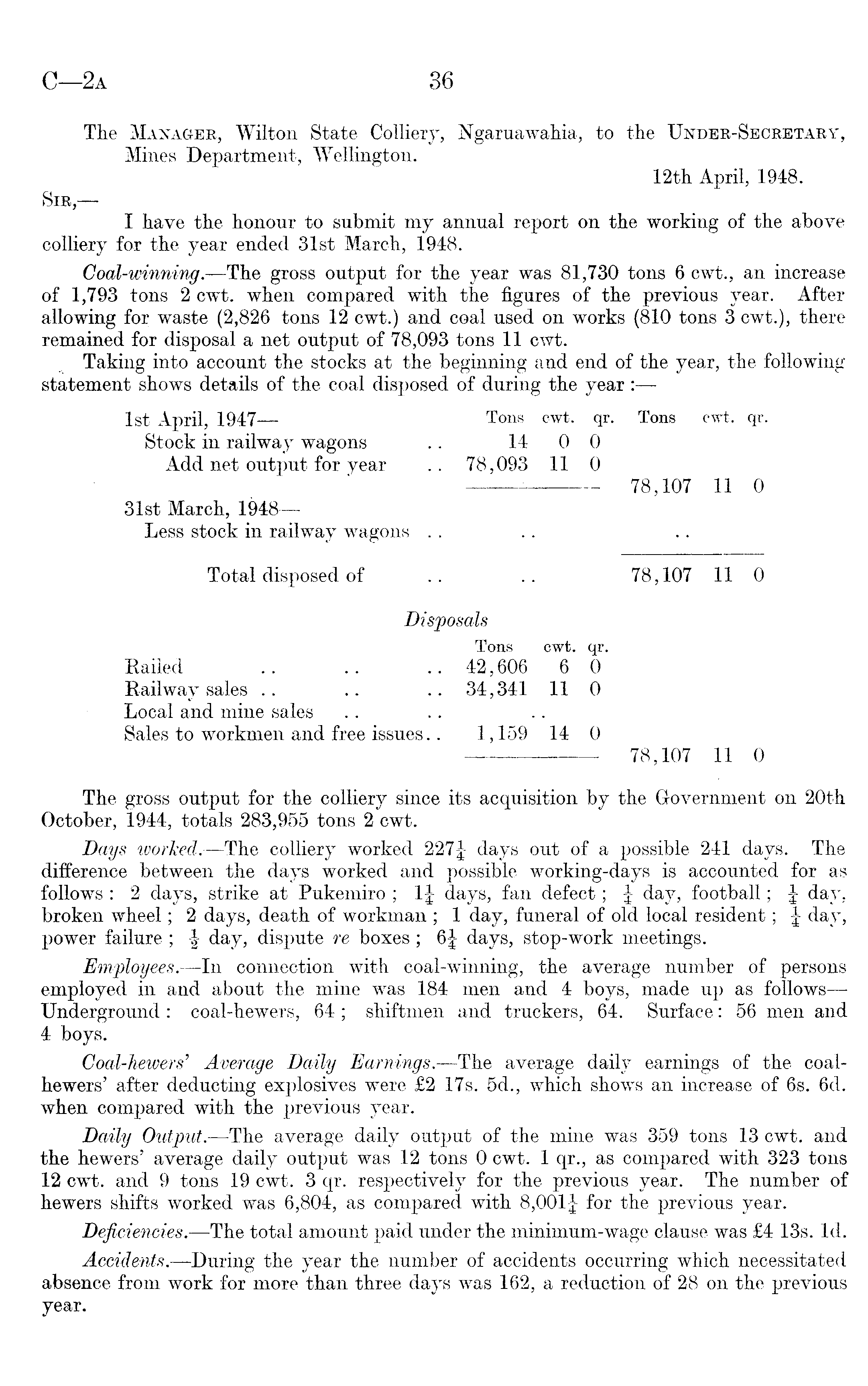 The Manager, Wilton State Colliery, Ngaruawahia, to the Under-Secretary, Mines Department, Wellington. 12th April, 1948. Sir, — I have the honour to submit my annual report on the working of the above colliery for the year ended 31st March, 1948. Goal-winning. —The gross output for the year was 81,730 tons 6 cwt., an increase of 1,793 tons 2 cwt. when compared with the figures of the previous year. After allowing for waste (2,826 tons 12 cwt.) and coal used on works (810 tons 3 cwt.), there remained for disposal a net output of 78,093 tons 11 cwt. Taking into account the stocks at the beginning and end of the year, the following statement shows details of the coal disposed of during the year : Ist April, 1947 — Tons cwt. qr. Tons cwt. qr. Stock in railway wagons .. 14 0 0 Add net output for year .. 78,093 11 0 = 78,107 11 0 31st March, 1948 Less stock in railway wagons Total disposed of .. .. 78,107 11 0 Disposals Tons cwt. qr. Railed .. .. .. 42,606 6 0 Railway sales .. .. .. 34,341 11 0 Local and mine sales Sales to workmen and free issues.. 1,159 14 0 78,107 11 0 The gross output for the colliery since its acquisition by the Government on 20th October, 1944, totals 283,955 tons 2 cwt. Days worked. —The colliery worked 227J days out of a possible 241 days. The difference between the days worked and possible working-days is accounted for as follows : 2 days, strike at Pukemiro ; 1£ days, fan defect; \ day, football; £ day, broken wheel; 2 days, death of workman ; 1 day, funeral of old local resident; day, power failure ; J day, dispute re boxes ; days, stop-work meetings. Employees.—ln connection with coal-winning, the average number of persons employed in and about the mine was 184 men and 4 boys, made up as follows— Underground : coal-hewers, 64; shiftmen and truckers, 64. Surface: 56 men and 4 boys. Coal-hewers' Average Daily Earnings.—The average daily earnings of the coalhewers' after deducting explosives were £2 17s. 5d., which shows an increase of 6s. 6d. when compared with the previous year. Daily Output.—The average daily output of the mine was 359 tons 13 cwt. and the hewers' average daily output was 12 tons 0 cwt. 1 qr., as compared with 323 tons 12 cwt. and 9 tons 19 cwt. 3 qr. respectively for the previous year. The number of hewers shifts worked was 6,804, as compared with 8,001 J for the previous year. Deficiencies. —The total amount paid under the minimum-wage clause was £4 13s. Id. Accidents.—During the year the number of accidents occurring which necessitated absence from work for more than three days was 162, a reduction of 28 on the previous year.