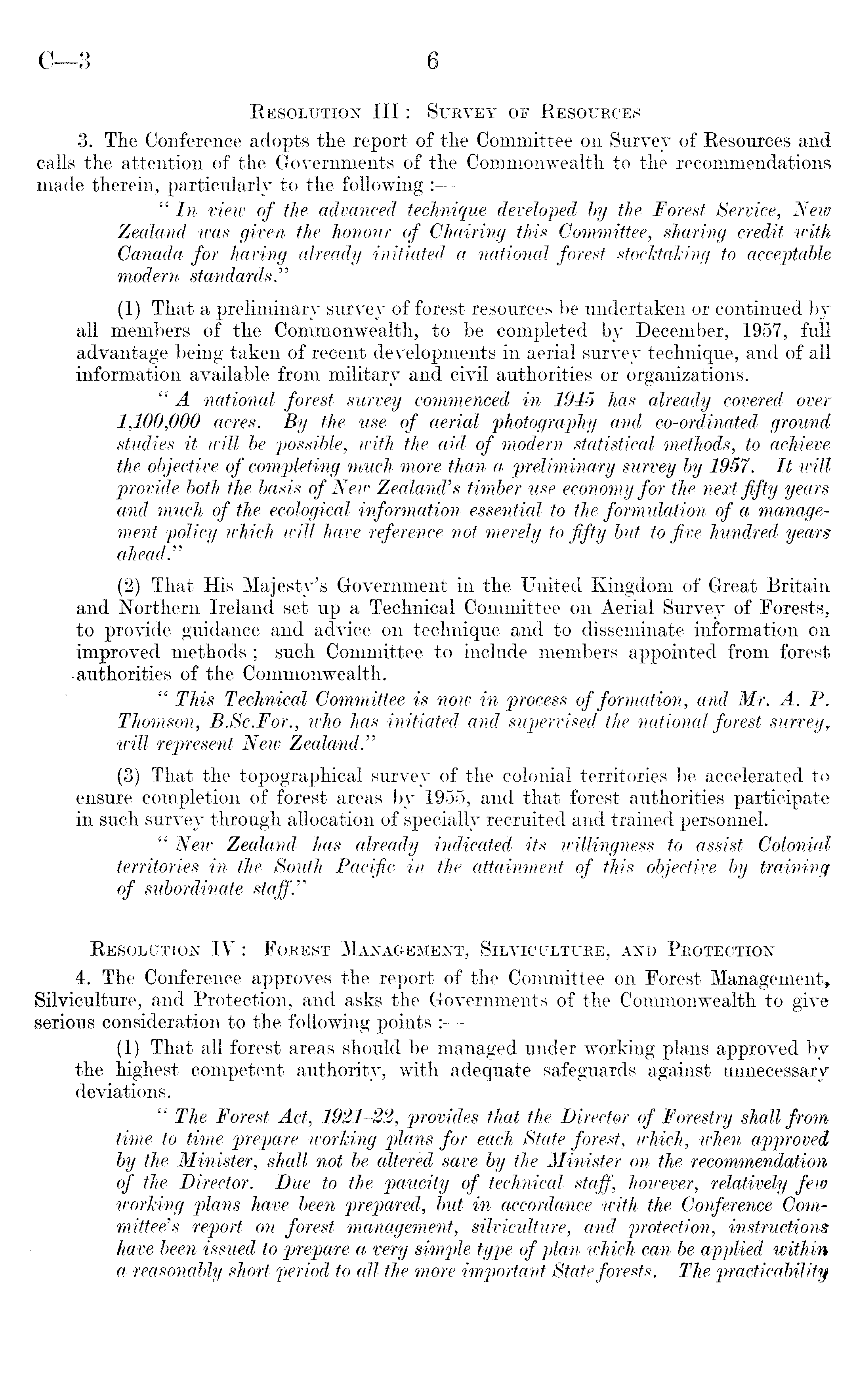 Resolution III: Survey of Resources 3. The Conference adopts the report of the Committee on Survey of Resources and calls the attention of the Governments of the Commonwealth to the recommendations made therein, particularly to the following : — ! " In view of the advanced technique developed by the Forest Service, New Zealand was given the honour of Chairing this Committee, sharing credit with Canada for having already initiated a national forest stocktaking to acceptable modern standards (1) That a preliminary survey of forest resources be undertaken or continued by all members of the Commonwealth, to be completed by December, 1957, full advantage being taken of recent developments in aerial survey technique, and of all information available from military and civil authorities or organizations. " A national forest survey commenced in 1945 has already covered over 1,100,000 acres. By the use of aerial photography and co-ordinated ground studies it will be possible, with the aid of modern statistical methods, to achieve the objective of completing much more than a preliminary survey by 1957. It will provide both the basis of New Zealand's timber use economy for the next fifty years and much of the ecological information essential to the formulation of a management policy which will have reference not merely to fifty but to five hundred years ahead (2) That His Majesty's Government in the United Kingdom of Great Britain and Northern Ireland set up a Technical Committee on Aerial Survey of Forests, to provide guidance and advice on technique and to disseminate information on improved methods ; such Committee to include members appointed from forest authorities of the Commonwealth. " This Technical Committee is now in process of formation, and Mr. A. P. Thomson, B.Sc.For., who has initiated and supervised the national forest survey, will represent New Zealand." (3) That the topographical survey of the colonial territories be accelerated to ensure completion of forest areas by 1955, and that forest authorities participate in such survey through allocation of specially recruited and trained personnel. " New Zealand has already indicated its willingness to assist Colonial territories in the South Pacific in the attainment of this objective by training of subordinate staff." Resolution IV: Forest Management, Silviculture, and Protection 4. The Conference approves the report of the Committee on Forest Management, Silviculture, and Protection, and asks the Governments of the Commonwealth to give serious consideration to the following points : (1) That all forest areas should be managed under working plans approved by the highest competent authority, with adequate safeguards against unnecessary deviations. " The Forest Act, 1921-22, provides that the Director of Forestry shall from time to time prepare working plans for each State forest, which, when approved by the Minister, shall not be altered save by the Minister on the recommendation of the Director. Due to the paucity of technical staff, however, relatively few working plans have been prepared, but in accordance with the Conference Committee's report on forest management, silviculture, and protection, instructions have been issued to prepa re a very simple type of plan which can be applied within a reasonably short period to all the more important State forests. The practicability