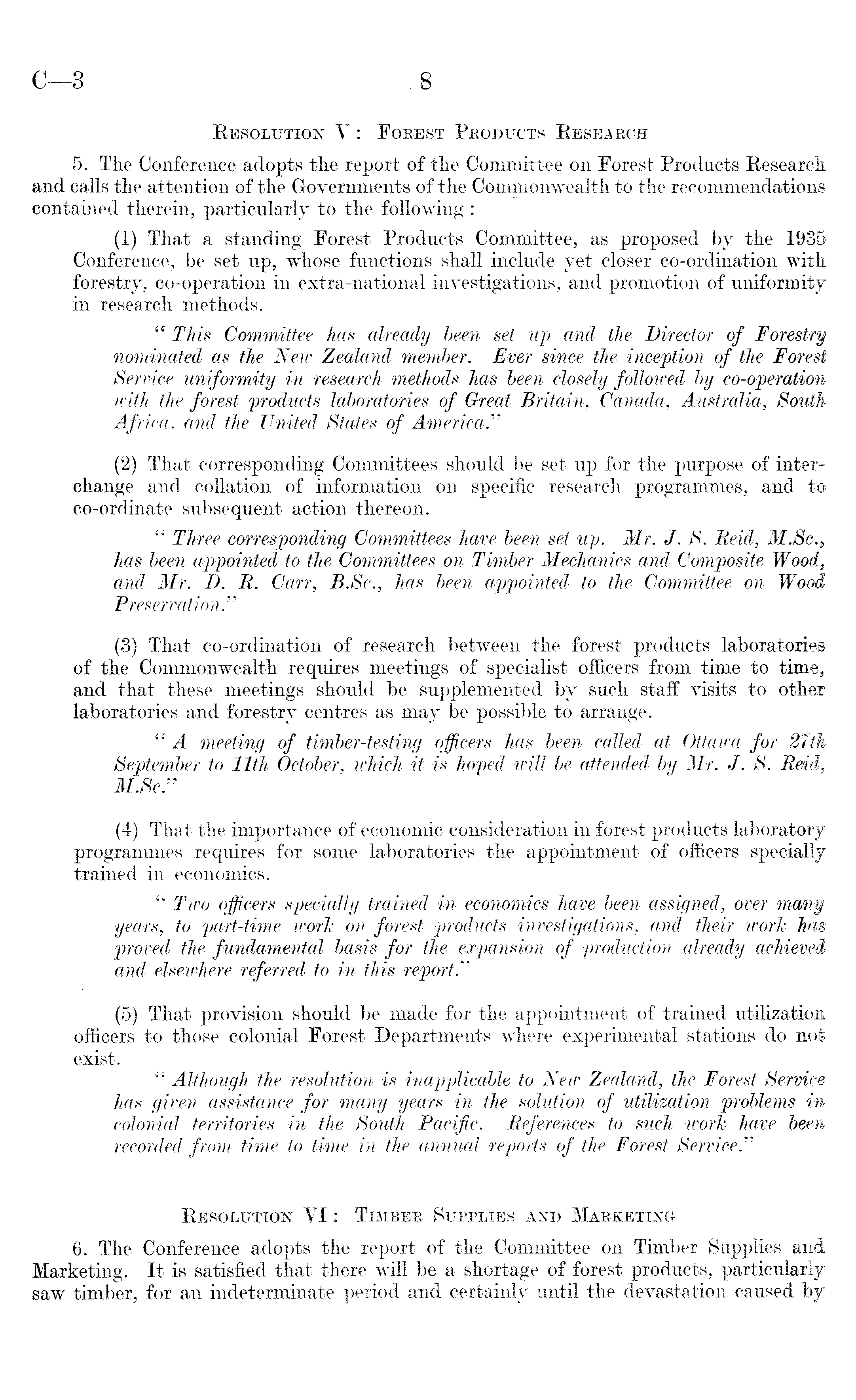 Resolution Y : Forest Products Research 5. The Conference adopts the report of the Committee on Forest Products Research, and calls the attention of the Governments of the Commonwealth to the recommendations contained therein, particularly to the following : (1) That a standing Forest Products Committee, as proposed by the 1935 Conference, be set up, whose functions shall include yet closer co-ordination with forestry, co-operation in extra-national investigations, and promotion of uniformity in research methods. " This Committee has already been set up and the Director of Forestry nominated as the New Zealand member. Ever since the inc&ption of the Forest Service uniformity in research methods has been closely followed by co-operation with the forest products laboratories of Great Britain, Canada, Australia, South Africa, and the United States of America (2) That corresponding Committees should be set up for the purpose of interchange and collation of information on specific research programmes, and to co-ordinate subsequent action thereon. " Three corresponding Committees have been set up. Mr. J. S. Reid, M.Sc., has been appointed to the Committees on Timber Mechanics and Composite Wood, and Mr. D. R. Can, B.Sc., has been appointed to the Committee on Wood Preservation." (3) That co-ordination of research between the forest products laboratories of the Commonwealth requires meetings of specialist officers from time to time, and that these meetings should be supplemented by such staff visits to other laboratories and forestry centres as may be possible to arrange. " A meeting of timber-testing officers has been called at Ottawa for 27th September to 11th October, which it is hoped will be attended by Mr. J. S. Reid, M.Sc." (4) That the importance of economic consideration in forest products laboratory programmes requires for some laboratories the appointment of officers specially trained in economics. " Two officers specially trained in economics have been assigned, over many years, to part-time work on forest products investigations, and their work has proved the fundamental basis for the expansion of production already achieved and elsewhere referred to in this report (5) That provision should be made for the appointment of trained utilization officers to those colonial Forest Departments where experimental stations do not exist. " Although the resolution is inapplicable to New Zealand, the Forest Service has given assistance for many years in the solution of utilization problems in colonial territories in the South Pacific. References to such work have been recorded from time to time in the annual reports of the Forest Service." Resolution VI: Timber Supplies and Marketing 6. The Conference adopts the report of the Committee on Timber Supplies and Marketing. It is satisfied that there will be a shortage of forest products, particularly saw timber, for an indeterminate period and certainly until the devastation caused by