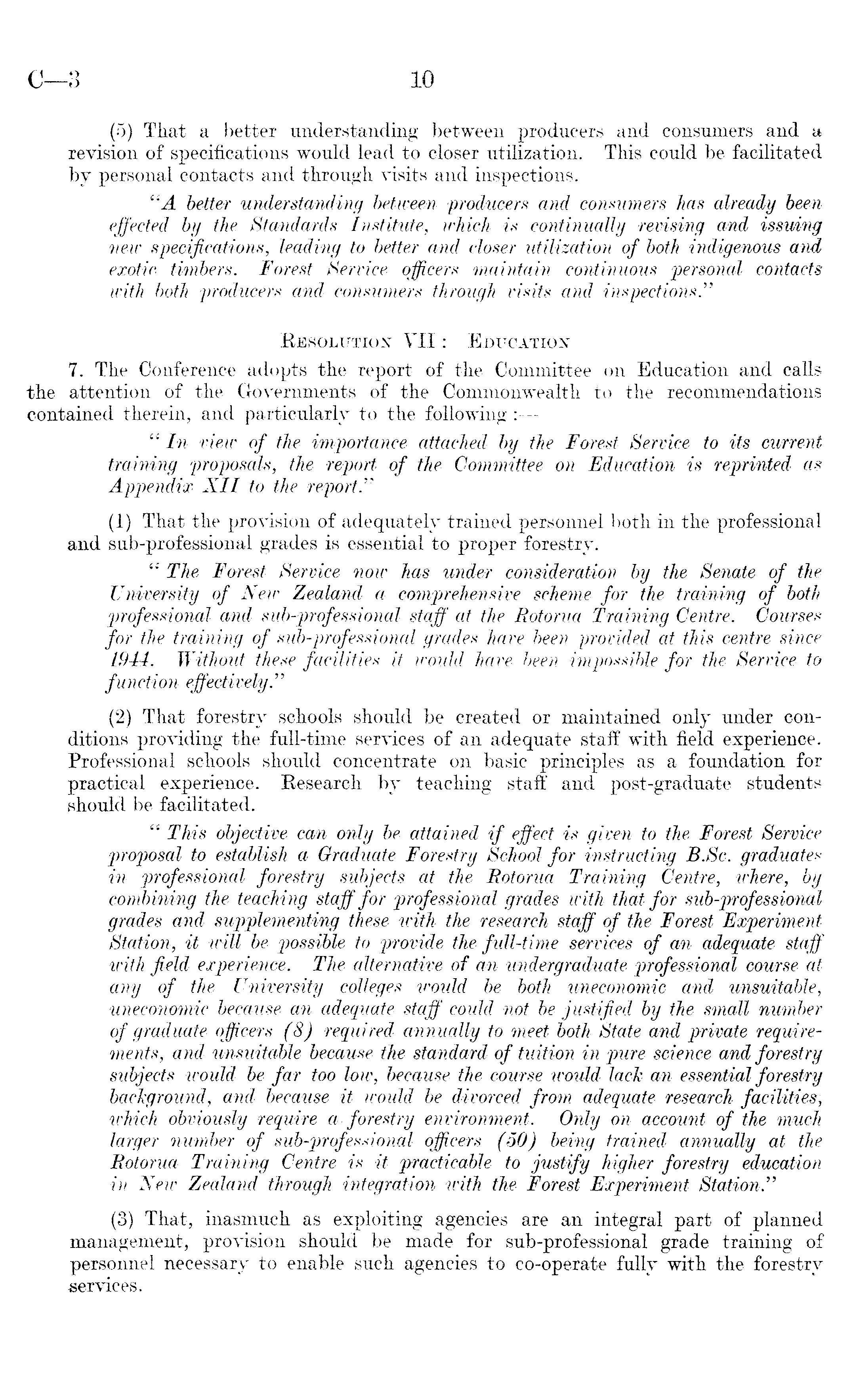 (5) That a better understanding between producers and consumers and a revision of specifications would lead to closer utilization. This could be facilitated by personal contacts and through visits and inspections. "A better understanding between producers and consumers has already been effected by the Standards Institute, which is continually revising and issuing new specifications, leading to better and closer utilization of both indigenous and exotic timbers. Forest Service officers maintain continuous personal contacts with both producers and consumers through visits and inspections.'" Resolution YII: Education 7. The Conference adopts the report of the Committee on Education and calls the attention of the Governments of the Commonwealth to the recommendations contained therein, and particularly to the following : " In view of the importance attached by the Forest Service to its current training proposals, the report of the Committee on Education is reprinted as Appendix XII to the report." (1) That the provision of adequately trained personnel both in the professional and sub-professional grades is essential to proper forestry. " The Forest Service now has under consideration by the Senate of the University of New Zealand a comprehensive scheme for the training of both professional and sub-professional staff at the Rotorua Training Centre. Courses for the training of sub-professional grades have been provided at this centre since 1944. Without these facilities it would have been impossible for the Service to function effectively." (2) That forestry schools should be created or maintained only under conditions providing the full-time services of an adequate staff with field experience. Professional schools should concentrate on basic principles as a foundation for practical experience. Research by teaching staff and post-graduate students should be facilitated. " This objective can- only be attained if effect is given to the Forest Service proposal to establish a Graduate Forestry School for instructing B.Sc. graduates in professional forestry subjects at the Rotorua Training Centre, where, by combining the teaching staff for professional grades with that for sub-professional grades and supplementing these with the research staff of the Forest Experiment Station, it will be possible to provide the full-time services of an adequate staff with field experience. The alternative of an undergraduate professional course at any of the University colleges would be both uneconomic and unsuitable, uneconomic because an adequate staff coxdd not be justified by the small number of graduate officers (8) required annually to meet both State and private requirements, and unsuitable because the standard of tuition in pure science and forestry subjects would be far too low, because the course would lack an essential forestry background, and because it would be divorced from adequate research facilities, which obviously require a-forestry environment. Only on account of the much larger number of sub-professional officers (50) being trained annually at the Rotorua Training Centre is it practicable to justify higher forestry education in New Zealand through integration with the Forest Experiment Station.'''' (3) That, inasmuch as exploiting agencies are an integral part of planned management, provision should be made for sub-professional grade training of personnel necessary to enable such agencies to co-operate fully with the forestry services.