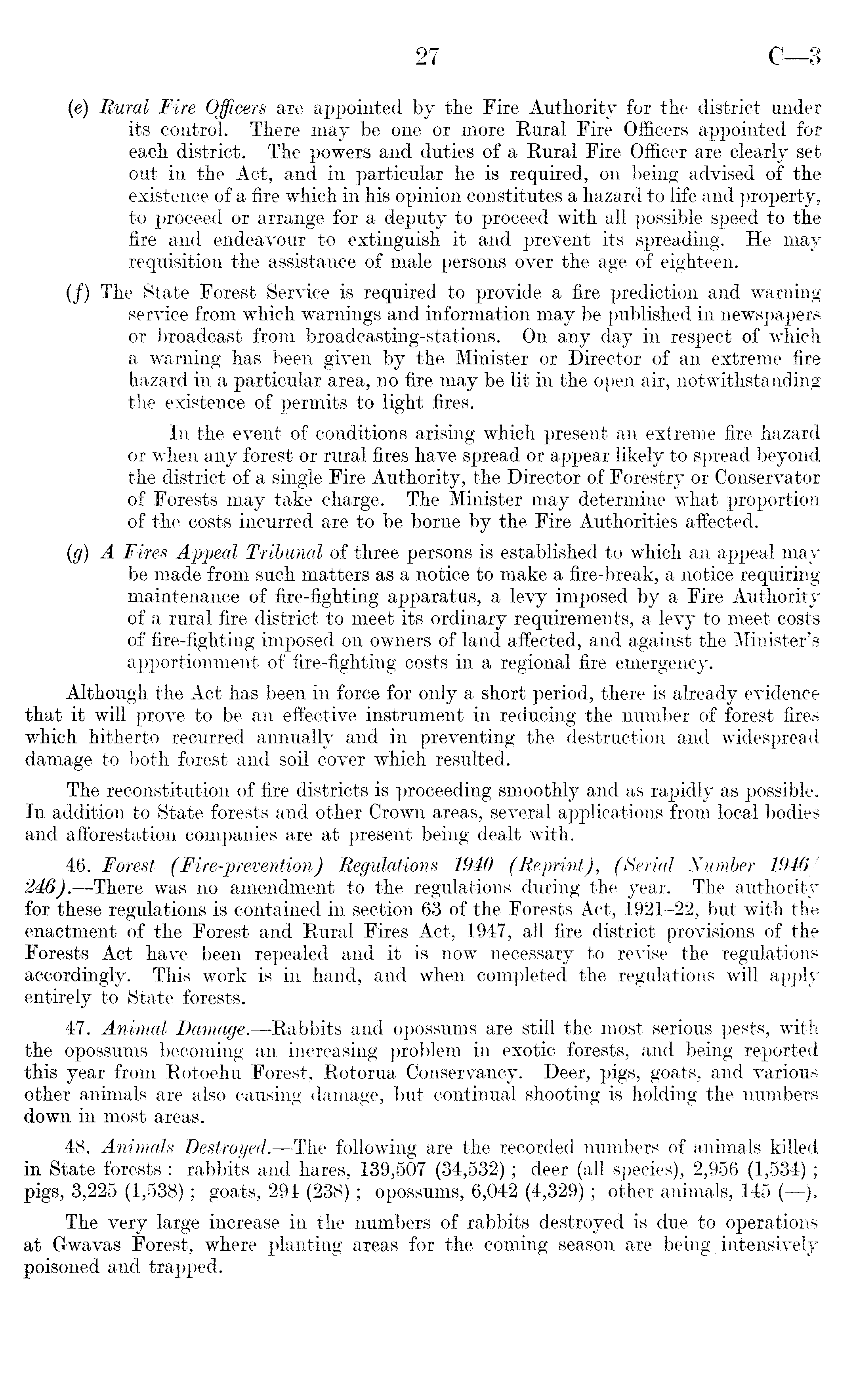 (e) Rural Fire Officers are appointed by the Fire Authority for the district under its control. There may be one or more Rural Fire Officers appointed for each district. The powers and duties of a Rural Fire Officer are clearly set out in the Act, and in particular he is required, on being advised of the existence of a fire which in his opinion constitutes a hazard to life and property, to proceed or arrange for a deputy to proceed with all possible speed to the fire and endeavour to extinguish it and prevent its spreading. He may requisition the assistance of male persons over the age of eighteen. (/) The State Forest Service is required to provide a fire prediction and warning service from which warnings and information may be published in newspapers or broadcast from broadcasting-stations. On any day in respect of which a warning has been given by the Minister or Director of an extreme fire hazard in a particular area, no fire may be lit in the open air, notwithstanding the existence of permits to light fires. In the event of conditions arising which present an extreme fire hazard or when any forest or rural fires have spread or appear likely to spread beyond the district of a single Fire Authority, the Director of Forestry or Conservator of Forests may take charge. The Minister may determine what proportion of the costs incurred are to be borne by the Fire Authorities affected. (g) A Fires Appeal Tribunal of three persons is established to which an appeal may be made from such matters as a notice to make a fire-break, a notice requiring maintenance of fire-fighting apparatus, a levy imposed by a Fire Authority of a rural fire district to meet its ordinary requirements, a levy to meet costs of fire-fighting imposed on owners of land affected, and against the Minister's apportionment of fire-fighting costs in a regional fire emergency. Although the Act has been in force for only a short period, there is already evidence that it will prove to be an effective instrument in reducing the number of forest fires which hitherto recurred annually and in preventing the destruction and widespread damage to both forest and soil cover which resulted. The reconstitution of fire districts is proceeding smoothly and as rapidly as possible. In addition to State forests and other Crown areas, several applications from local bodies and afforestation companies are at present being dealt with. 46. Forest (Fire-prevention) Regulations 1940 (Reprint), (Serial Number 1946/ 246). —There was no amendment to the regulations during the year. The authority for these regulations is contained in section 63 of the Forests Act, 1921-22, but with the enactment of the Forest and Rural Fires Act, 1947, all fire district provisions of the Forests Act have been repealed and it is now necessary to revise the regulations accordingly. This work is in hand, and when completed the regulations will apply entirely to State forests. 47. Animal Damage.—Rabbits and opossums are still the most serious pests, with the opossums becoming an increasing problem in exotic forests, and being reported this year from Rotoehu Forest, Rotorua Conservancy. Deer, pigs, goats, and various other animals are also causing damage, but continual shooting is holding the numbers down in most areas. 48. Animals Destroyed. —The following are the recorded numbers of animals killed in State forests : rabbits and hares, 139,507 (34,532) ; deer (all species), 2,956 (1,534) ; pigs, 3,225 (1,538); goats, 294 (238); opossums, 6,042 (4,329); other animals, 145 ( —). The very large increase in the numbers of rabbits destroyed is due to operations at Grwavas Forest, where planting areas for the coming season are being intensively poisoned and trapped.