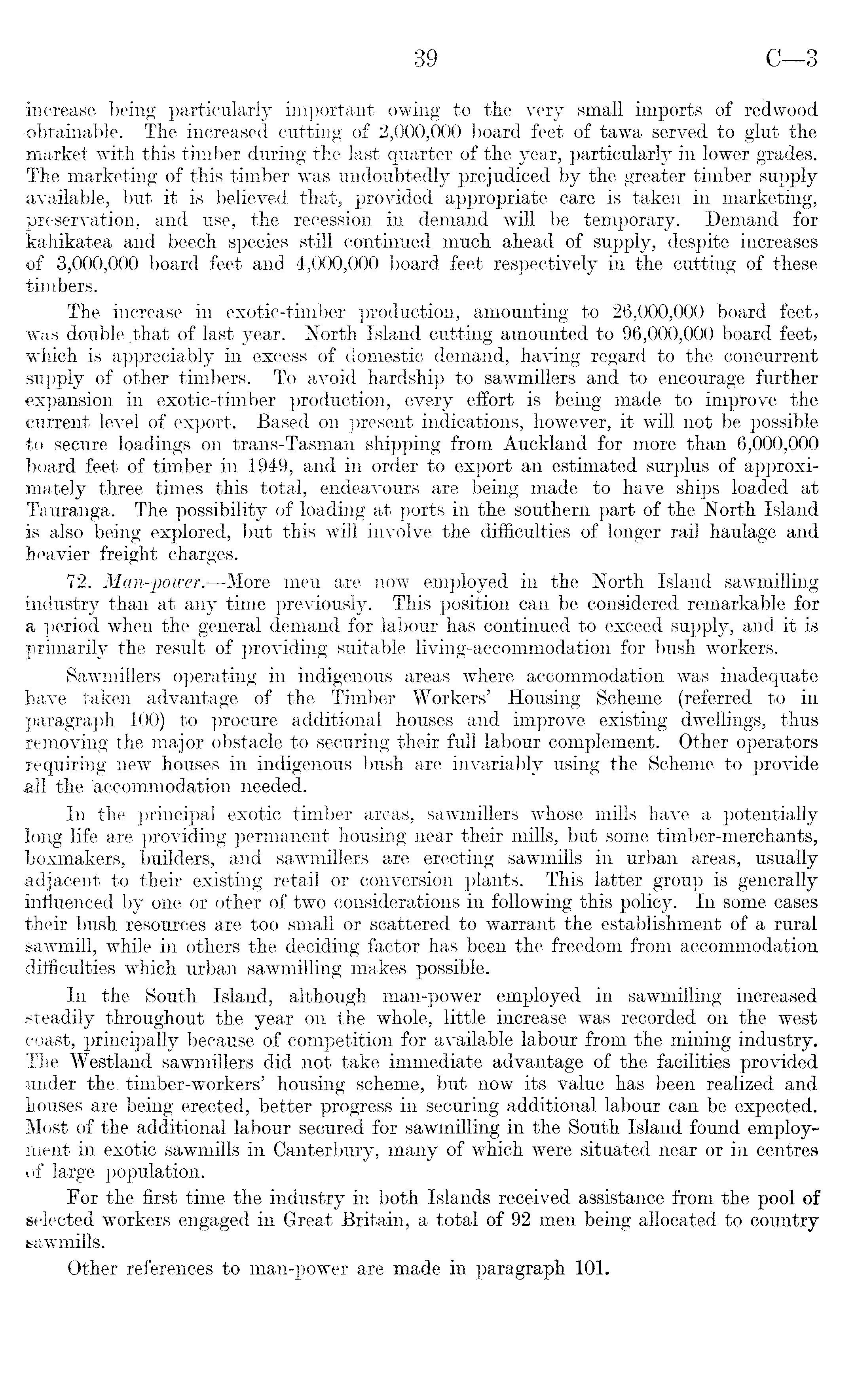 increase being particularly important owing to the very small imports of redwood obtainable. The increased cutting of 2,000,000 board feet of tawa served to glut the market with this timber during the last quarter of the year, particularly in lower grades. The marketing of this timber was undoubtedly prejudiced by the greater timber supply available, but it is believed that, provided appropriate care is taken in marketing, preservation, and use, the recession in demand will be temporary. Demand for kahikatea and beech species still continued much ahead of supply, despite increases of 3,000,000 board feet and 4,000,000 board feet respectively in the cutting of these timbers. The increase in exotic-timber production, amounting to 26,000,000 board feet, was double that of last year. North Island cutting amounted to 96,000,000 board feet, which is appreciably in excess of domestic demand, having regard to the concurrent supply of other timbers. To avoid hardship to sawmillers and to encourage further expansion in exotic-timber production, every effort is being made to improve the current level of export. Based on present indications, however, it will not be possible to secure loadings on trans-Tasman shipping from Auckland for more than 6,000,000 board feet of timber in 1949, and in order to export an estimated surplus of approximately three times this total, endeavours are being made to have ships loaded at Tauranga. The possibility of loading at ports in the southern part of the North Island is also being explored, but this will involve the difficulties of longer rail haulage and heavier freight charges. 72. Man-power.—More men are now employed in the North Island sawmilling industry than at any time previously. This position can be considered remarkable for a period when the general demand for labour has continued to exceed supply, and it is primarily the result of providing suitable living-accommodation for bush workers. Sawmillers operating in indigenous areas where accommodation was inadequate have taken advantage of the Timber Workers' Housing Scheme (referred to in paragraph 100) to procure additional houses and improve existing dwellings, thus removing the major obstacle to securing their full labour complement. Other operators requiring new houses in indigenous bush are invariably using the Scheme to provide all the accommodation needed. In the principal exotic timber areas, sawmillers whose mills have a potentially long life are providing permanent housing near their mills, but some timber-merchants, boxmakers, builders, and sawmillers are erecting sawmills in urban areas, usually adjacent to their existing retail or conversion plants. This latter group is generally influenced by one or other of two considerations in following this policy. In some cases their bush resources are too small or scattered to warrant the establishment of a rural sawmill, while in others the deciding factor has been the freedom from accommodation difficulties which urban sawmilling makes possible. In the South Island, although man-power employed in sawmilling increased steadily throughout the year on the whole, little increase was recorded on the west coast, principally because of competition for available labour from the mining industry. The Westland sawmillers did not take immediate advantage of the facilities provided under the. timber-workers' housing scheme, but now its value has been realized and houses are being erected, better progress in securing additional labour can be expected. Most of the additional labour secured for sawmilling in the South Island found employment in exotic sawmills in Canterbury, many of which were situated near or in centres of large population. For the first time the industry in both Islands received assistance from the pool of selected workers engaged in Great Britain, a total of 92 men being allocated to country sawmills. Other references to man-power are made in paragraph 101.