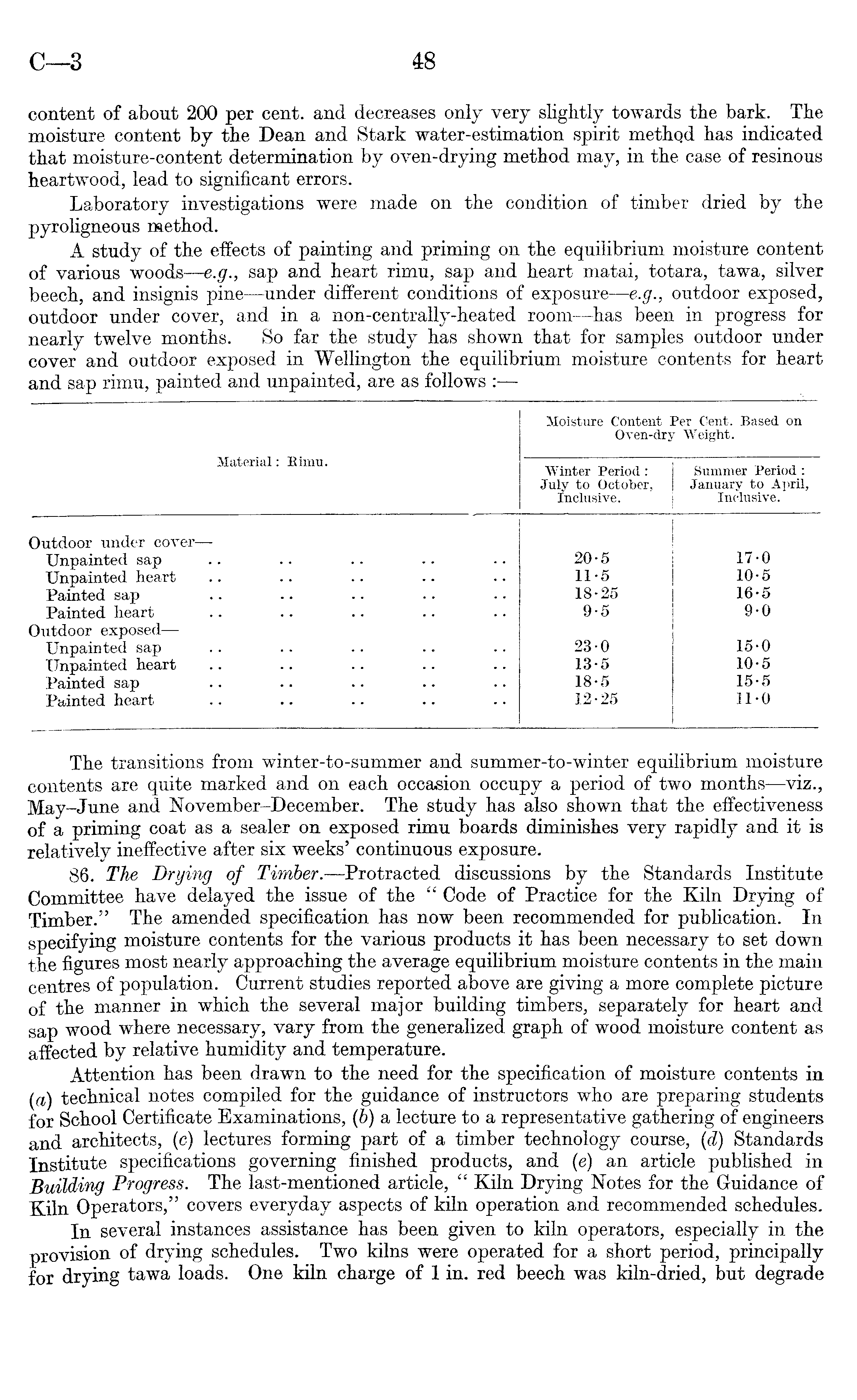 content of about 200 per cent, and decreases only very slightly towards the bark. The moisture content by the Dean and Stark water-estimation spirit method has indicated that moisture-content determination by oven-drying method may, in the case of resinous heartwood, lead to significant errors. Laboratory investigations were made on the condition of timber dried by the pyroligneous method. A study of the effects of painting and priming on the equilibrium moisture content of various woods —e.g., sap and heart rimu, sap and heart matai, totara, tawa, silver beech, and insignis pine—under different conditions of exposure —e.g., outdoor exposed, outdoor under cover, and in a non-centrally-heated room —has been in progress for nearly twelve months. So far the study has shown that for samples outdoor under cover and outdoor exposed in Wellington the equilibrium moisture contents for heart and sap rimu, painted and unpainted, are as follows :