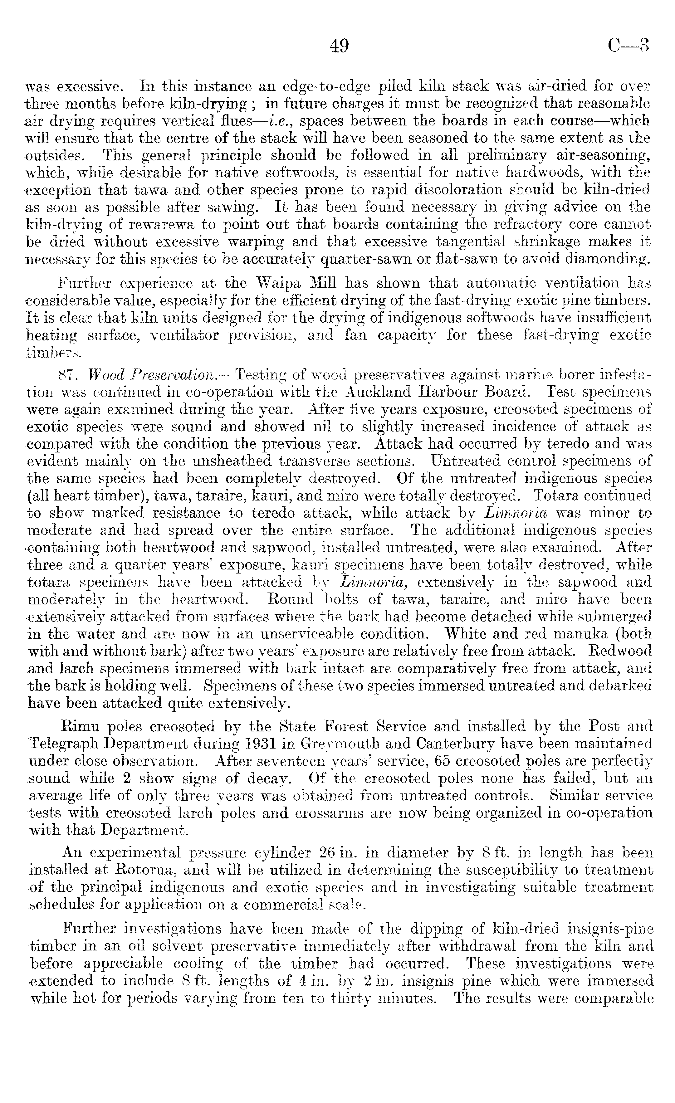 was excessive. In this instance an edge-to-edge piled kiln stack was air-dried for over three months before kiln-drying ; in future charges it must be recognized that reasonable air drying requires vertical flues —i.e., spaces between the boards in each course—which will ensure that the centre of the stack will have been seasoned to the same extent as the ■outsides. This general principle should be followed in all preliminary air-seasoning, which, while desirable for native softwoods, is essential for native hardwoods, with the •exception that tawa and other species prone to rapid discoloration should be kiln-dried .as soon as possible after sawing. It has been found necessary in giving advice on the kiln-drying of rewarewa to point out that boards containing the refractory core cannot be dried without excessive warping and that excessive tangential shrinkage makes it necessary for this species to be accurately quarter-sawn or flat-sawn to avoid diamonding. Further experience at the Waipa Mill has shown that automatic ventilation has considerable value, especially for the efficient drying of the fast-drying exotic pine timbers. It is clear that kiln units designed for the drying of indigenous softwoods have insufficient heating surface, ventilator provision, and fan capacity for these fast-drying exotic timbers. 87. Wood Preservation. —Testing of wood preservatives against marine borer infestation was continued in co-operation with the Auckland Harbour Board. Test specimens were again examined during the year. After five years exposure, creosoted specimens of exotic species were sound and showed nil to slightly increased incidence of attack as compared with the condition the previous year. Attack had occurred by teredo and was evident mainly on the unsheathed transverse sections. Untreated control specimens of the same species had been completely destroyed. Of the untreated indigenous species (all heart timber), tawa, taraire, kauri, and miro were totally destroyed. Totara continued to show marked resistance to teredo attack, while attack by Limnoria was minor to moderate and had spread over the entire surface. The additional indigenous species containing both heartwood and sapwood, installed untreated, were also examined. After three and a quarter years' exposure, kauri specimens have been totally destroyed, while -totara specimens have been attacked by Limnoria, extensively in the sapwood and moderately in the heartwood. Round bolts of tawa, taraire, and miro have been ■extensively attacked from surfaces where the bark had become detached while submerged in the water and are now in an unserviceable condition. White and red manuka (both with and without bark) after two years' exposure are relatively free from attack. Redwood and larch specimens immersed with bark intact are comparatively free from attack, and the bark is holding well. Specimens of these two species immersed untreated and debarked have been attacked quite extensively. Rimu poles creosoted by the State Forest Service and installed by the Post and Telegraph Department during 1931 in Grevmouth and Canterbury have been maintained under close observation. After seventeen years' service, 65 creosoted poles are perfectly sound while 2 show signs of decay. Of the creosoted poles none has failed, but an average life of only three years was obtained from untreated controls. Similar service tests with creosoted larch poles and crossarms are now being organized in co-operation with that Department. An experimental pressure cylinder 26 in. in diameter by 8 ft. in length has been installed at Rotorua, and will be utilized in determining the susceptibility to treatment of the principal indigenous and exotic species and in investigating suitable treatment schedules for application on a commercial scale. Further investigations have been made of the dipping of kiln-dried insignis-pine timber in an oil solvent preservative immediately after withdrawal from the kiln and before appreciable cooling of the timber had occurred. These investigations were extended to include 8 ft. lengths of 4 in. by 2 in. insignis pine which were immersed while hot for periods varying from ten to thirty minutes. The results were comparable