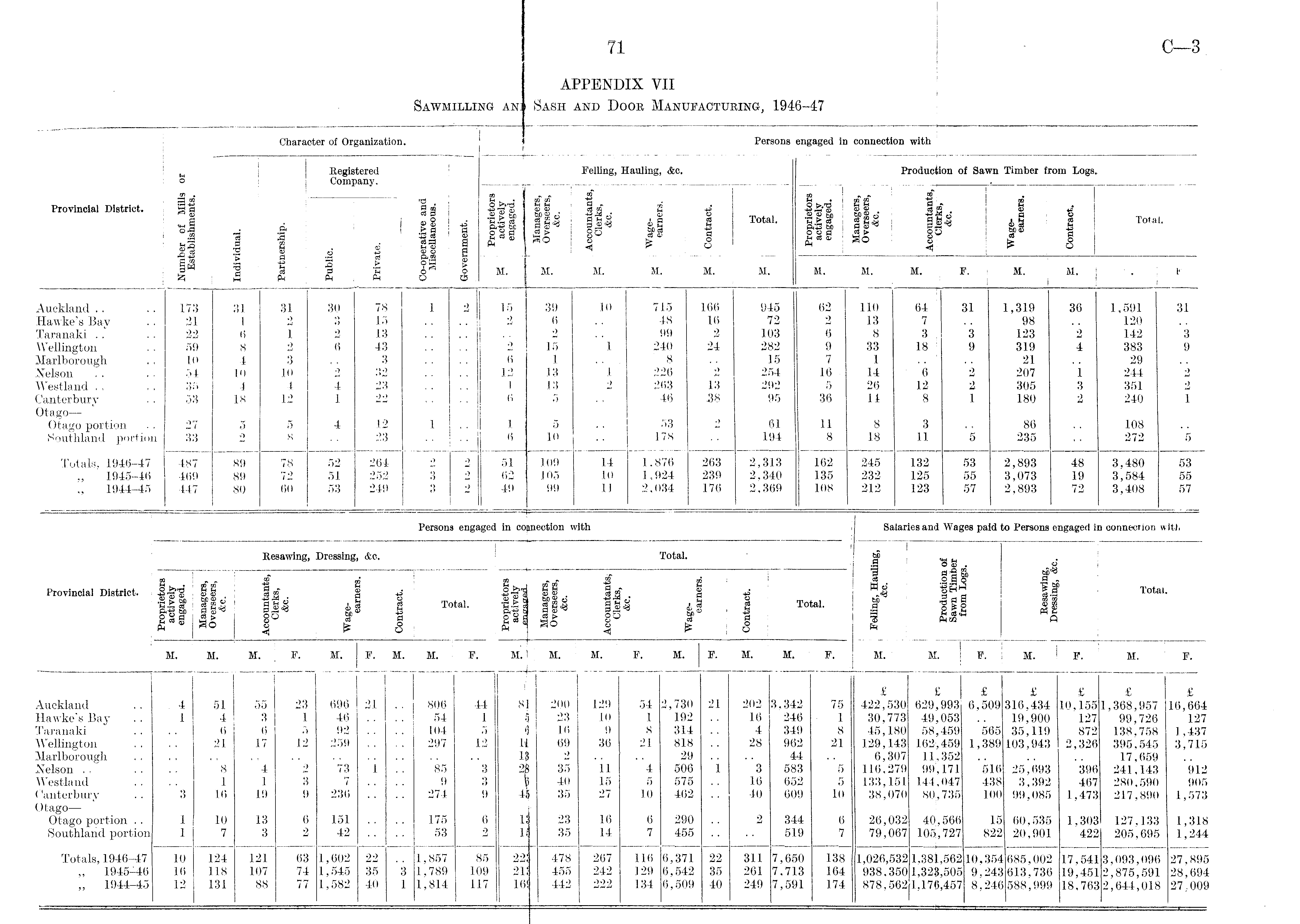 Character of Organization. 1 Persons engaged in connection with U* O Registered Company. 1 Felling, Hauling, &c. Produc ion of Sawn Timber from Logs. W «T a . ■S&'g .2 S? 60 y.tS 03 0 0 fl M CS <3j P-i m Provincial District. 3 GO £3 4-> -1 ° m feS al C to §a c8 53 ■d .£* 2 cn M 03 8 2 £ 3 TO 03S H <D CD o a (D a p o .s|a c8 PM to co S>8 o c$ > So a * 3,2 • a tn ° 30 0 ■«( CO M © 5 OS C £ 4^ Q 1 a 0 0 Total. GO ss a SP® 0 So S3. 8 ( 0 32 3 £ a 18 boc a! £ § ! 0 Total. > ■d —i a 1 P4 3 P * ! > 'C Ph g*.a is 0 o © > o © M. M. M. M. M. M. M. M. M. F. I M. M. • K Auckland Hawke's Bay Taranaki Wellington Marlborough Nelson Westland Canterbury Otago— Otago portion Southland portion 173 21 22 59 10 54 35 53 27 33 31 1 6 8 4 10 4 18 5 2 31 9 1 o 3 10 4 12 5 8 30 <) 0 2 6 2 4 1 4 78 15 13 43 3 32 23 22 12 23 1 1 2 15 2 2 ' 6 12 1 6 1 (5 39 6 2 15 1 13 13 5 5 10 10 1 1 9 Li 715 48 99 240 8 226 263 46 53 178 166 16 2 24 0 13 .38 0 945 72 103 282 15 254 292 95 61 194 62 9 J-J 6 9 7 16 5 36 11 8 110 13 8 33 1 14 26 14 8 18 64 7 3 18 6 12 8 3 11 31 3 9 2 2 1 5 1,319 98 123 319 21 207 305 180 86 235 36 2 4 1 3 2 1,591 120 142 383 29 244 351 240 108 272 31 3 9 9 2 1 5 Totals, 1946-47 1945-46 1944-45 487 469 447 89 89 80 78 72 60 52 51 53 264 252 249 *> 3 3 2 2 2 51 62 49 109 J 05 99 14 10 11 1,876 1,924 2,034 263 239 176 2,313 2,340 2,369 162 135 108 245 232 212 132 125 123 53 55 57 2,893 3,073 2,893 48 19 72 3,480 3,584 3,408 53 55 57 Persons engj iged in co nection with j Salaries and Wages paid to Persons engaged in connection with Resawing, Dressing, &c. Total. j do .9 tj O <P O Provincial District. a M-K C8 eg O) <D be So CD h ■+3 rid • 8° < i &C d * 3 D 3 +3 0 1 6 Total. to O 111 ft-g t 88 { PM a" a" a? 5P® 6 a > So CO li 0 - 8° 0 m M O 1 0 1 a 0 0 Total. i w j a 1 n 5 g s 0 g m as <a Phm PI - sl Si o Total. M. M. M F. m. F. M. M. 1 F. M. M. M. F. M. F. M. M. F. M. M F. M. F. I M. F. Auckland Hawke's Bay Taranaki Wellington Marlborough Nelson Westland Canterbury Otago — Otago portion . . Southland portion . 4 1 3 1 1 51 4 6 21 8 1 16 10 7 55 3 6 17 4 1 19 13 3 23 1 5 12 2 3 9 6 2 696 46 92 259 73 7 236 151 42 21 806 54 104 297 85 9 274 175 53 44 1 5 12 3 3 9 6 2 1 8 j 13 2i u 1! 1! 200 23 16 69 2 35 40 35 23 35 129 10 9 36 11 15 27 16 14 54 1 8 21 ' 4 5 10 6 7 2,730 192 314 818 29 506 575 462 290 455 21 202 16 4 28 3 16 40 2 3,342 246 349 962 44 583 652 609 344 519 75 1 8 21 5 5 10 6 7 £ 422,530 30,773 45,180 129,143 6,307 116,279 133,151 38,070 26,032 79,067 £ 629,993 49 053 58,459 162,459 111 352 991,171 144,047 80,735 40,566 10^,727 | £ 6,509 565 1,389 516 438 100 15 822 £ 316,434 19.900 35,119 103,943 . 25,693 3,392 99,085 60,535 20.901 £ 10,155 127 872 2,326 396 467 1,473 1,303 422 £ 1,368,957 99,726 138,758 395,545 17,659 241,143 280,590 217,890 127,133 205,695 £ 16,664 127 1,437 3,715 '912 905 1,573 1,318 1,244 Totals, 1946-47 „ 1945-46 „ 1944-45 10 16 12 124 118 131 121 107 88 63 74 77 1,602 1,545 1,582 22 35 40 3 1 1,857 1,789 1,814 85 109 117 22: 211 16) 478 455 442 267 242 222 116 129 134 6,371 6,542 6,509 22 35 40 311 261 249 7,650 7,713 7,591 138 164 174 1,026,532 938,350 878,562 1,381,562 1,32$,505 1,176,457 10,354 9,243 8,246 685,002 613,736 588,999 17,541 19,451 18,76c 3,093,096 2,875,591 (2,644,018 27,895 28,694 27.009