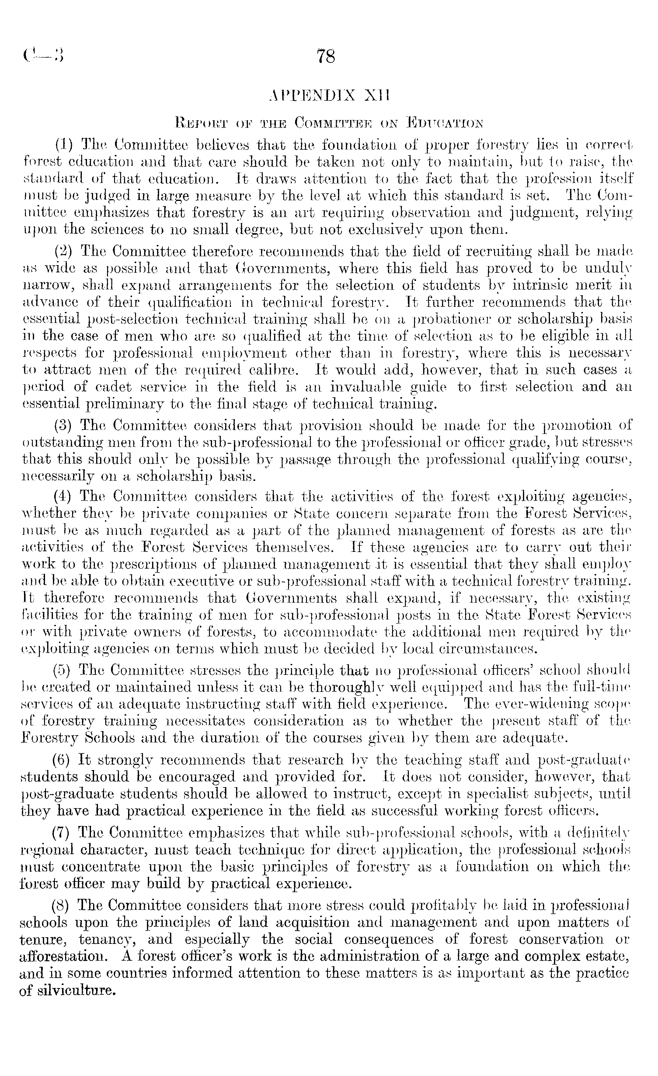 APPENDIX XII Report op the Committee on Education (1) The Committee believes that the foundation of proper forestry lies in correct forest education and that care should be taken not only to maintain, but to raise, the standard of that education. It draws attention to the fact that the profession itself must be judged in large measure by the level at which this standard is set. The Committee emphasizes that forestry is an art requiring observation and judgment, relying upon the sciences to no small degree, but not exclusively upon them. (2) The Committee therefore recommends that the field of recruiting shall be made as wide as possible and that Governments, where this field has proved to be unduly narrow, shall expand arrangements for the selection of students by intrinsic merit in advance of their qualification in technical forestry. It further recommends that the essential post-selection technical training shall be 011 a probationer or scholarship basis in the case of men who are so qualified at the time of selection as to be eligible in all respects for professional employment other than in forestry, where this is necessary to attract men of the required calibre. It would add, however, that in such cases a period of cadet service in the field is an invaluable guide to first selection and an essential preliminary to the final stage of technical training. (3) The Committee considers that provision should be made for the promotion of outstanding men from the sub-professional to the professional or officer grade, but stresses that this should only be possible by passage through the professional qualifying course, necessarily on a scholarship basis. (4) The Committee considers that the activities of the forest exploiting agencies, whether they be private companies or State concern separate from the Forest Services, must be as much regarded as a part of the planned management of forests as are the activities of the Forest Services themselves. If these agencies are to carry out their work to the prescriptions of planned management it is essential that they shall employ and be able to obtain executive or sub-professional staff with a technical forestry training. It therefore recommends that Governments shall expand, if necessary, the existing facilities for the training of men for sub-professional posts in the State Forest Services or with private owners of forests, to accommodate the additional men required by the exploiting agencies on terms which must be decided by local circumstances. (5) The Committee stresses the principle that 110 professional officers' school should be created or maintained unless it can be thoroughly well equipped and has the full-time services of an adequate instructing staff with field experience. The ever-widening scope of forestry training necessitates consideration as to whether the present staff of the Forestry Schools and the duration of the courses given by them are adequate. (6) It strongly recommends that research by the teaching staff and post-graduate students should be encouraged and provided for. It does not consider, however, that post-graduate students should be allowed to instruct, except in specialist subjects, until they have had practical experience in the field as successful working forest officers. (7) The Committee emphasizes that while sub-professional schools, with a definitely regional character, must teach technique for direct application, the professional schools must concentrate upon the basic principles of forestry as a foundation on which the forest officer may build by practical experience. (8) The Committee considers that more stress could profitably be laid in professional schools upon the principles of land acquisition and management and upon matters of tenure, tenancy, and especially the social consequences of forest conservation or afforestation. A forest officer's work is the administration of a large and complex estate, and in some countries informed attention to these matters is as important as the practice of silviculture.