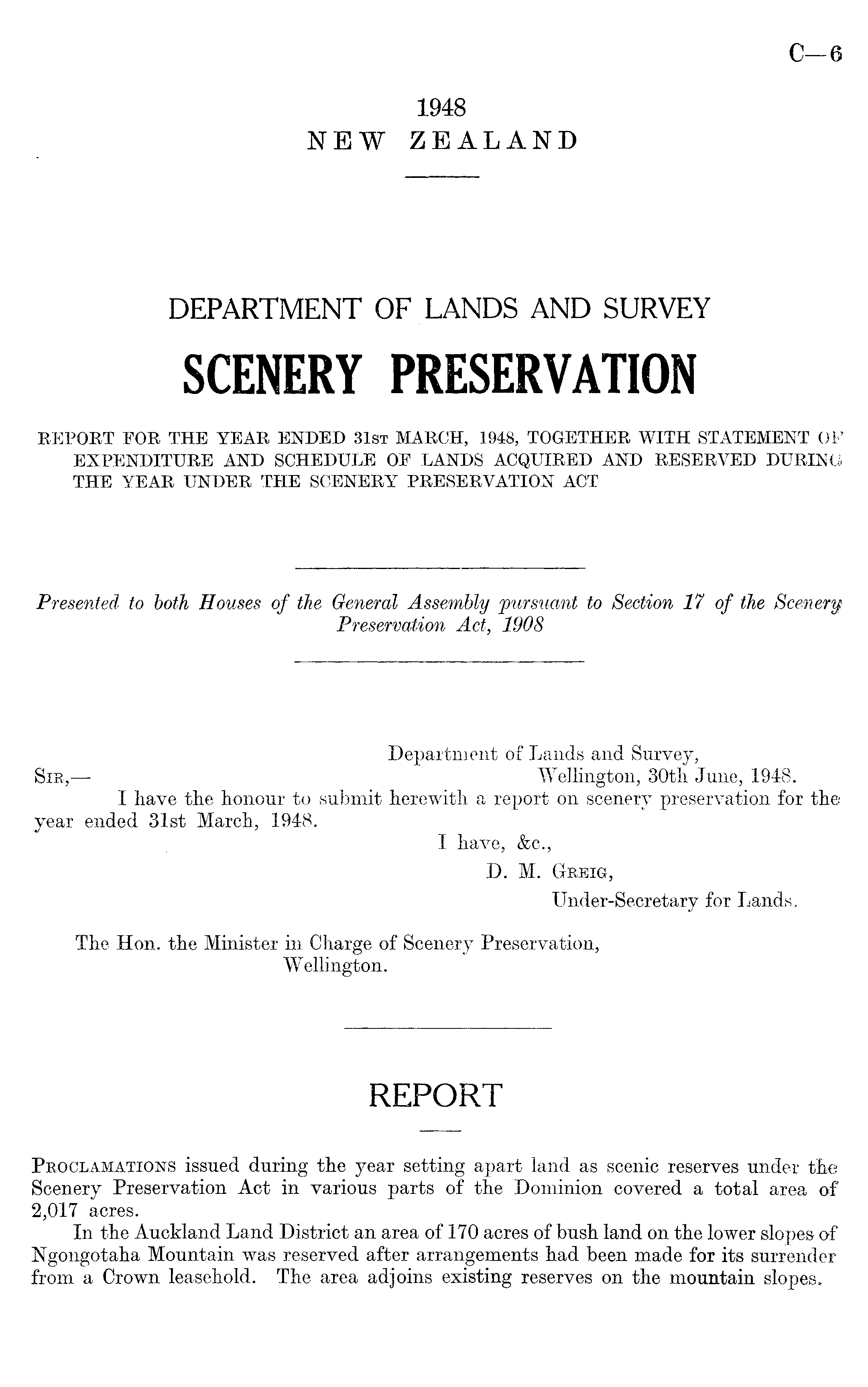 Department of Lands and Survey, Sir,— Wellington, 30th June, 1948. I have the honour to submit herewith a report on scenery preservation for the year ended 31st March, 1948. I have, &c, D. M. Greig, Under-Secretary for Lands. The Hon. the Minister in Charge of Scenery Preservation, Wellington.