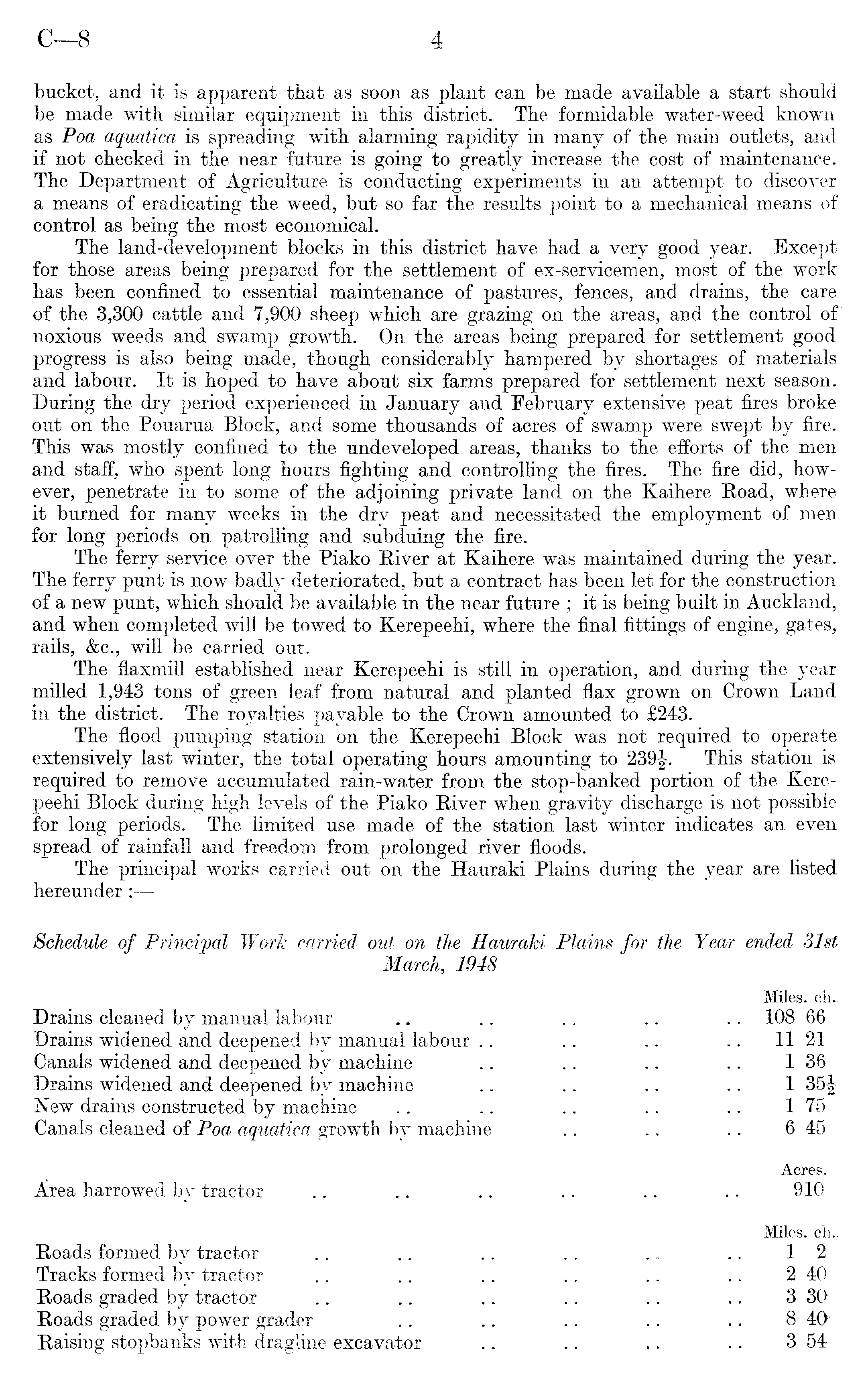 bucket, and it is apparent that as soon as plant can be made available a start should be made with similar equipment in this district. The formidable water-weed known as Poa aquatica is spreading with alarming rapidity in many of the main outlets, and if not checked in the near future is going to greatly increase the cost of maintenance. The Department of Agriculture is conducting experiments in an attempt to discover a means of eradicating the weed, but so far the results point to a mechanical means of control as being the most economical. The land-development blocks in this district have had a very good year. Except for those areas being prepared for the settlement of ex-servicemen, most of the work has been confined to essential maintenance of pastures, fences, and drains, the care of the 3,300 cattle and 7,900 sheep which are grazing on the areas, and the control of noxious weeds and swamp growth. On the areas being prepared for settlement good progress is also being made, though considerably hampered by shortages of materials and labour. It is hoped to have about six farms prepared for settlement next season. During the dry period experienced in January and February extensive peat fires broke out on the Pouarua Block, and some thousands of acres of swamp were swept by fire. This was mostly confined to the undeveloped areas, thanks to the efforts of the men and staff, who spent long hours fighting and controlling the fires. The fire did, however, penetrate in to some of the adjoining private land on the Kaihere Road, where it burned for many weeks in the dry peat and necessitated the employment of men for long periods on patrolling and subduing the fire. The ferry service over the Piako River at Kaihere was maintained during the year.. The ferry punt is now badly deteriorated, but a contract has been let for the construction of a new punt, which should be available in the near future ; it is being built in Auckland,, and when completed will be towed to Kerepeehi, where the final fittings of engine, gates,, rails, &c., will be carried out. The flaxmill established near Kerepeehi is still in operation, and during the year milled 1,943 tons of green leaf from natural and planted flax grown on Crown Land in the district. The royalties payable to the Crown amounted to £243. The flood pumping station on the Kerepeehi Block was not required to operate extensively last winter, the total operating hours amounting to 239|. This station is required to remove accumulated rain-water from the stop-banked portion of the Kerepeehi Block during high levels of the Piako River when gravity discharge is not possible for long periods. The limited use made of the station last winter indicates an even spread of rainfall and freedom from prolonged river floods. The principal works carried out on the Hauraki Plains during the year are listed hereunder: — Schedule of Principal Work carried out on the Hauraki Plains for the Year ended 31st March, 1948 Miles, oh.. Drains cleaned by manual labour .. .. .. .. .. 108 66 Drains widened and deepened by manual labour .. .. .. .. 1121 Canals widened and deepened by machine .. .. .. .. 1 36 Drains widened and deepened by machine .. .. .. .. 1 35^ New drains constructed by machine .. .. .. .. .. 175 Canals cleaned of Poa aquatica growth by machine .. .. .. 6 45 Acres. Area harrowed by tractor .. .. .. .. .. .. 910 Miles, ctu Roads formed by tractor .. .. .. .. .. .. 12 Tracks formed by tractor .. .. .. .. .. .. 2 40 Roads graded by tractor .. .. .. .. .. .. 3 30 Roads graded by power grader .. .. .. .. .. 8 40 Raising stopbanks with dragline excavator .. .. .. .. 3 54