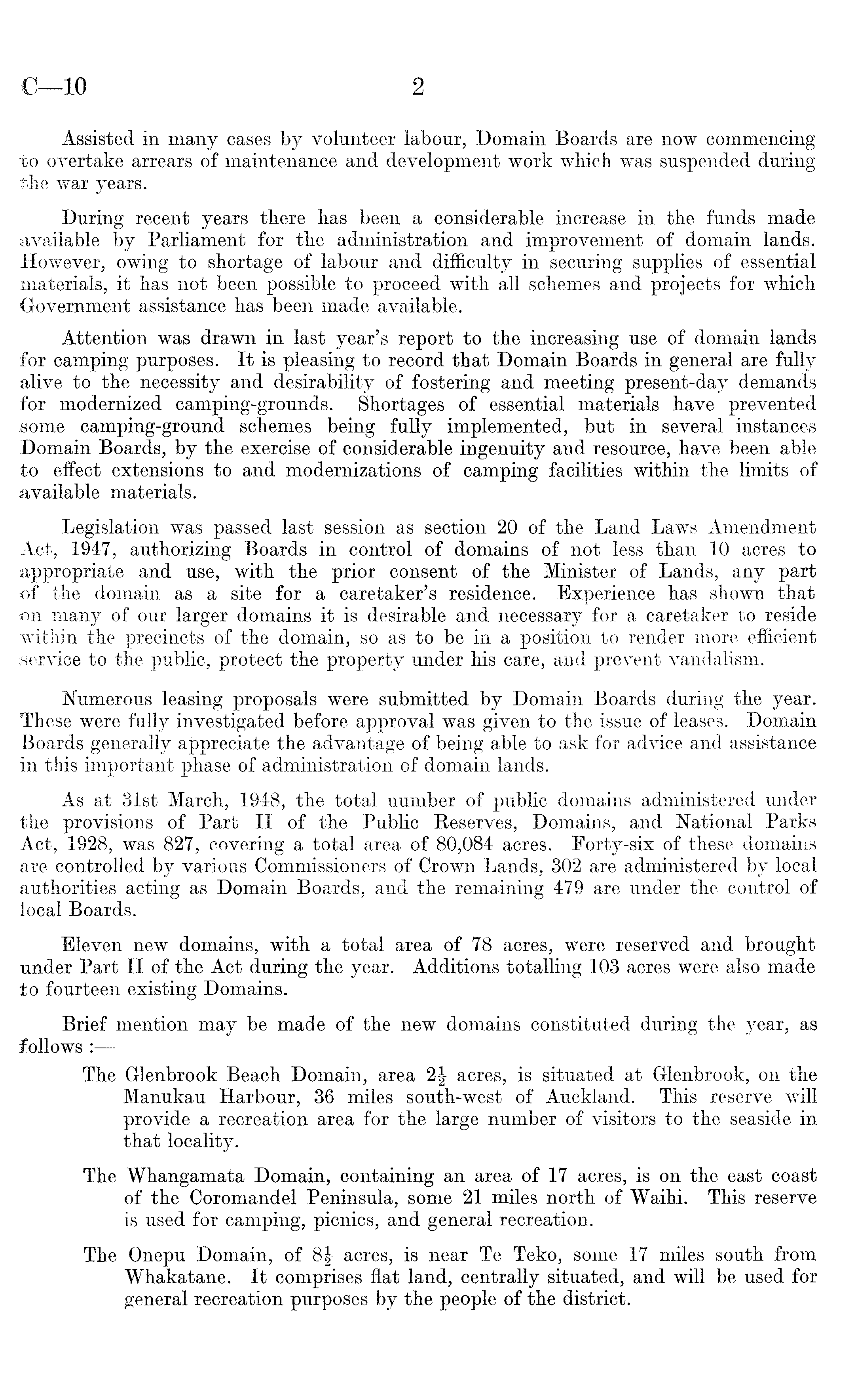Assisted in many cases by volunteer labour, Domain Boards are now commencing to overtake arrears of maintenance and development work which was suspended during the war years. During recent years there has been a considerable increase in the funds made available by Parliament for the administration and improvement of domain lands. However, owing to shortage of labour and difficulty in securing supplies of essential materials, it has not been possible to proceed with all schemes and projects for which Government assistance has been made available. Attention was drawn in last year's report to the increasing use of domain lands for camping purposes. It is pleasing to record that Domain Boards in general are fully alive to the necessity and desirability of fostering and meeting present-day demands for modernized camping-grounds. Shortages of essential materials have prevented some camping-ground schemes being fully implemented, but in several instances Domain Boards, by the exercise of considerable ingenuity and resource, have been able to effect extensions to and modernizations of camping facilities within the limits of available materials. Legislation, was passed last session as section 20 of the Land Laws Amendment Act, 1947, authorizing Boards in control of domains of not less than 10 acres to appropriate and use, with the prior consent of the Minister of Lands, any part of the domain as a site for a caretaker's residence. Experience has shown that on many of our larger domains it is desirable and necessary for a caretaker to reside within the precincts of the domain, so as to be in a position to render more efficient service to the public, protect the property under his care, and prevent vandalism. Numerous leasing proposals were submitted by Domain Boards during the year. These were fully investigated before approval was given to the issue of leases. Domain Boards generally appreciate the advantage of being able to ask for advice, and assistance in this important phase of administration of domain lands. As at 31st March, 1948, the total number of public domains administered under the provisions of Part II of the Public Reserves, Domains, and National Parks Act, 1928, was 827, covering a total area of 80,084 acres. Forty-six of these domains are controlled by various Commissioners of Crown Lands, 302 are administered by local authorities acting as Domain Boards, and the remaining 479 are under the control of local Boards. Eleven new domains, with a total area of 78 acres, were reserved and brought under Part II of the Act during the year. Additions totalling 103 acres were also made to fourteen existing Domains. Brief mention may be made of the new domains constituted during the year, as follows The Glenbrook Beach Domain, area 2J acres, is situated at Grlenbrook, on the Manukau Harbour, 36 miles south-west of Auckland. This reserve will provide a recreation area for the large number of visitors to the seaside in that locality. The Whangamata Domain, containing an area of 17 acres, is on the east coast of the Coromandel Peninsula, some 21 miles north of Waihi. This reserve is used for camping, picnics, and general recreation. The Onepu Domain, of 8|- acres, is near Te Teko, some 17 miles south from Whakatane. It comprises flat land, centrally situated, and will be used for general recreation purposes by the people of the district.