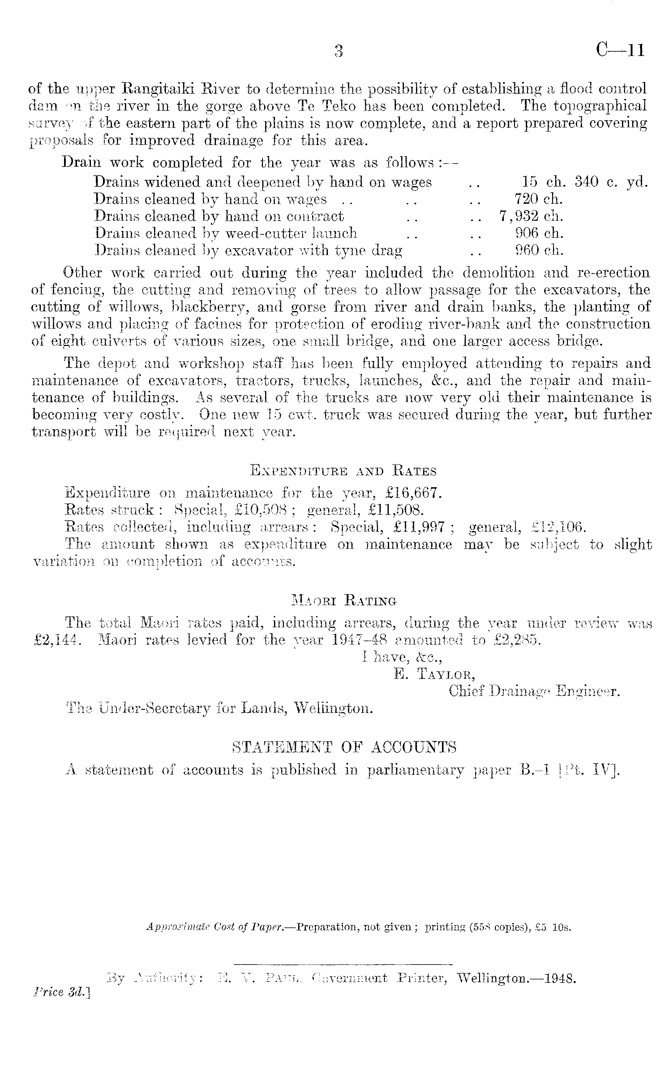 of the upper Rangitaiki River to determine the possibility of establishing a flood control dam on the river in the gorge above Te Teko has been completed. The topographical survey of the eastern part of the plains is now complete, and a report prepared covering proposals for improved drainage for this area. Drain work completed for the year was as follows : Drains widened and deepened by hand on wages .. 15 ch. 340 c. yd. Drains cleaned by hand on wages .. .. .. 720 ch. Drains cleaned by hand on contract .. .. 7,932 ch. Drains cleaned by weed-cutter launch .. .. 906 ch. Drains cleaned by excavator with tyne drag .. 960 ch. Other work carried out during the year included the demolition and re-erection of fencing, the cutting and removing of trees to allow passage for the excavators, the cutting of willows, blackberry, and gorse from river and drain banks, the planting of willows and placing of facines for protection of eroding river-bank and the construction of eight culverts of various sizes, one small bridge, and one larger access bridge. The depot and workshop staff has been fully employed attending to repairs and maintenance of excavators, tractors, trucks, launches, &c, and the repair and maintenance of buildings. As several of the trucks are now very old their maintenance is becoming very costly. One new 15 cwt. truck was secured during the year, but further transport will be required next year. Expenditure and Rates Expenditure on maintenance for the year, £16,667. Rates struck : Special, £10,508 ; general, £11,508. Rates collected, including arrears : Special, £11,997 ; general, £12,106. The amount shown as expenditure on maintenance may be subject to slight variation on completion of accounts. Maori Rating The total Maori rates paid, including arrears, during the year under review was £2,144. Maori rates levied for the year 1947-48 amounted to £2,285. I have, <fec, E. Taylor, Chief Drainage Engineer. The Under-Secretary for Lands, Wellington. STATEMENT OF ACCOUNTS A. statement of accounts is published in parliamentary paper 8.-l !.Pt. IV].