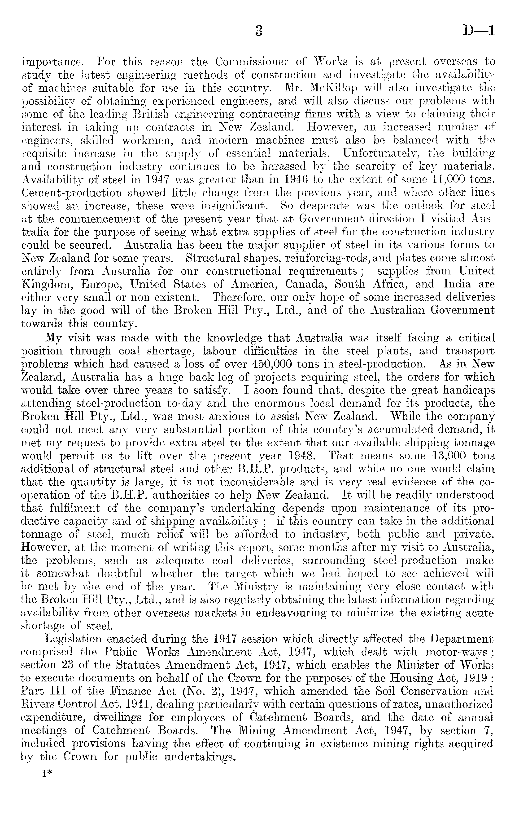 importance. For this reason the Commissioner of Works is at present overseas to study the latest engineering methods of construction and investigate the availability of machines suitable for use in this country. Mr. McKillop will also investigate the possibility of obtaining experienced engineers, and will also discuss our problems with some of the leading British engineering contracting firms with a view to claiming their interest in taking up contracts in New Zealand. However, an increased number of engineers, skilled workmen, and modern machines must also be balanced with the requisite increase in the supply of essential materials. Unfortunately, the building and construction industry continues to be harassed by the scarcity of key materials. Availability of steel in 1947 was greater than in 1946 to the extent of some 11,000 tons. Cement-production showed little change from the previous year, and where other lines showed an increase, these were insignificant. So desperate was the outlook for steel at the commencement of the present year that at Government direction I visited Australia for the purpose of seeing what extra supplies of steel for the construction industry could be secured. Australia has been the major supplier of steel in its various forms to New Zealand for some years. Structural shapes, reinforcing-rods, and plates come almost entirely from Australia for our constructional requirements ; supplies from United Kingdom, Europe, United States of America, Canada, South Africa, and India are either very small or non-existent. Therefore, our only hope of some increased deliveries lay in the good will of the Broken Hill Pty., Ltd., and of the Australian Government towards this country. My visit was made with the knowledge that Australia was itself facing a critical position through coal shortage, labour difficulties in the steel plants, and transport problems which had caused a loss of over 450,000 tons in steel-production. As in New Zealand, Australia has a huge back-log of projects requiring steel, the orders for which would take over three years to satisfy. I soon found that, despite the great handicaps attending steel-production to-day and the enormous local demand for its products, the Broken Hill Pty., Ltd., was most anxious to assist New Zealand. While the companycould not meet any very substantial portion of this country's accumulated demand, it met my request to provide extra steel to the extent that our available shipping tonnage would permit us to lift over the present year 1948. That means some -13,000 tons additional of structural steel and other B.H.P. products, and while no one would claim that the quantity is large, it is not inconsiderable and is very real evidence of the cooperation of the B.H.P. authorities to help New Zealand. It will be readily understood that fulfilment of the company's undertaking depends upon maintenance of its productive capacity and of shipping availability ; if this country can take in the additional tonnage of steel, much relief will be afforded to industry, both public and private. However, at the moment of writing this report, some months after my visit to Australia, the problems, such as adequate coal deliveries, surrounding steel-production make it somewhat doubtful whether the target which we had hoped to see achieved will be met by the end of the year. The Ministry is maintaining very close contact with the Broken Hill Pty., Ltd., and is also regularly obtaining the latest information regarding availability from other overseas markets in endeavouring to minimize the existing acute shortage of steel. Legislation enacted during the 1947 session which directly affected the Department comprised the Public Works Amendment Act, 1947, which dealt with motor-ways ; section 23 of the Statutes Amendment Act, 1947, which enables the Minister of Works to execute documents on behalf of the Crown for the purposes of the Housing Act, 1919 ; Part 111 of the Finance Act (No. 2), 1947, which amended the Soil Conservation and Rivers Control Act, 1941, dealing particularly with certain questions of rates, unauthorized expenditure, dwellings for employees of Catchment Boards, and the date of annual meetings of Catchment Boards. The Mining Amendment Act, 1947, by section 7, included provisions having the effect of continuing in existence mining rights acquired by the Crown for public undertakings. 1*