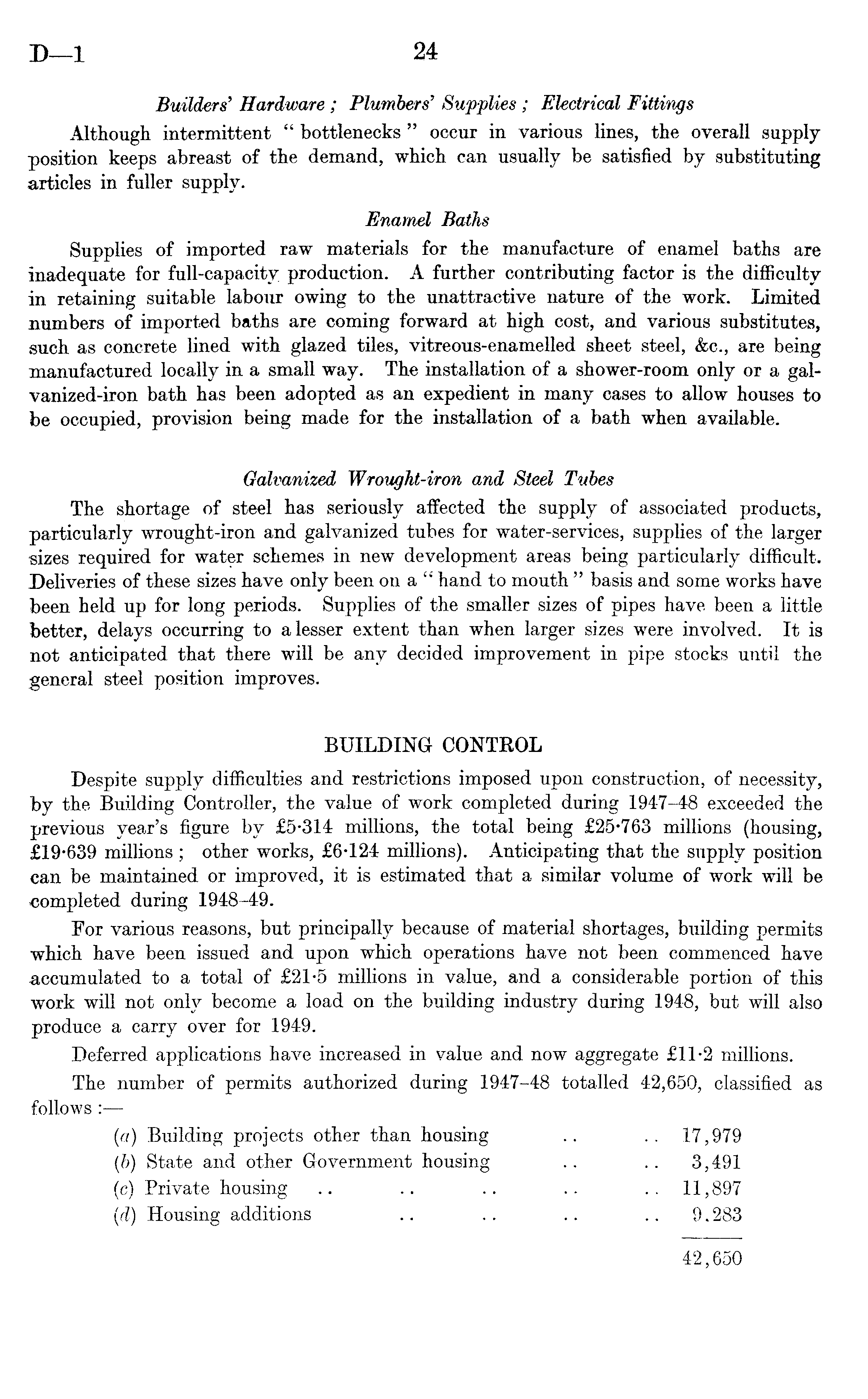 Builders' Hardware; Plumbers' Supplies; Electrical Fittings Although intermittent " bottlenecks " occur in various lines, the overall supply position keeps abreast of the demand, which can usually be satisfied by substituting articles in fuller supply. Enamel Baths Supplies of imported raw materials for the manufacture of enamel baths are inadequate for full-capacity production. A further contributing factor is the difficulty in retaining suitable labour owing to the unattractive nature of the work. Limited numbers of imported baths are coming forward at high cost, and various substitutes, such as concrete lined with glazed tiles, vitreous-enamelled sheet steel, &c., are being manufactured locally in a small way. The installation of a shower-room only or a gal-vanized-iron bath has been adopted as an expedient in many cases to allow houses to be occupied, provision being made for the installation of a bath when available. Galvanized Wrought-iron and Steel Tubes The shortage of steel has seriously affected the supply of associated products, particularly wrought-iron and galvanized tubes for water-services, supplies of the larger sizes required for water schemes in new development areas being particularly difficult. Deliveries of these sizes have only been 011 a " hand to mouth " basis and some works have been held up for long periods. Supplies of the smaller sizes of pipes have, been a little better, delays occurring to a lesser extent than when larger sizes were involved. It is not anticipated that there will be any decided improvement in pipe stocks until the general steel position improves. BUILDING CONTROL Despite supply difficulties and restrictions imposed upon construction, of necessity, by the Building Controller, the value of work completed during 1947-48 exceeded the previous year's figure by £5-314 millions, the total being £25*763 millions (housing, £l9-639 millions; other works, £6-124 millions). Anticipating that the supply position can be maintained or improved, it is estimated that a similar volume of work will be completed during 1948-49. For various reasons, but principally because of material shortages, building permits which have been issued and upon which operations have not been commenced have accumulated to a total of £2l-5 millions in value, and a considerable portion of this work will not only become a load on the building industry during 1948, but will also produce a carry over for 1949. Deferred applications have increased in value and now aggregate £ll-2 millions. The number of permits authorized during 1947-48 totalled 42,650, classified as follows :—• (a) Building projects other than housing .. .. 17,979 (b) State and other Government housing .. .. 3,491 (c) Private housing .. .. .. .. .. 11,897 (d) Housing additions .. .. .. .. 9,283 42,650